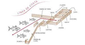 The almadraba is a traditional tuna fishing gear based on a fixed system of nets placed in areas where schools of fish pass through to lead them to an enclosure from which the catch is made.