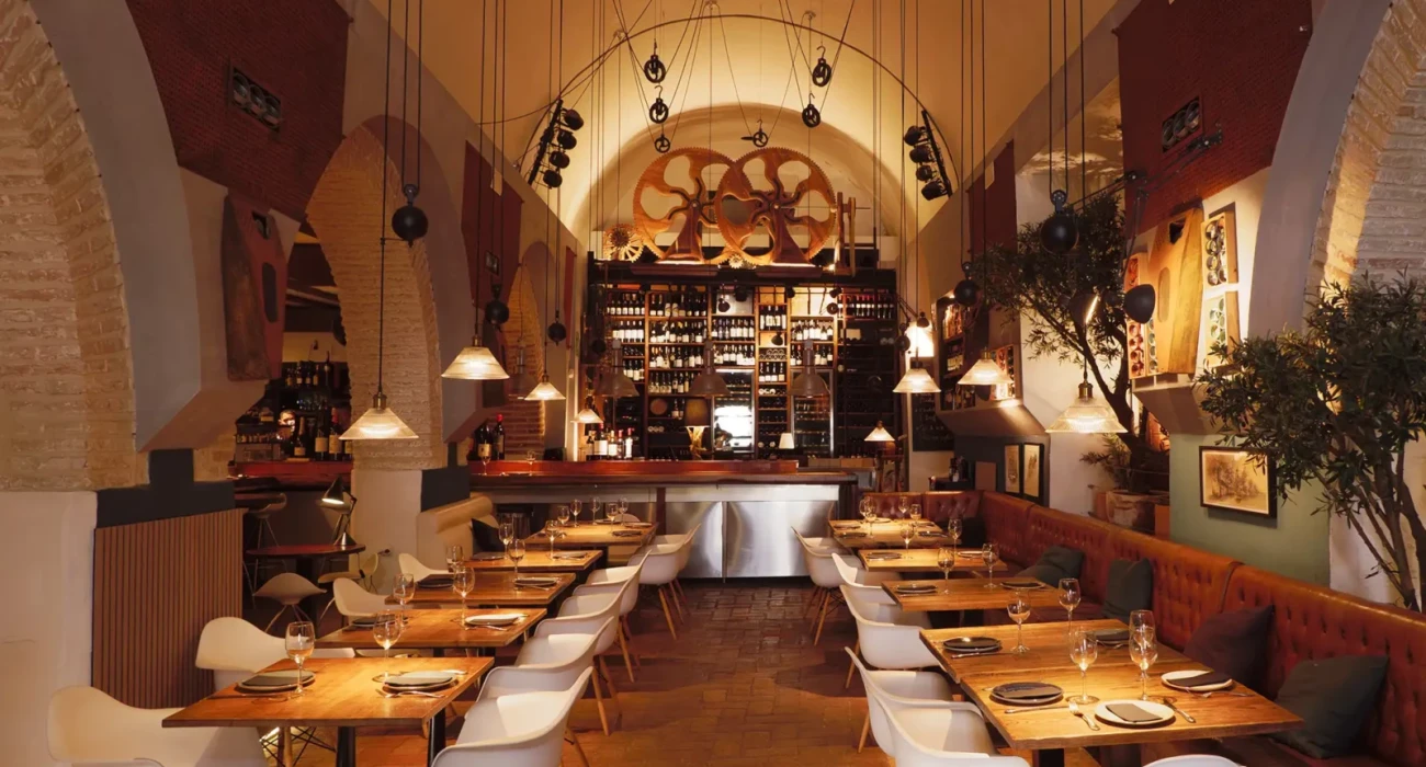 Restaurante Silos 19 en Tarifa – Interior elegante con decoración histórica y carta de vinos exclusiva.
