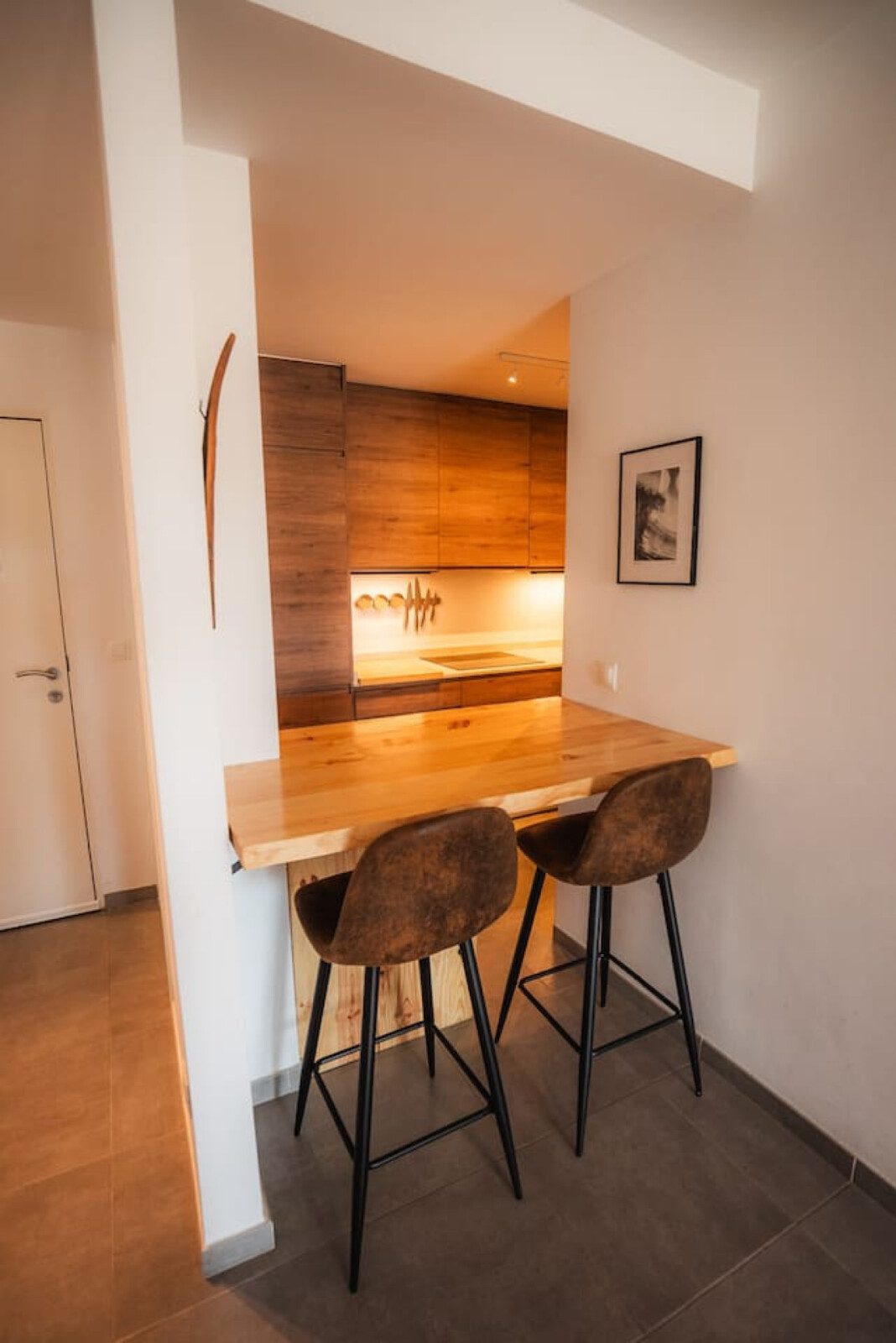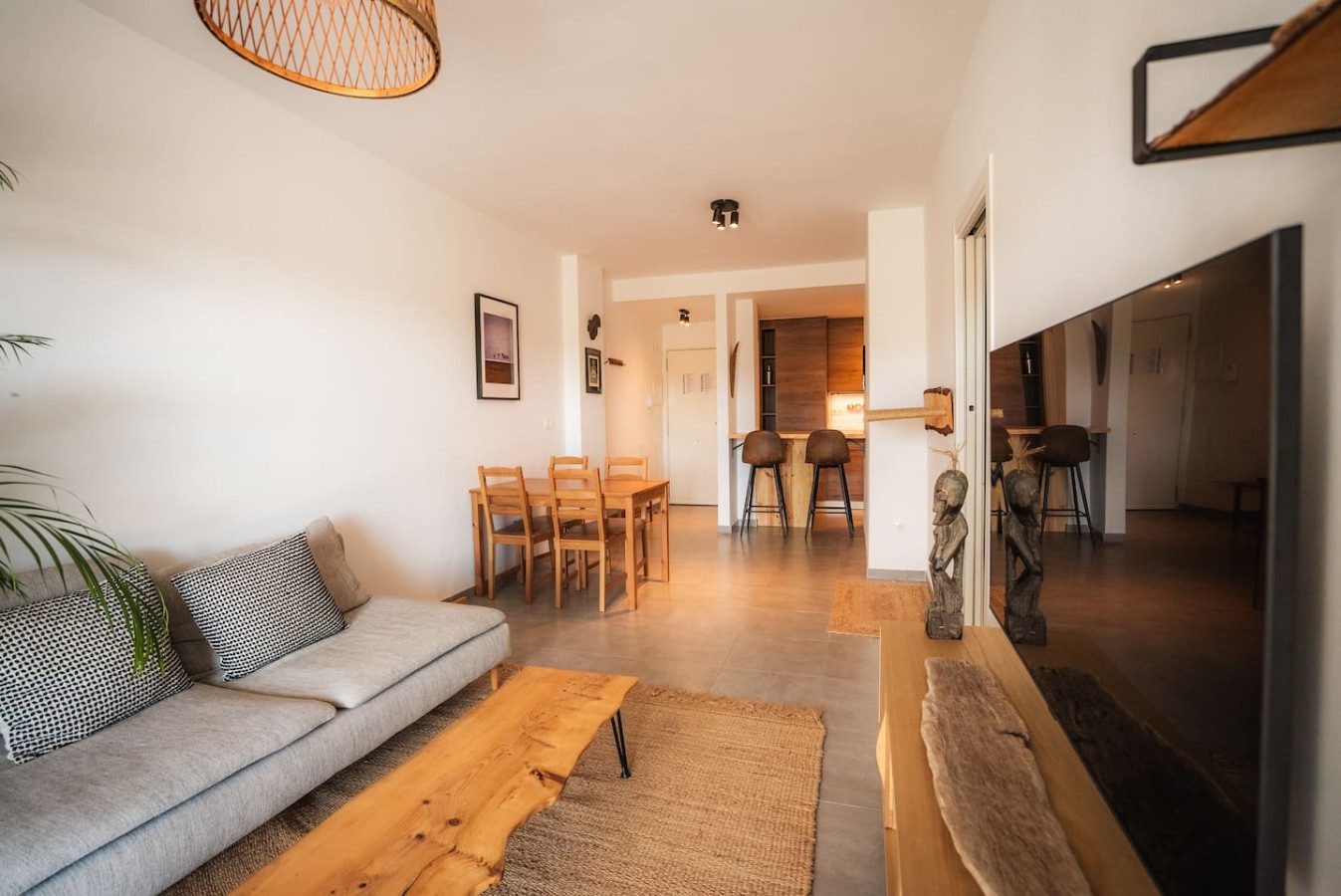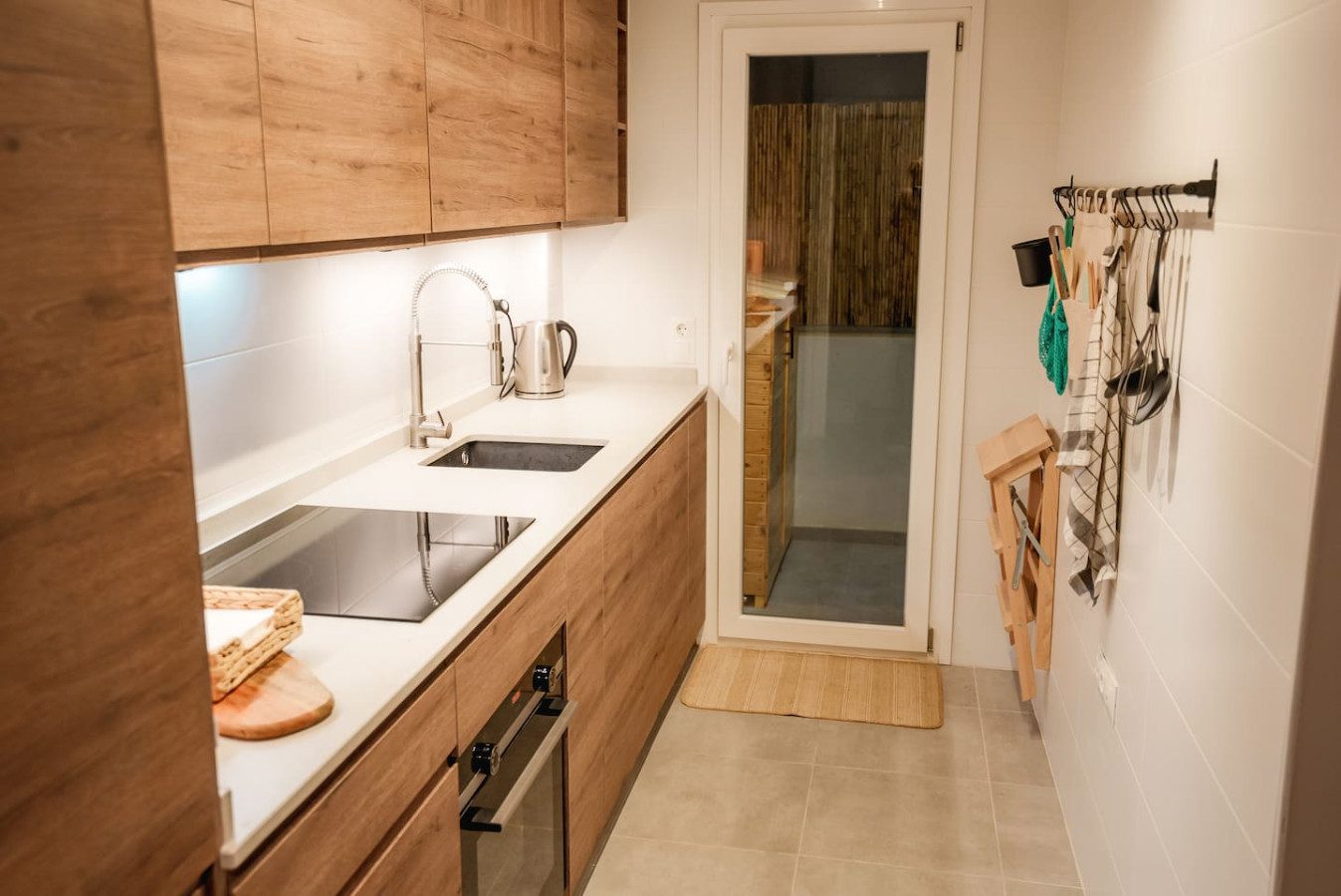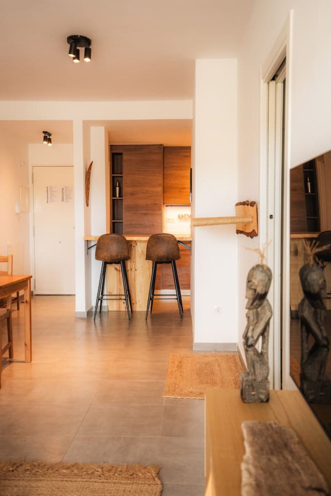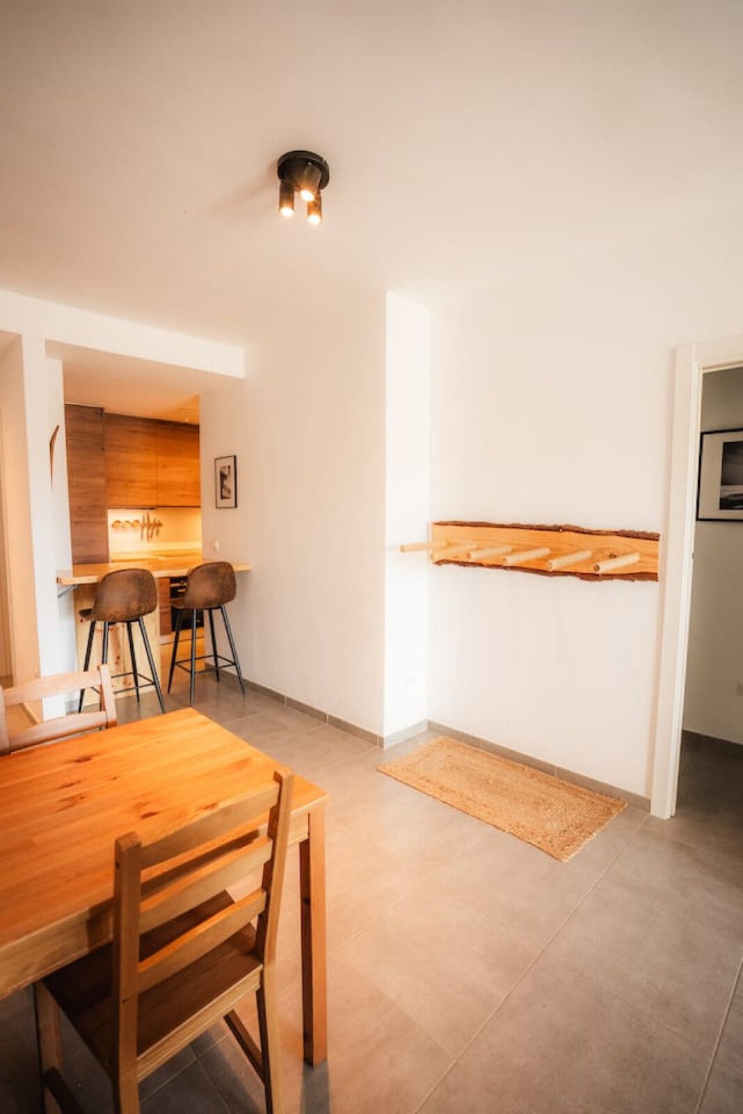 El apartamento se distribuye en una sola planta, ofreciendo un espacio cómodo y funcional. Al entrar, nos recibe la cocina con pequeño patio trasero y barra con dos taburetes, seguida del salón-comedor con mesa para cuatro personas y sofá con mesa baja, junto a una gran Smart TV para disfrutar de tus series favoritas.