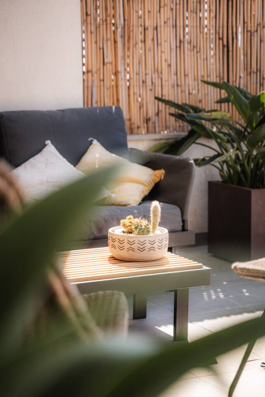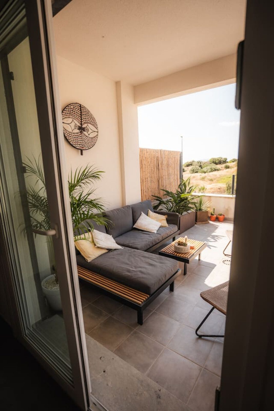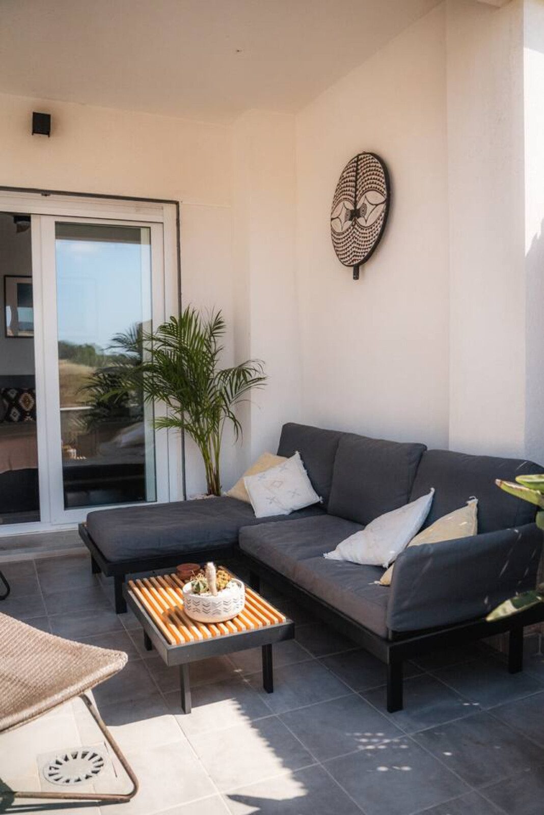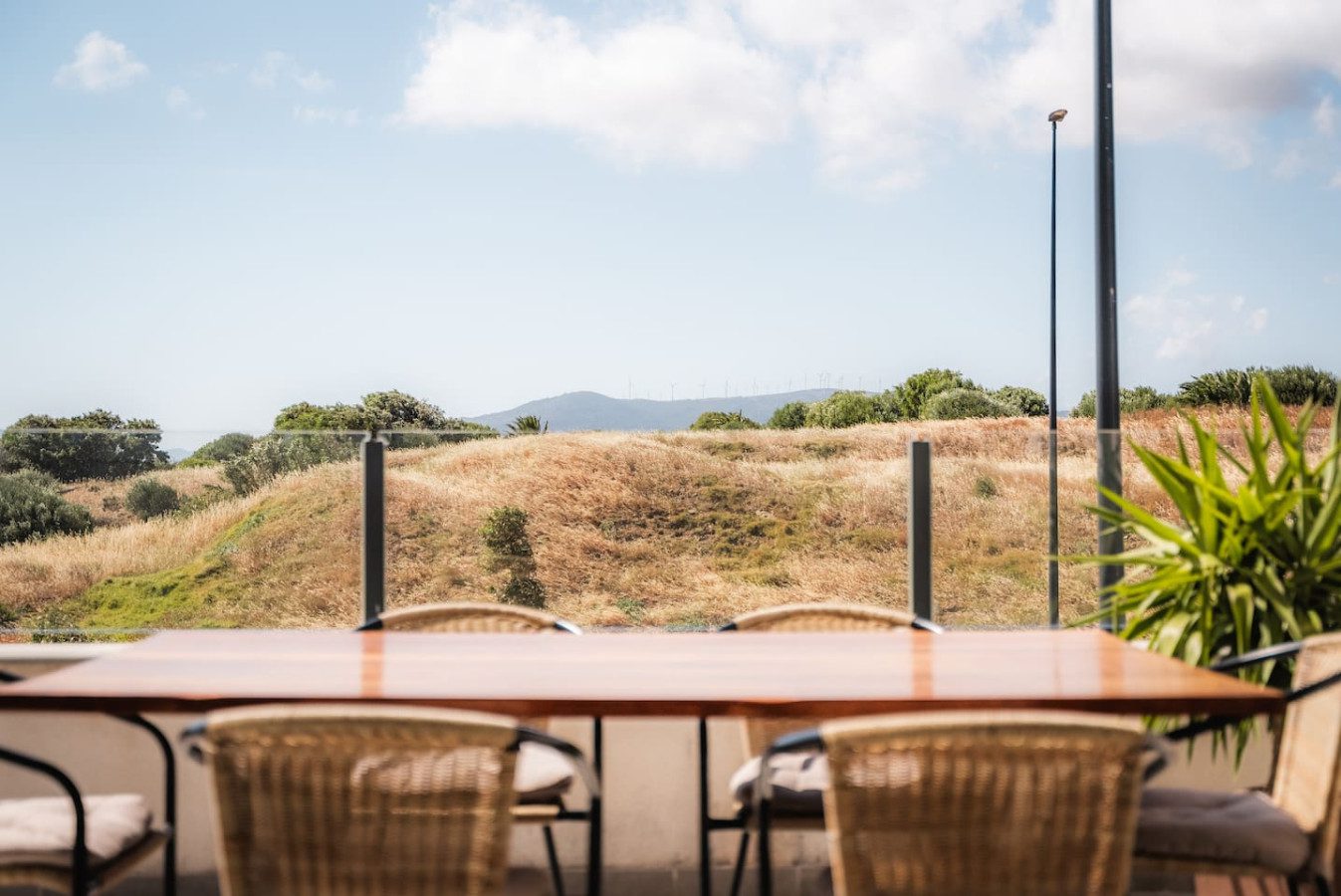 Desde el salón se accede a la terraza, equipada con mesa para cuatro y un salón chill-out exterior, ideal para comer al aire libre mientras se disfrutan vistas parciales al mar y al campo, y las bonitas puestas de sol sobre el Atlántico.