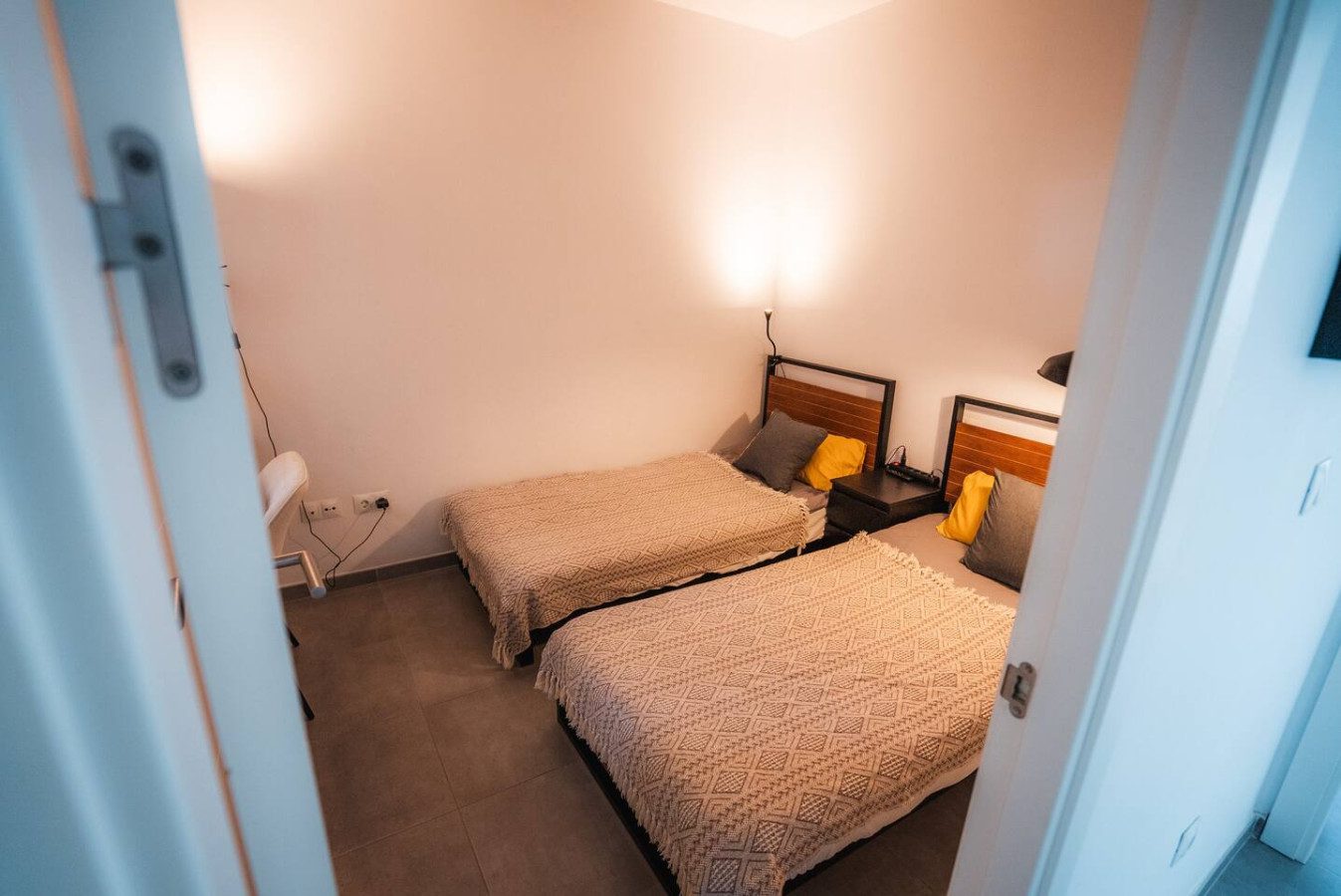 La zona de descanso cuenta con un baño completo con ducha y dos dormitorios: uno con cama de matrimonio de 140 cm, armario empotrado y acceso directo a la terraza, y otro con dos camas individuales de 90 cm, armario y escritorio.