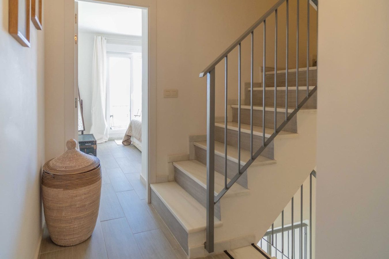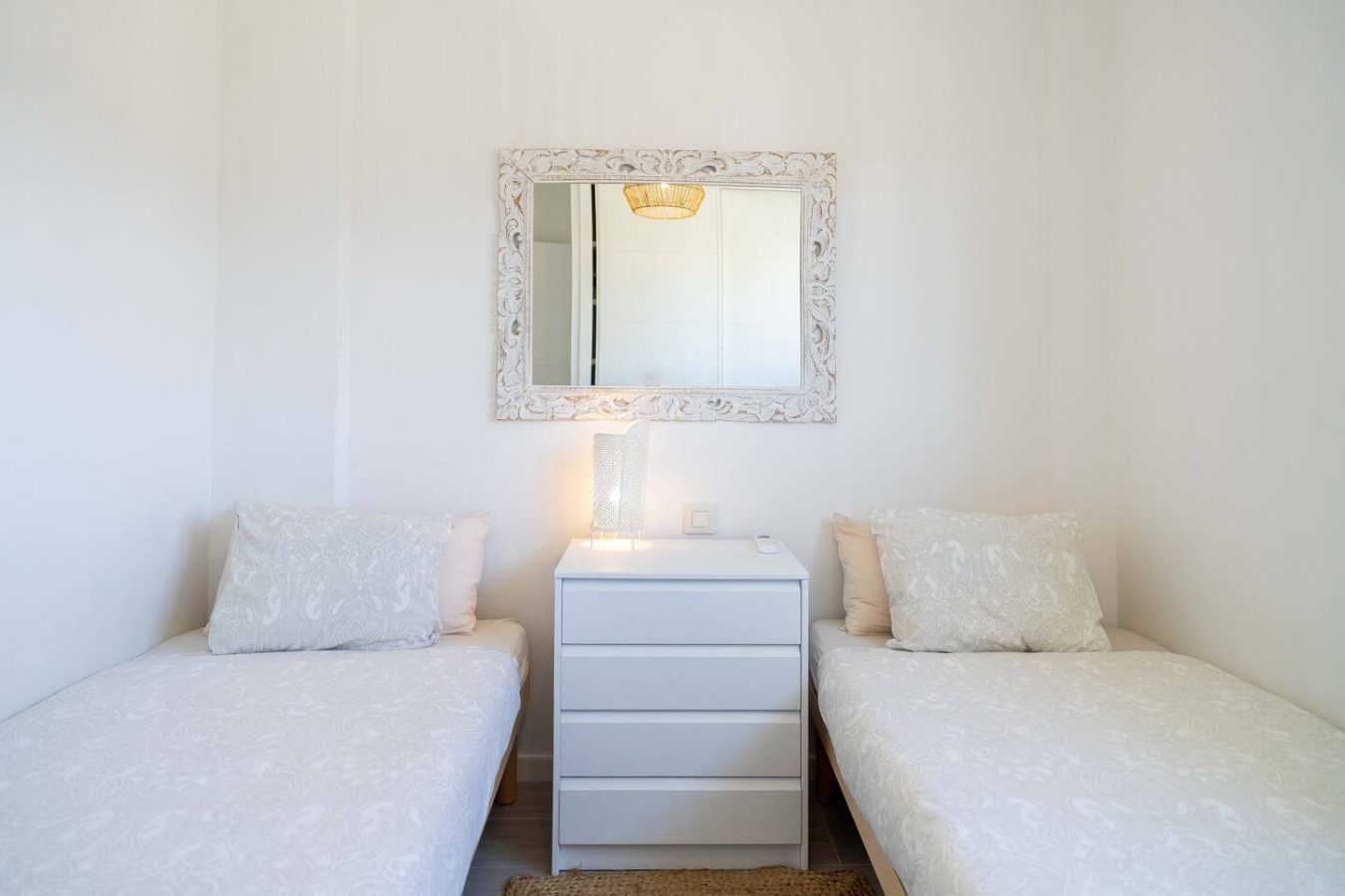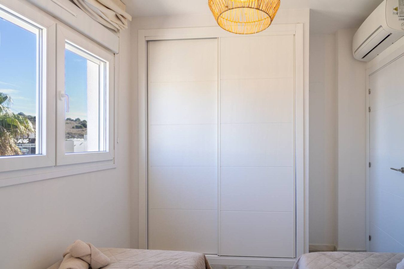 Accedemos a la primera planta por escaleras, donde se encuentran los dos dormitorios también con aire acondicionado: el dormitorio de matrimonio con cama de 160 cm da al interior del edificio comunitario, mientras que el dormitorio con dos camas individuales se orienta hacia la calle. Ambos cuentan con armarios empotrados para guardar ropa y maletas, y comparten un baño con plato de ducha. La tercera planta ofrece dos terrazas soleadas, perfectas para tender ropa o disfrutar de algo de vistas al mar, además de un armario con lavadora y tendedero.