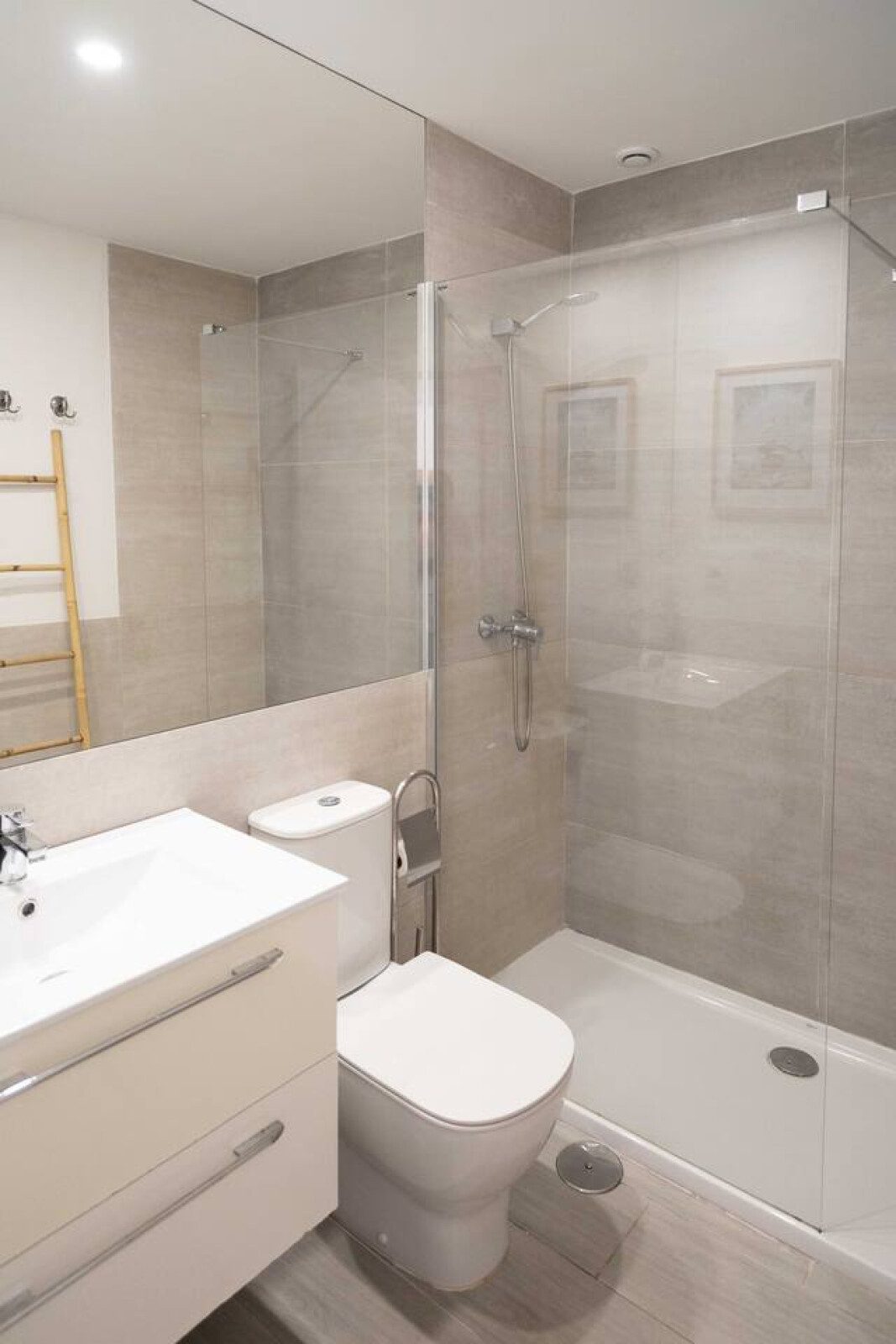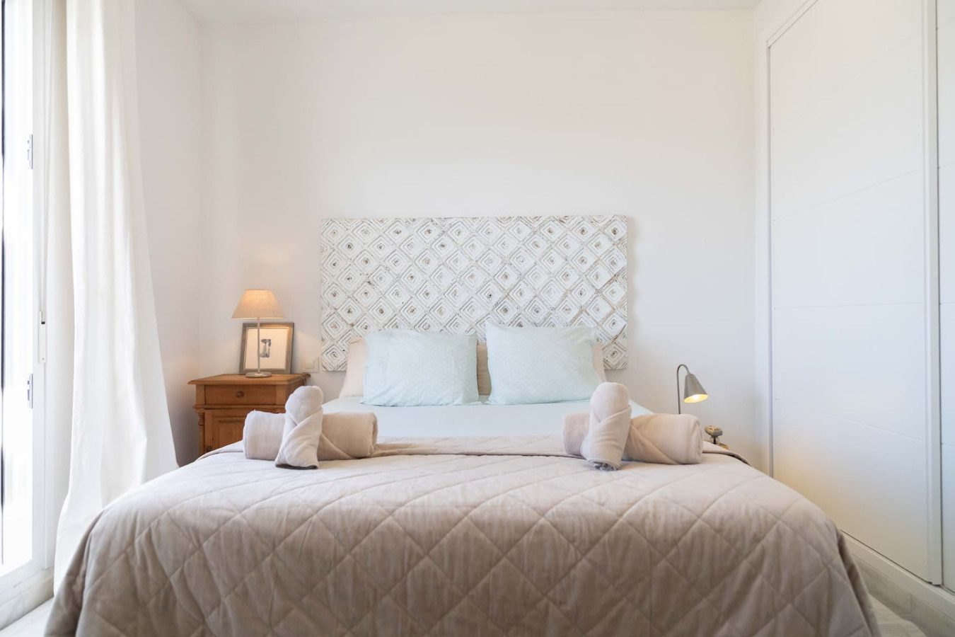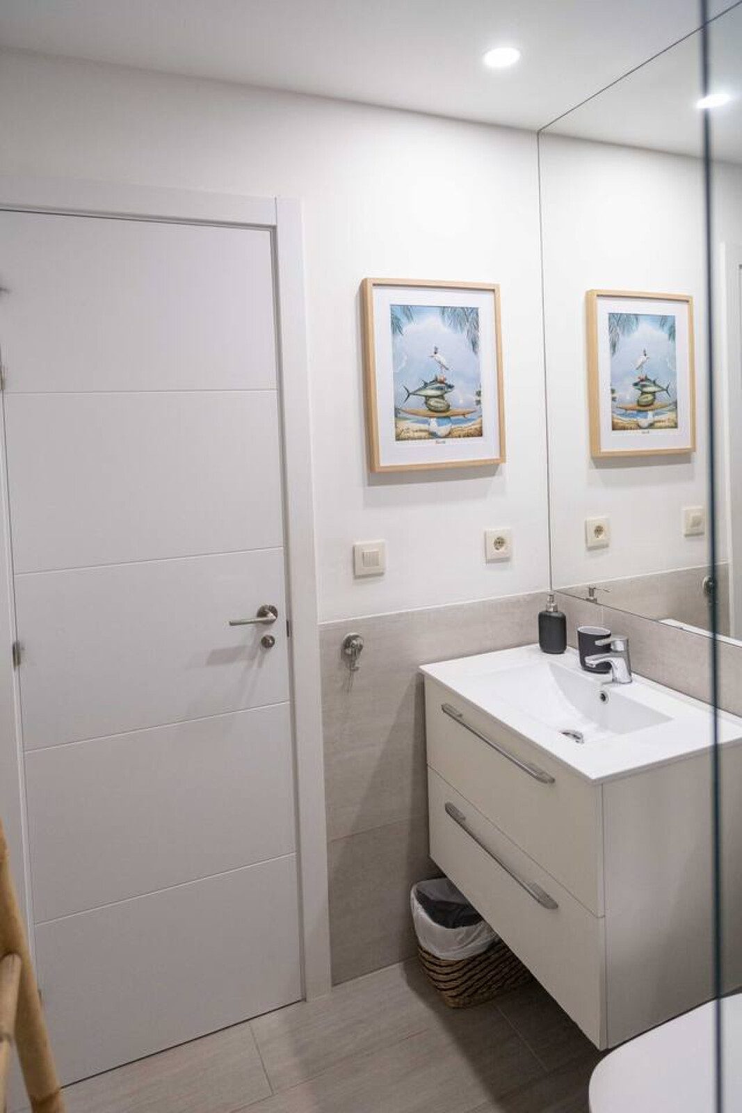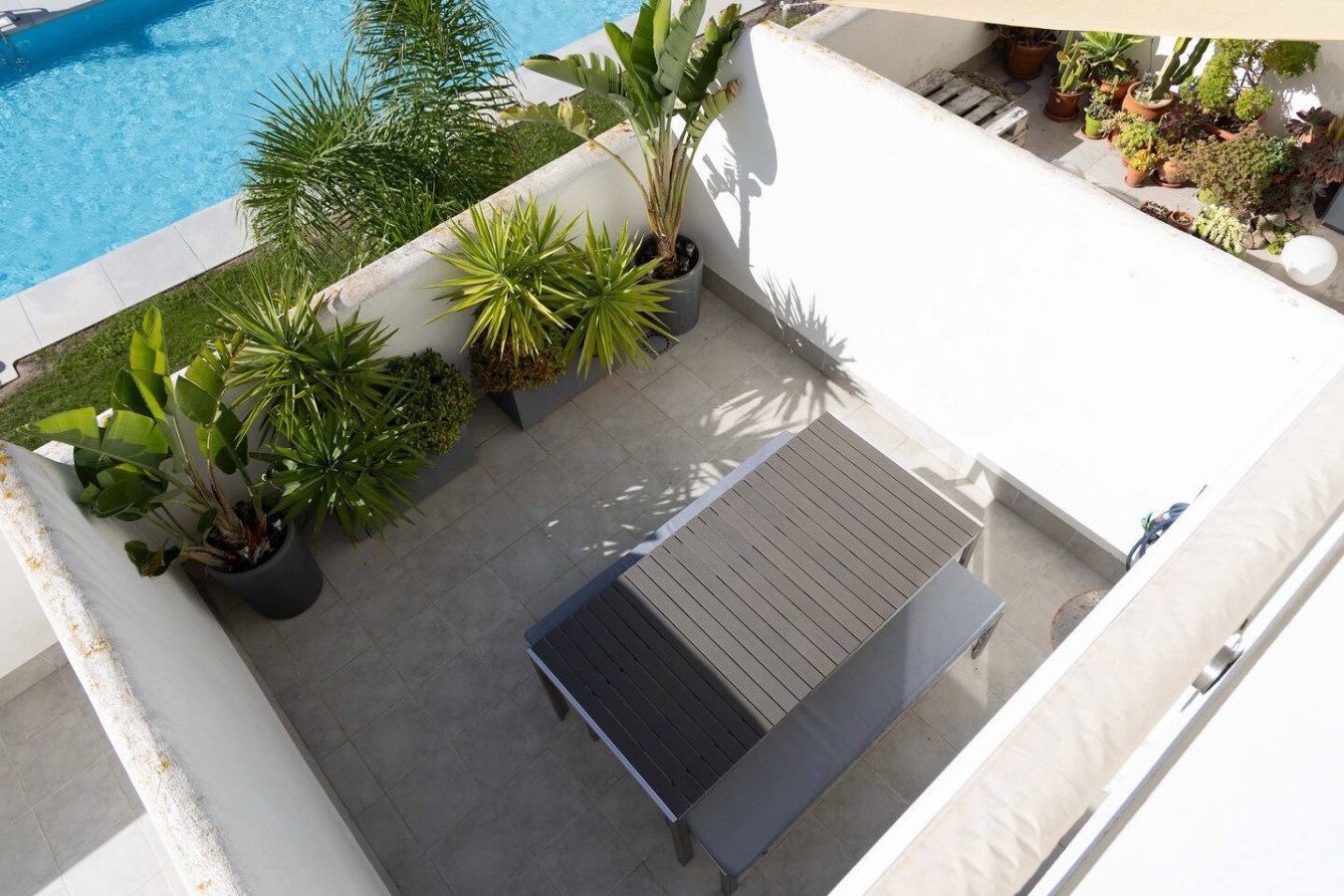 Accedemos a la primera planta por escaleras, donde se encuentran los dos dormitorios también con aire acondicionado: el dormitorio de matrimonio con cama de 160 cm da al interior del edificio comunitario, mientras que el dormitorio con dos camas individuales se orienta hacia la calle. Ambos cuentan con armarios empotrados para guardar ropa y maletas, y comparten un baño con plato de ducha. La tercera planta ofrece dos terrazas soleadas, perfectas para tender ropa o disfrutar de algo de vistas al mar, además de un armario con lavadora y tendedero.