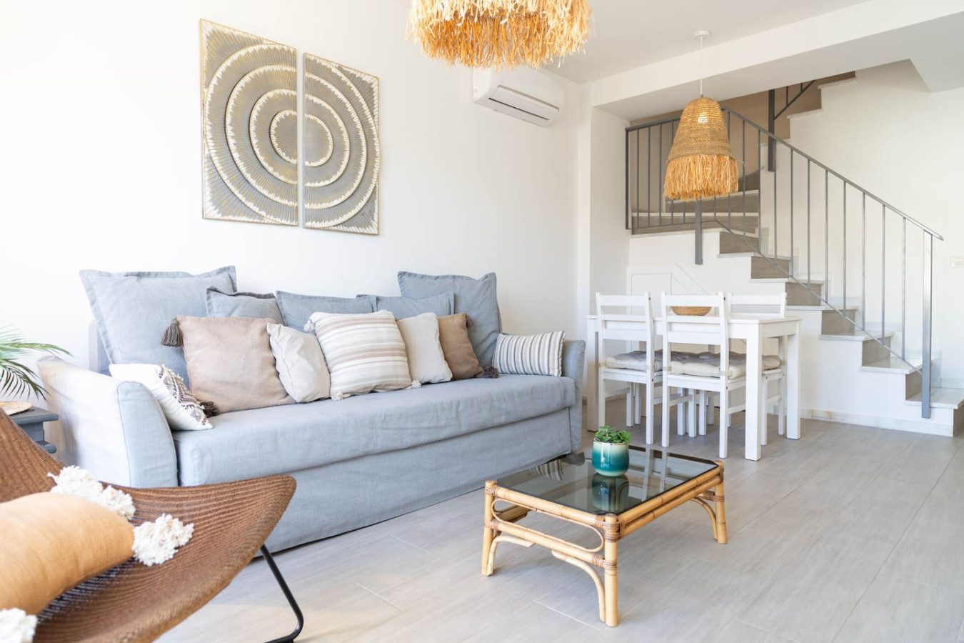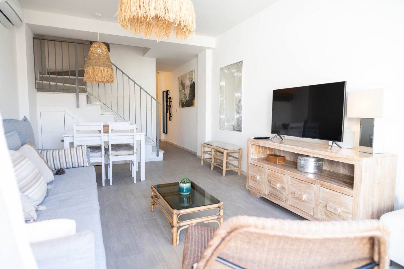 El apartamento se encuentra en una primera planta y se distribuye en tres plantas. En la planta baja encontrarás la cocina totalmente equipada, un pequeño baño, y el salón-comedor con mesa con 4 sillas para los días de invierno, y un sofá con mesita y Smart TV para disfrutar de tus series favoritas. Desde aquí se accede a la terraza principal, con mobiliario exterior, bonitas plantas y mesa para comidas al aire libre.