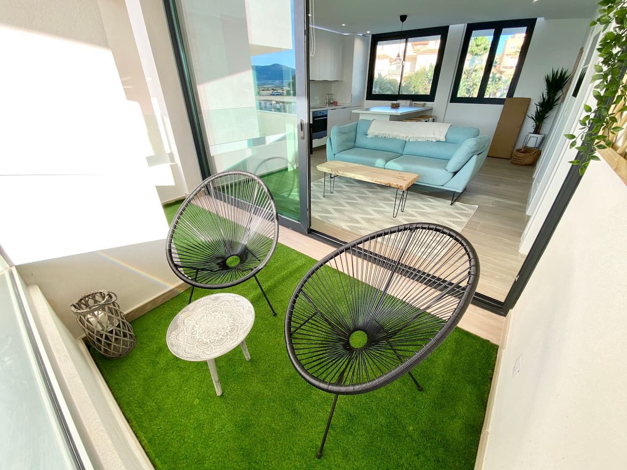 Desde el salón se accede a la terraza a través de un gran ventanal. Está equipada con dos sillones y es el lugar perfecto para tomar un café por la mañana o una cerveza al atardecer, disfrutando de vistas parciales a la playa de Los Lances y al campo tras un buen día de playa.