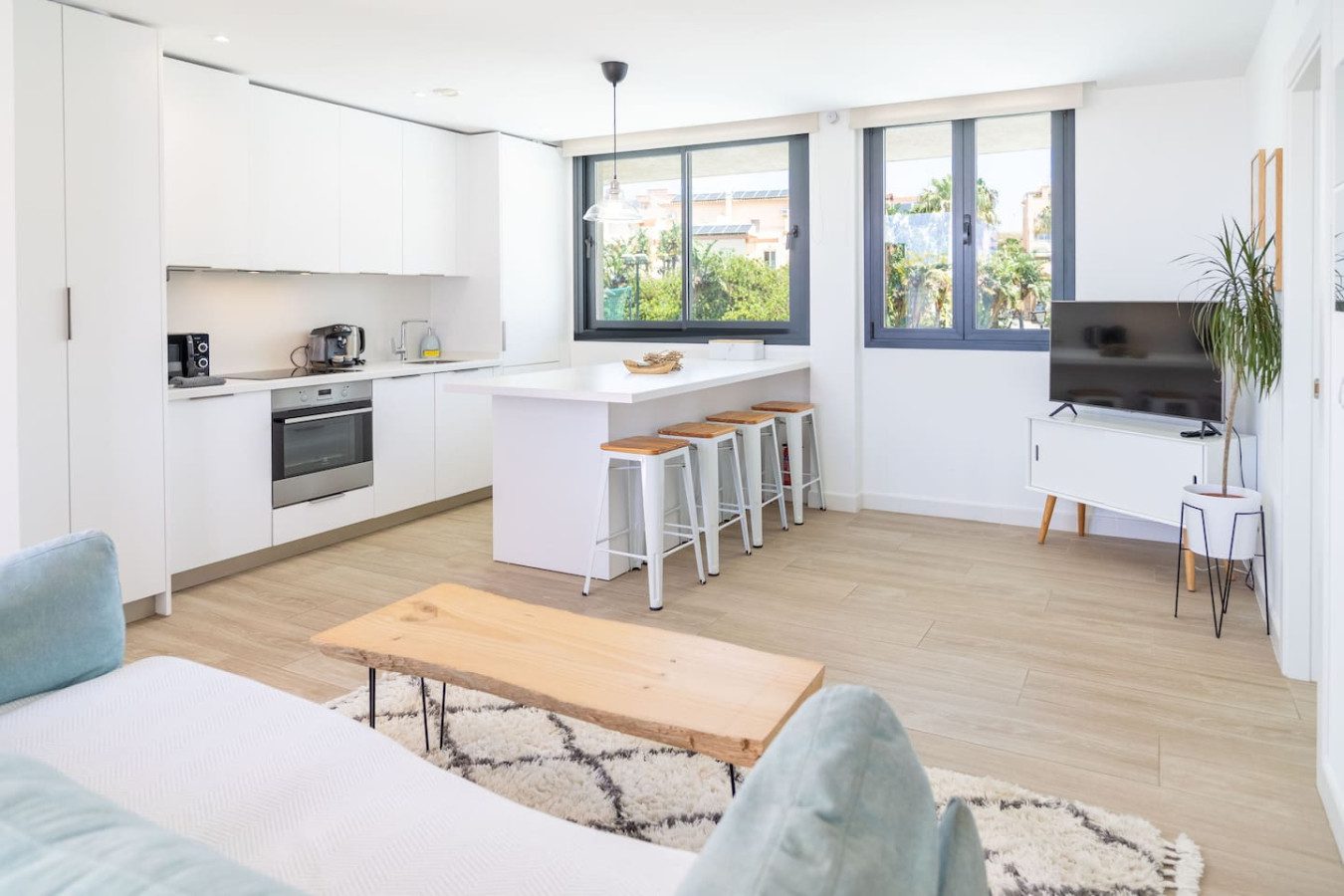 Al entrar, nos recibe un salón-comedor con cocina abierta con isla y cuatro taburetes, un sofá con mesa baja y una Smart TV para disfrutar de tus series favoritas.