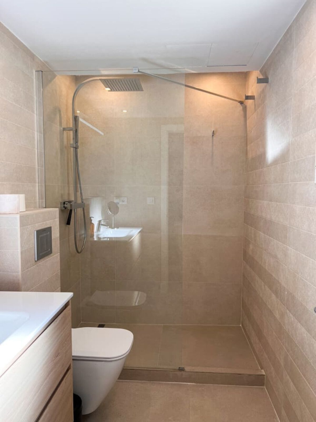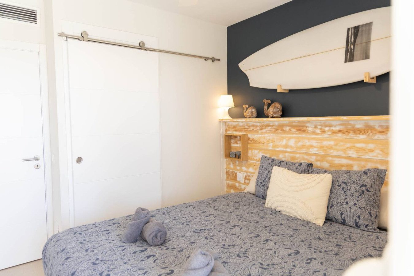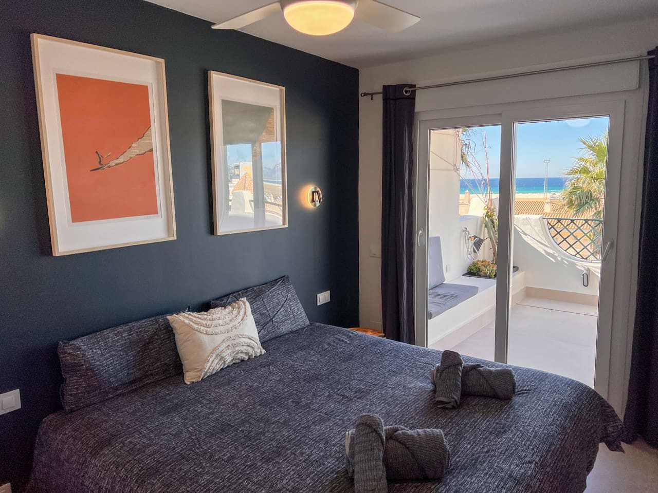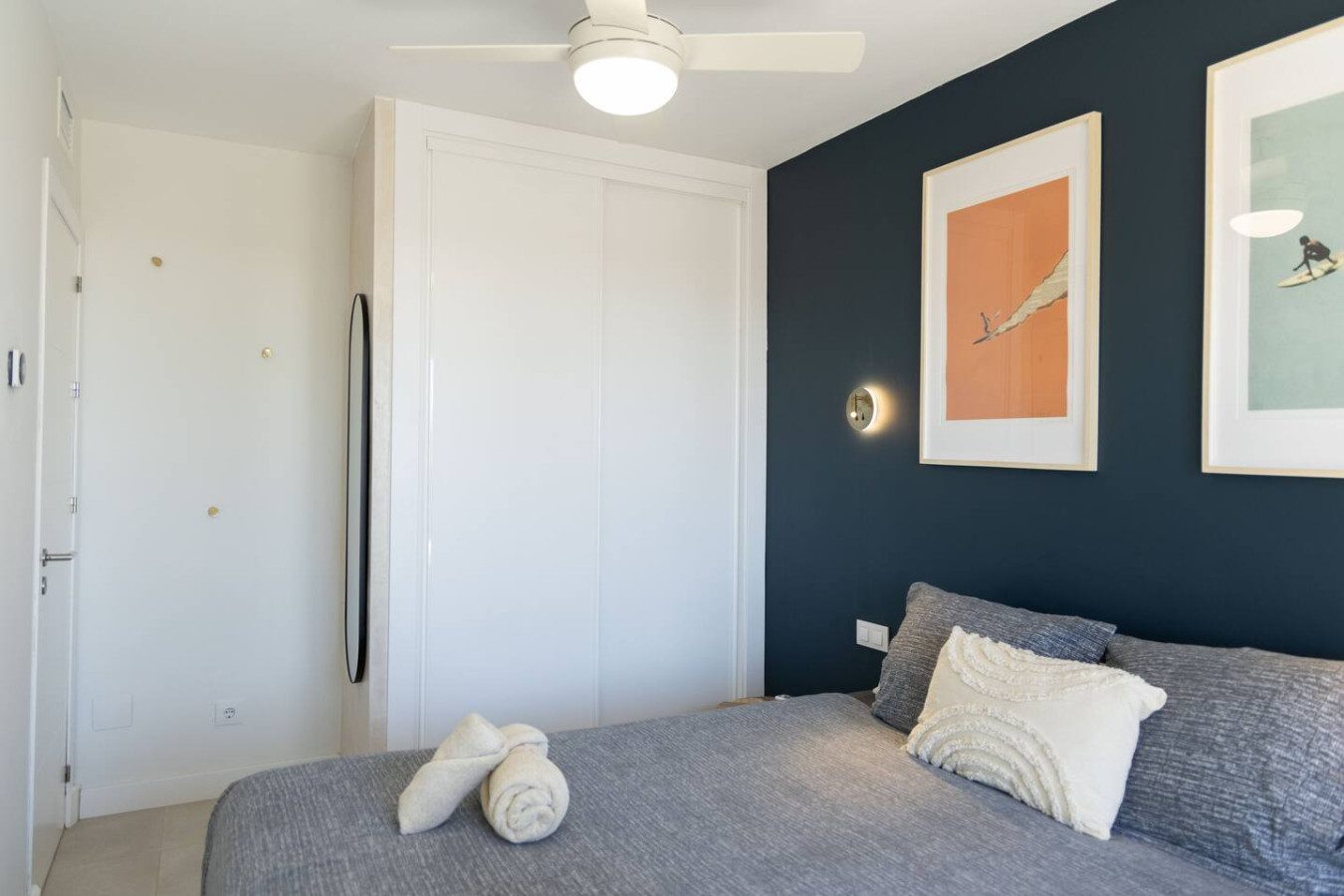 Un pasillo conduce al segundo dormitorio, con cama de 160 cm, armario empotrado y acceso directo a la terraza, seguido del segundo baño completo con plato de ducha. Finalmente, el tercer dormitorio dispone de cama de matrimonio de 160 cm, armario empotrado y también acceso a la terraza.