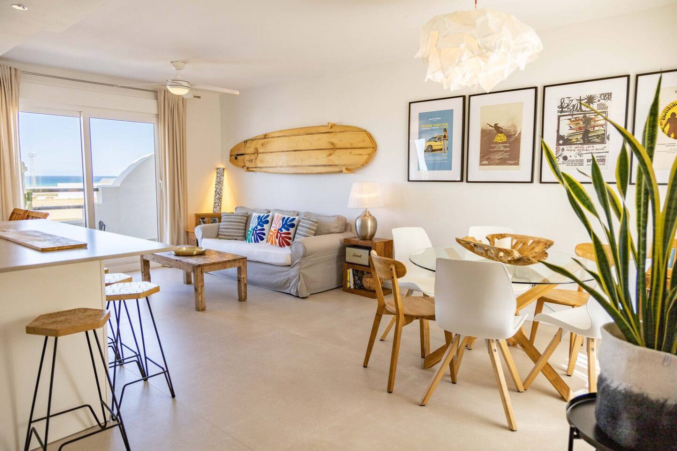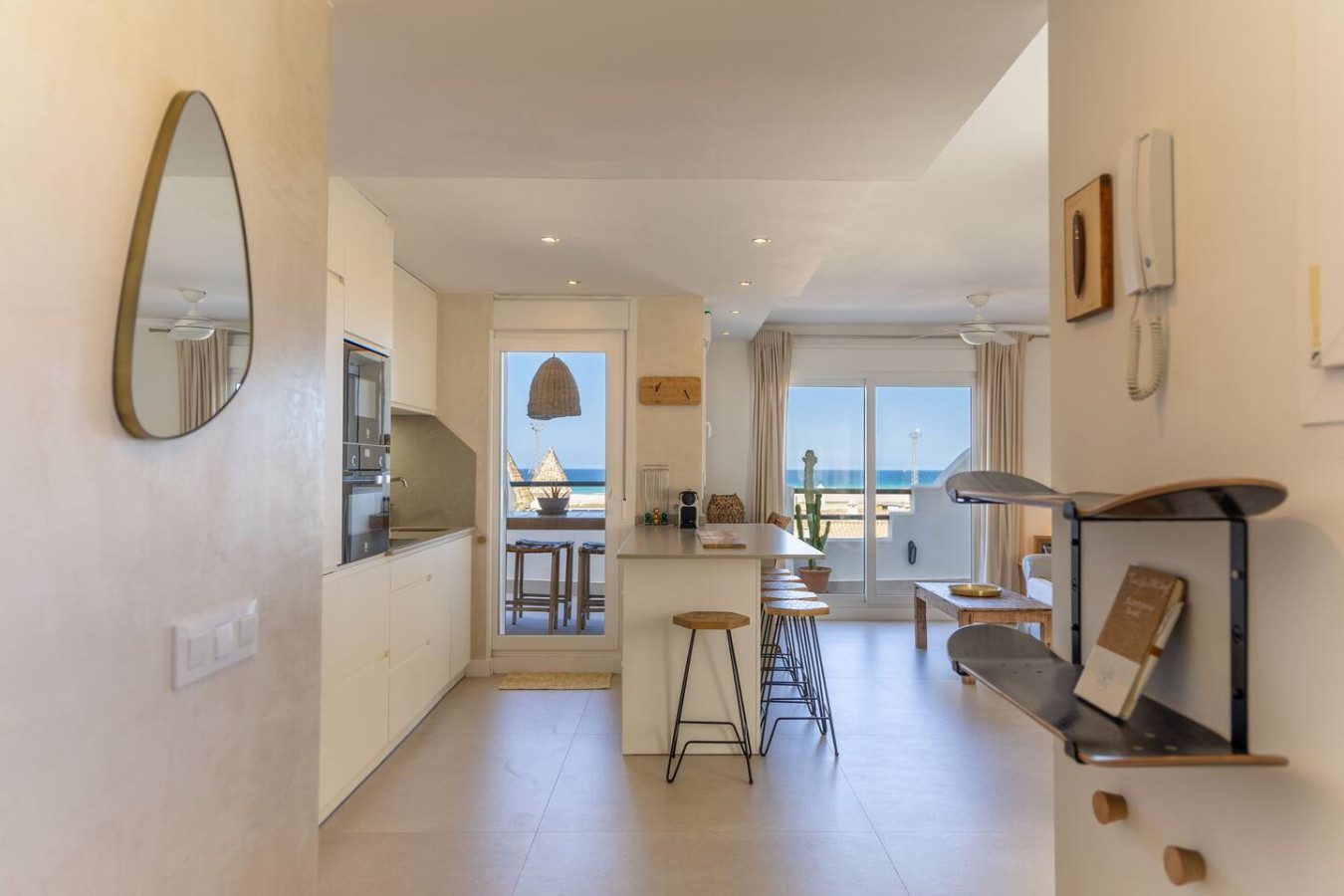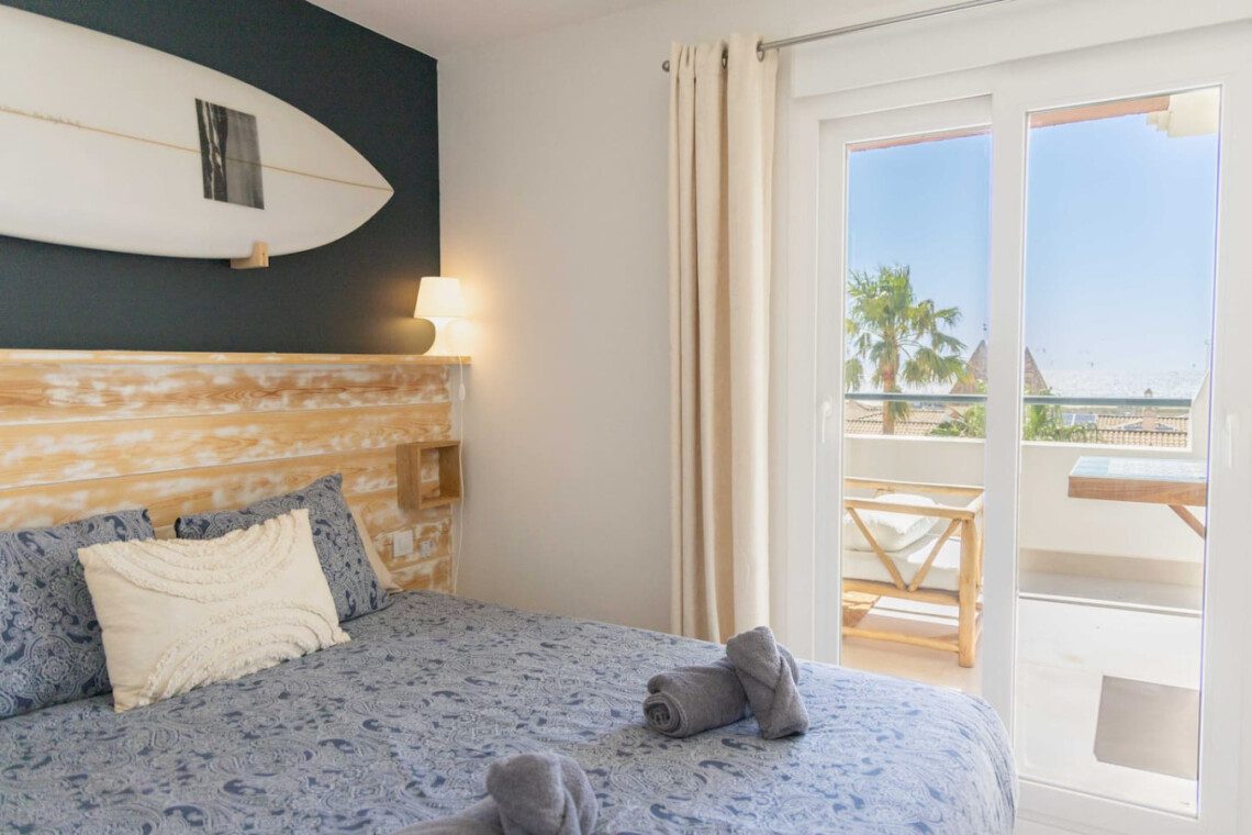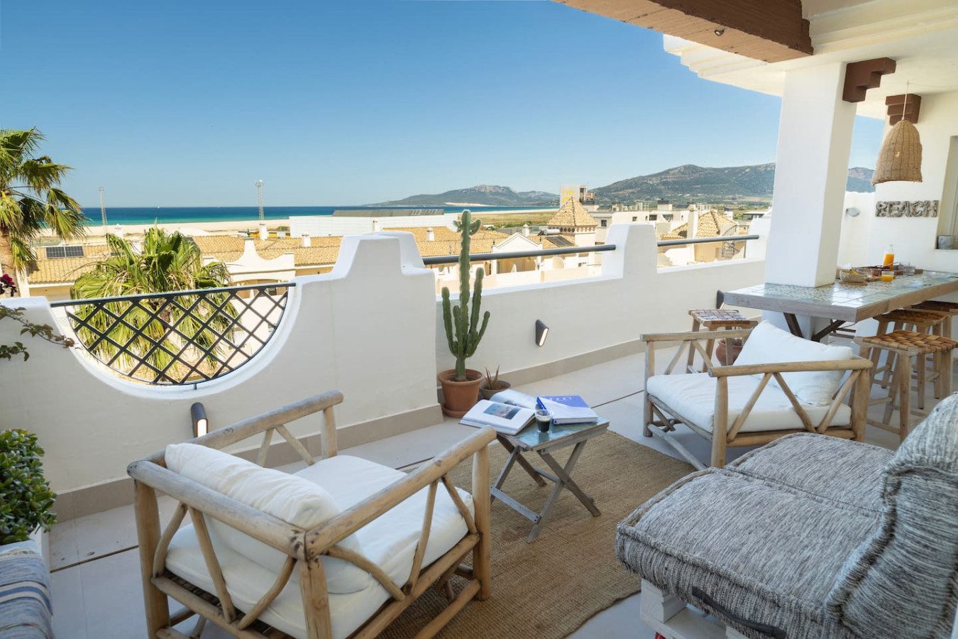 Desde el salón y la cocina se accede a la amplia terraza, equipada con una mesa alta y taburetes, perfecta para disfrutar de comidas con vistas al mar, así como de los atardeceres sobre el Atlántico. La terraza también cuenta con un salón exterior para relajarse con un café o unas cervezas tras un día de playa.
