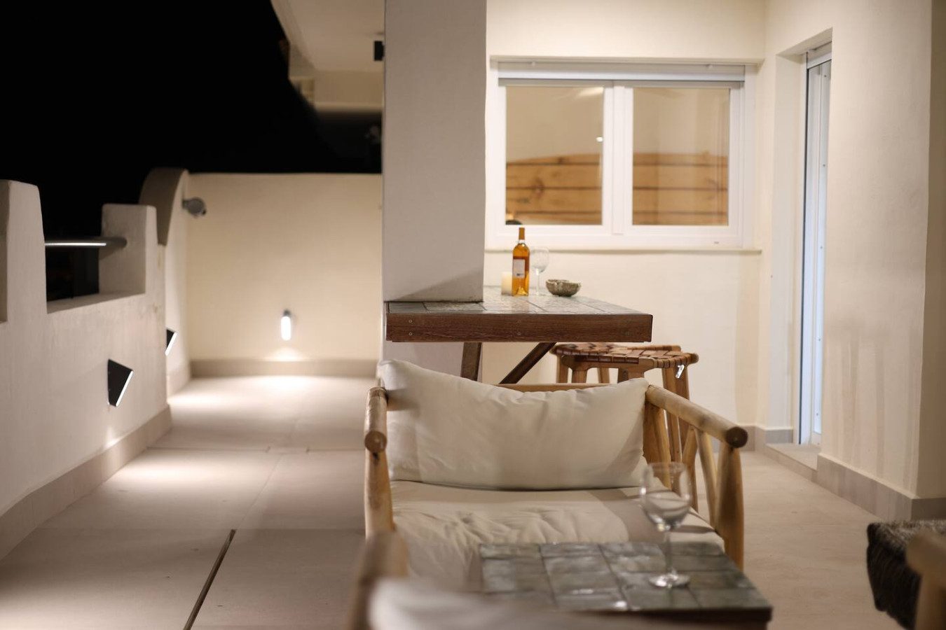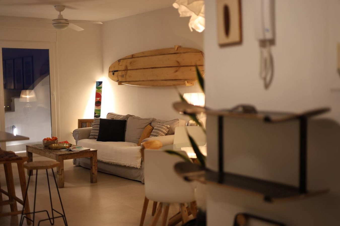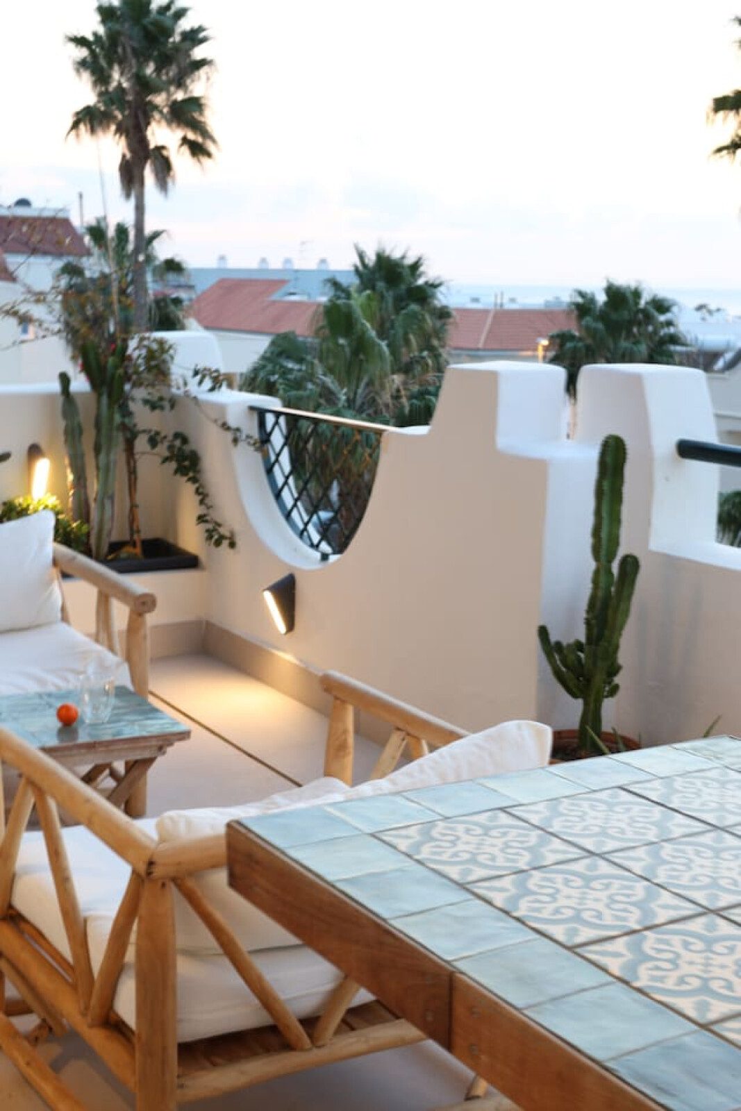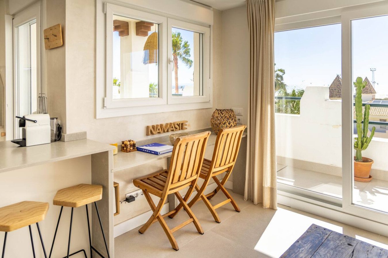 Desde el salón y la cocina se accede a la amplia terraza, equipada con una mesa alta y taburetes, perfecta para disfrutar de comidas con vistas al mar, así como de los atardeceres sobre el Atlántico. La terraza también cuenta con un salón exterior para relajarse con un café o unas cervezas tras un día de playa.