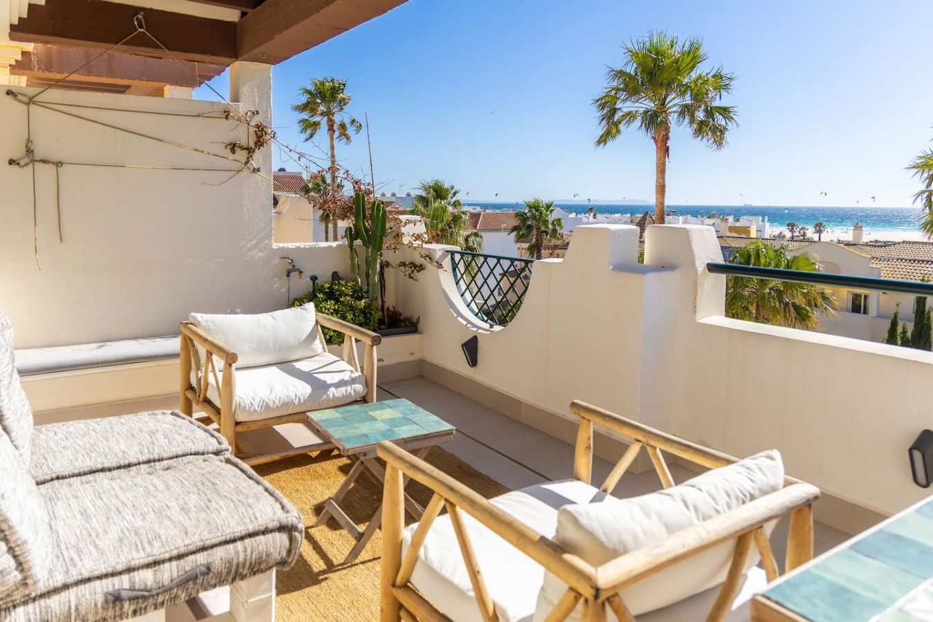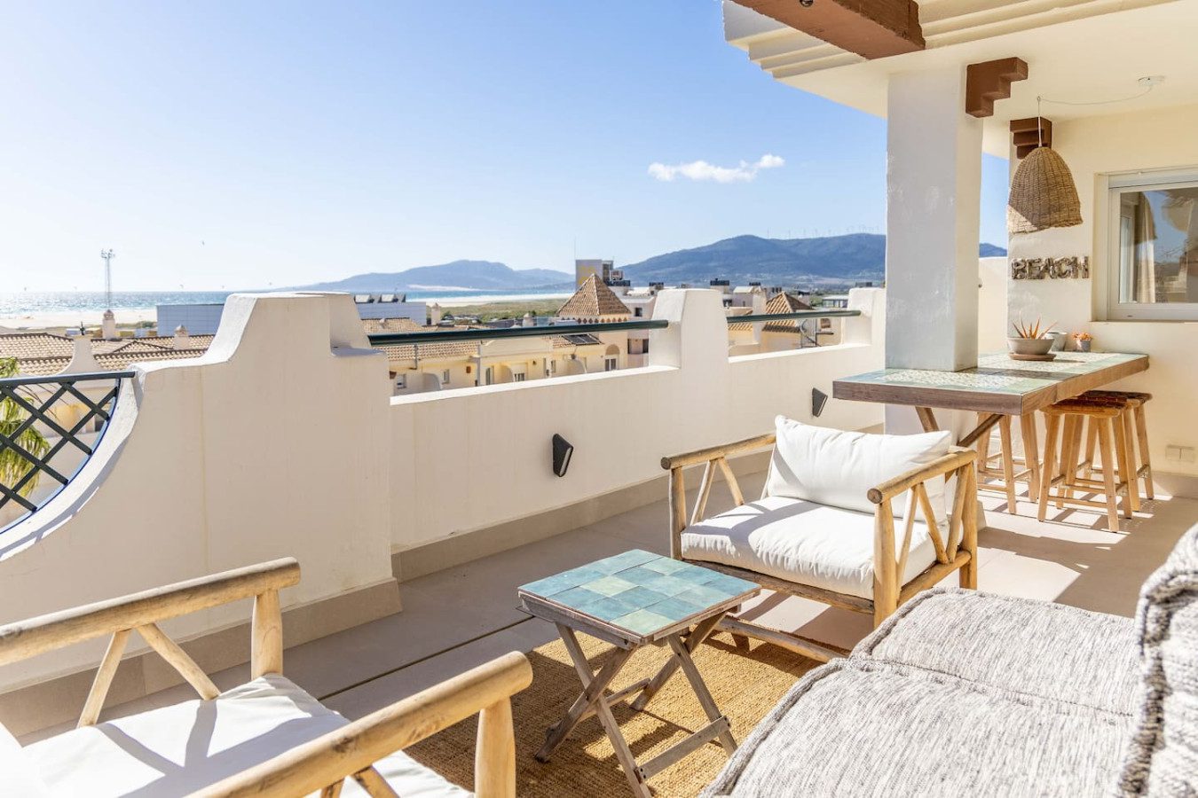 Disfruta de vistas panorámicas al Atlántico, la playa de Los Lances y la duna de Punta Paloma desde la amplia terraza de este precioso ático. A solo 5 minutos de la playa, cuenta con piscina comunitaria, plaza de parking privada, ascensor y aire acondicionado frío/calor. Diseñado con gusto para quienes buscan belleza y comodidad, ofrece todo lo necesario para una estancia confortable, tanto para familias de hasta 6 personas como para kitesurfistas que quieran vigilar las condiciones.