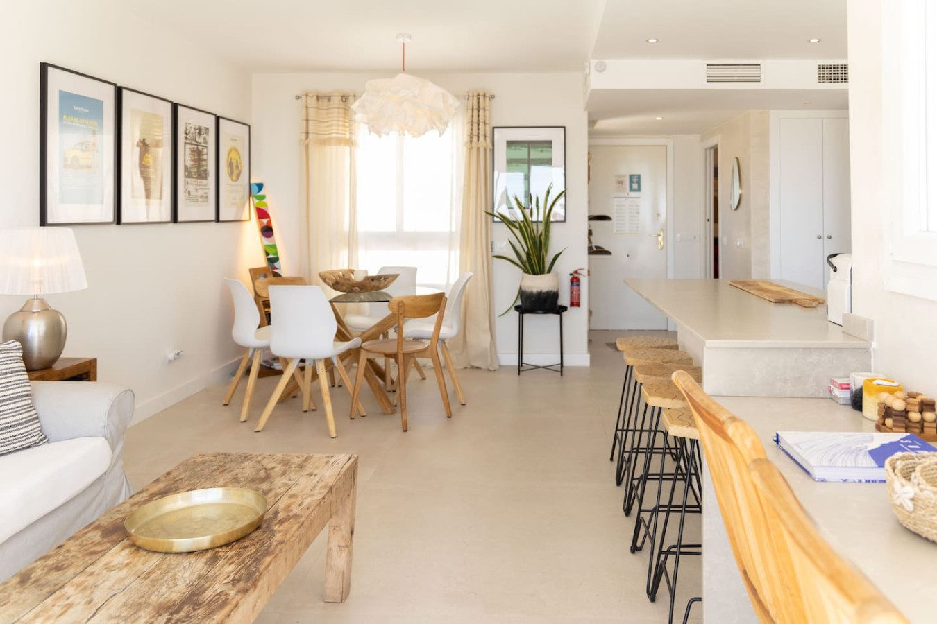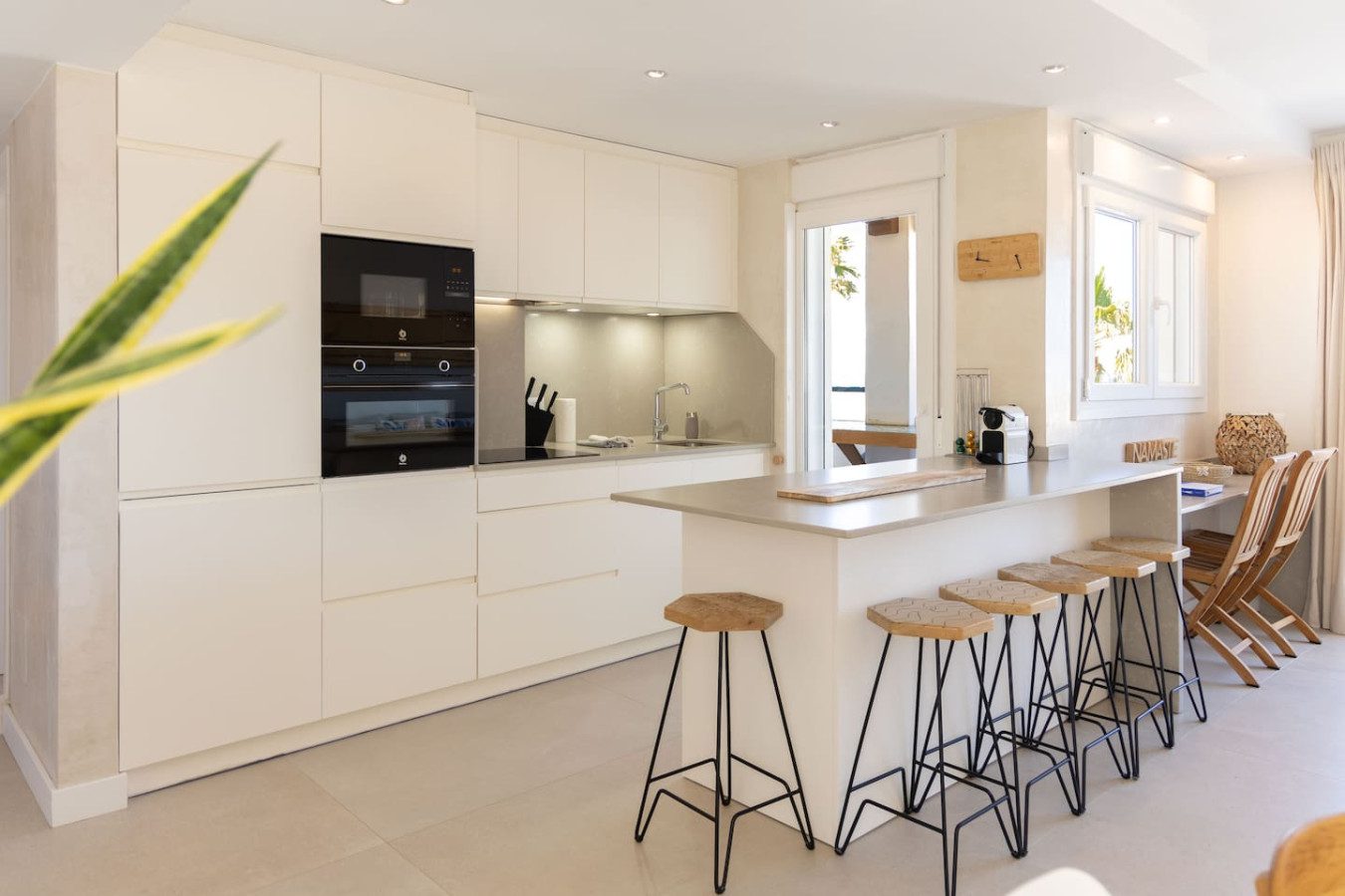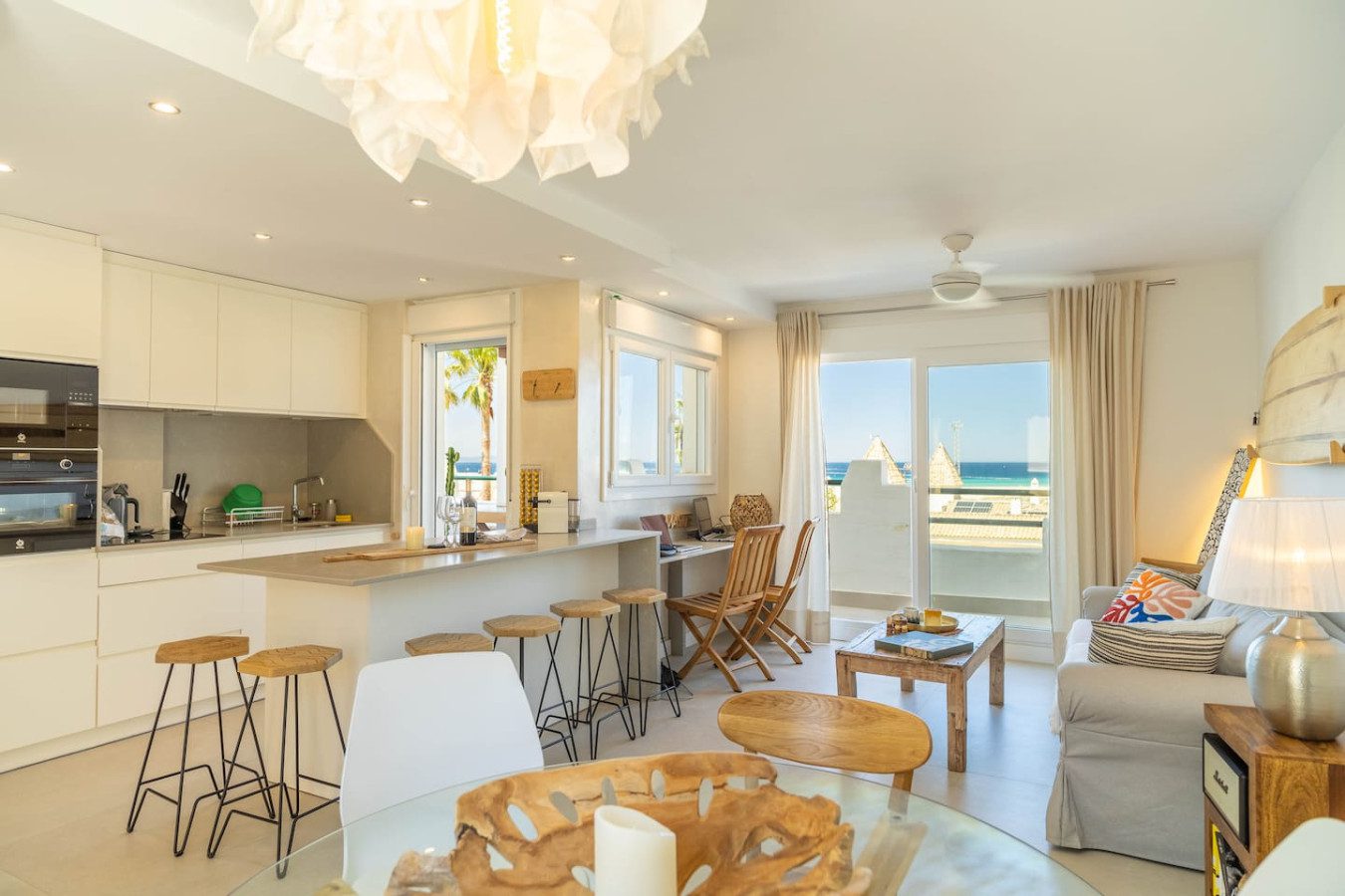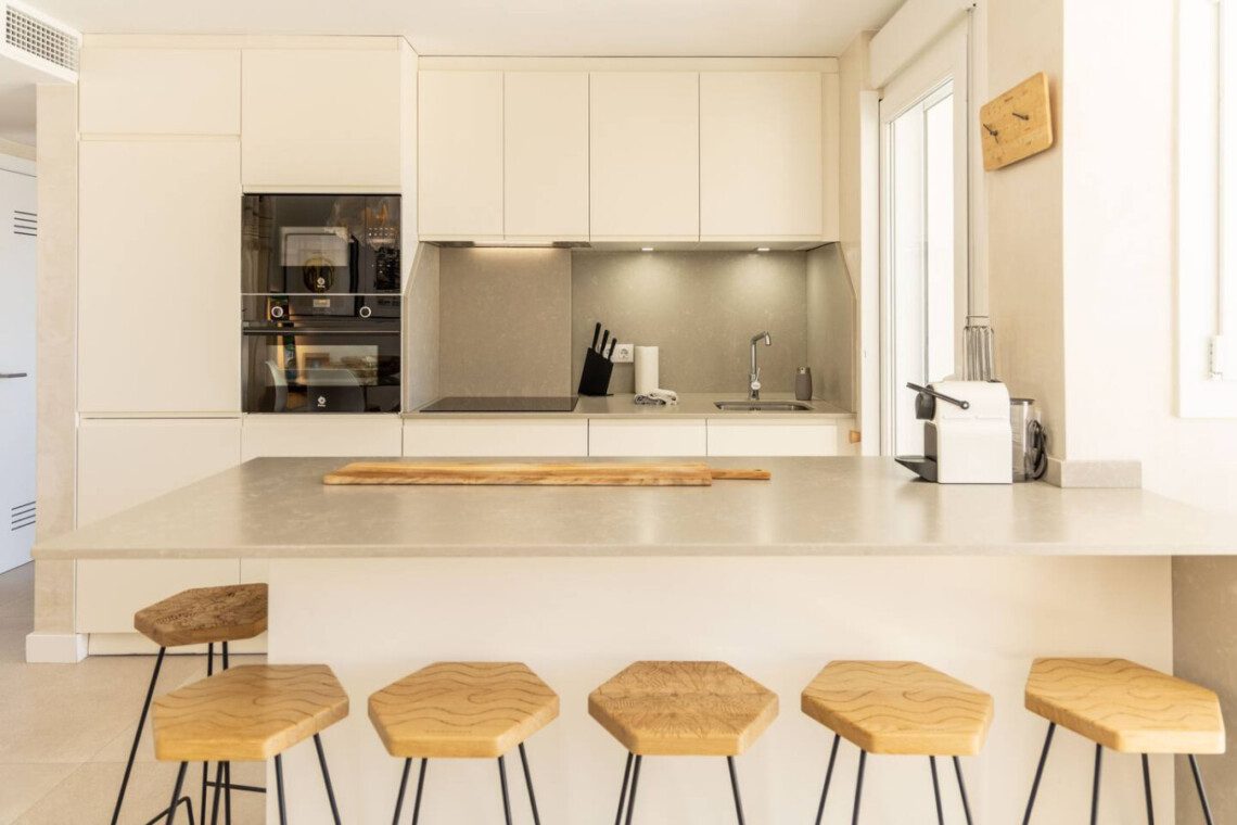 A continuación, el salón-comedor se integra con la cocina abierta con isla y seis taburetes, mesa para seis personas, un sofá con mesa baja y un escritorio con dos sillas, ideal para teletrabajar.