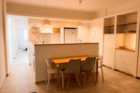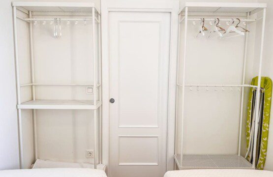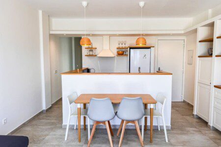The master bedroom features a 160x200 cm double bed with an open wardrobe, while the second bedroom has two single beds (90x200 cm) and two open frames for hanging and storing clothes. Everything is tastefully decorated with attention to detail to ensure your vacation in our little paradise is perfect.