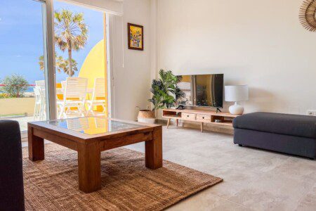 This charming apartment is located on the top floor of the urbanization Turtle 1, accessed via a small flight of stairs. It has a balcony with views of the garden, the pool, and Los Lances Beach. The living room offers a comfortable sofa, a flat-screen TV, high-speed Wi-Fi, and a fully equipped open kitchen with an oven and microwave. The bathroom has a shower and hot water via an electric boiler.
