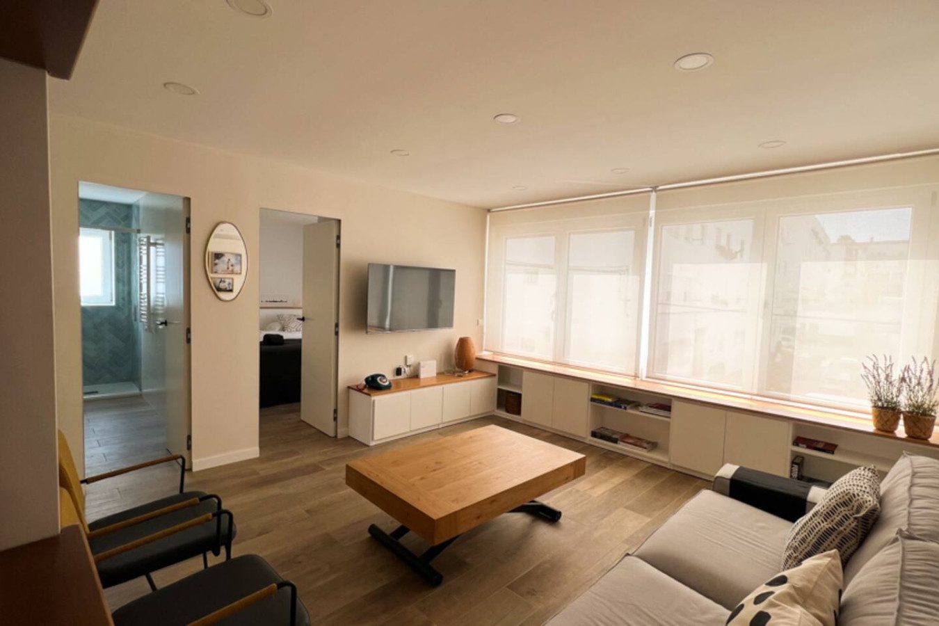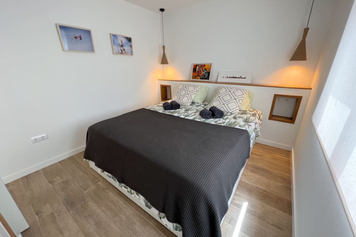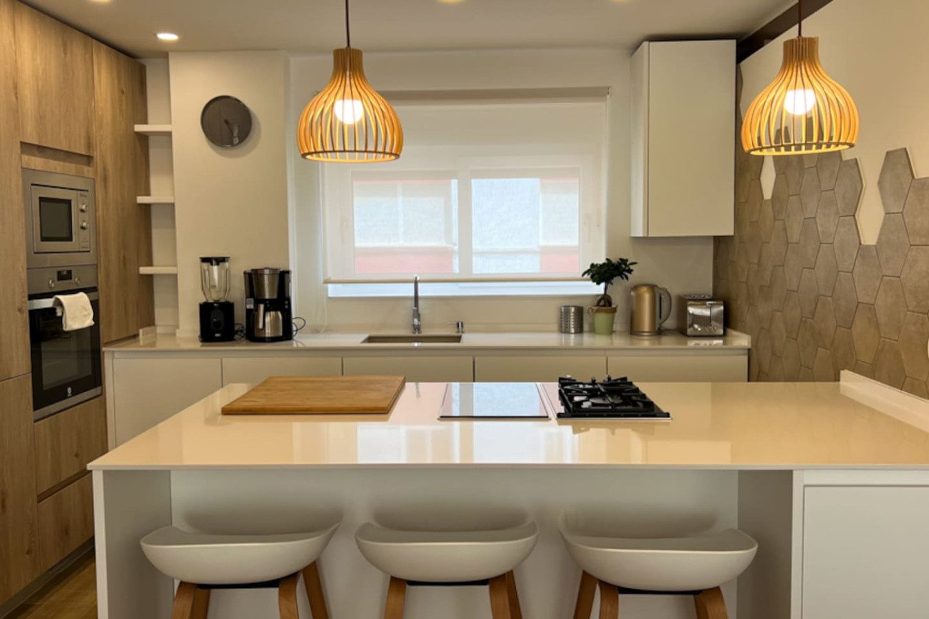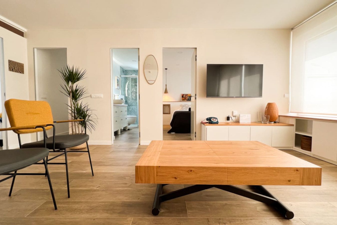 Desde el salón se accede a los tres dormitorios y al baño completo con plato de ducha. El dormitorio principal dispone de una cama king size de 180 cm y armario empotrado; el segundo cuenta con una cama de 140 cm y un amplio armario empotrado; y el tercer dormitorio ofrece una cama individual de 90 cm y un escritorio, ideal para teletrabajar.