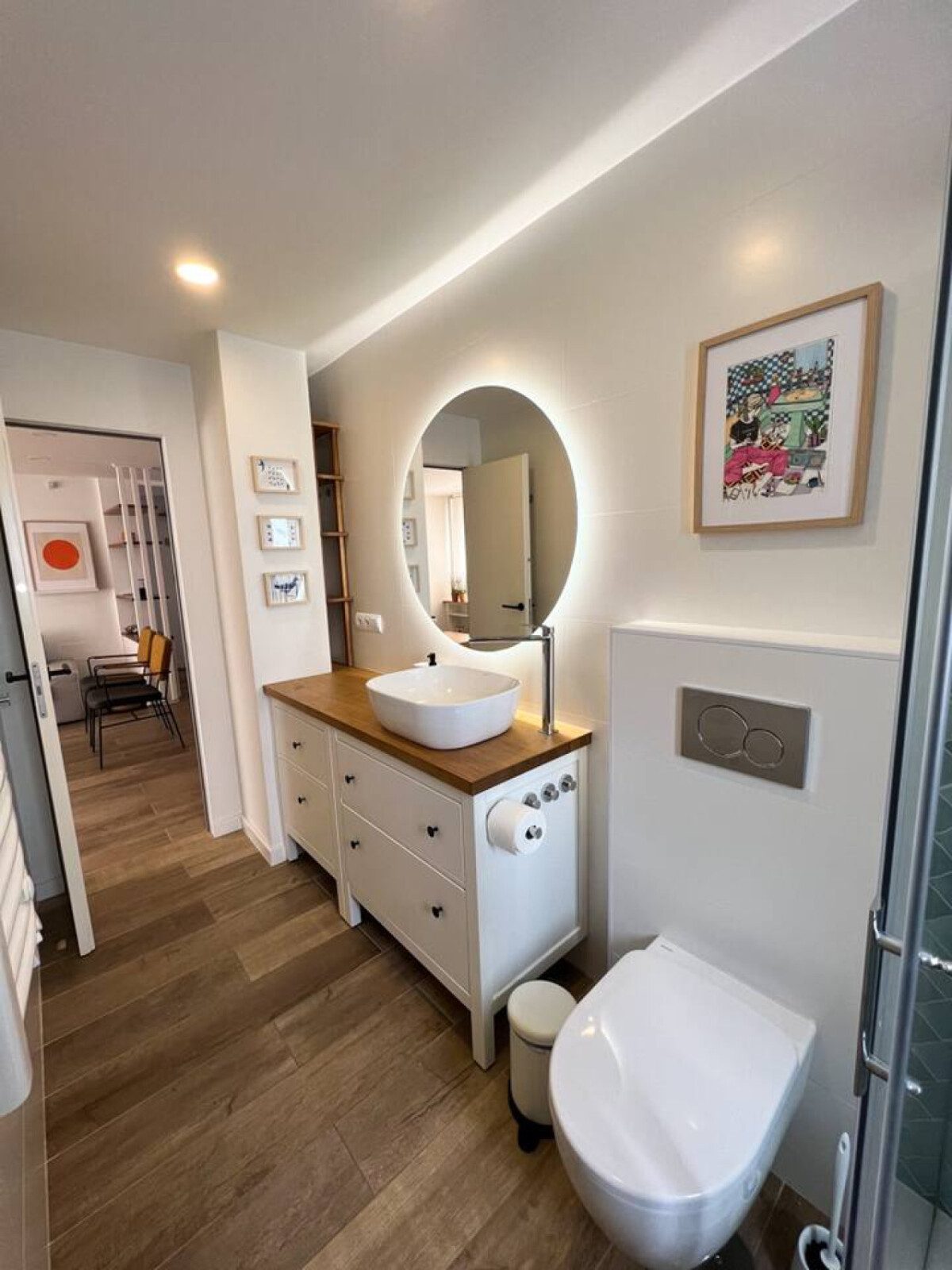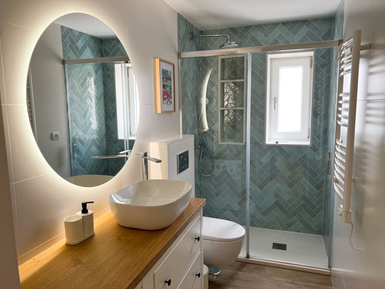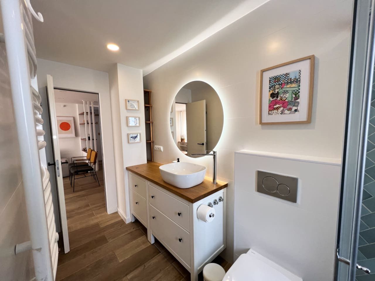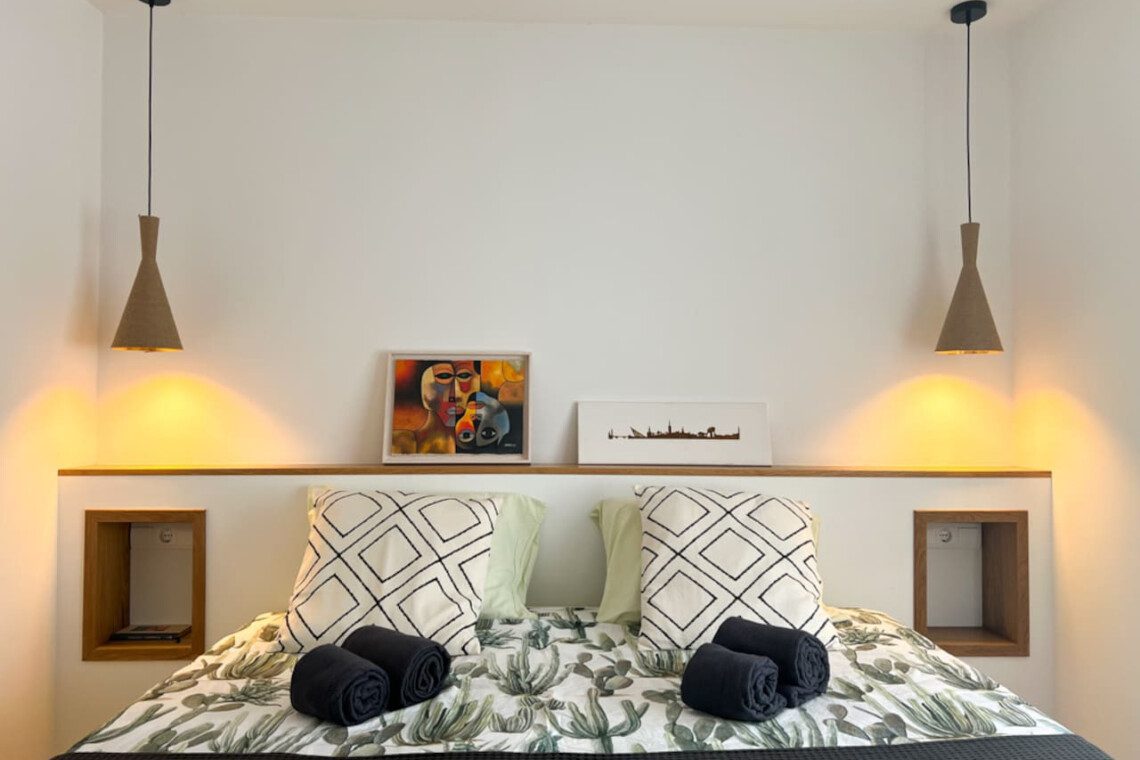 Desde el salón se accede a los tres dormitorios y al baño completo con plato de ducha. El dormitorio principal dispone de una cama king size de 180 cm y armario empotrado; el segundo cuenta con una cama de 140 cm y un amplio armario empotrado; y el tercer dormitorio ofrece una cama individual de 90 cm y un escritorio, ideal para teletrabajar.