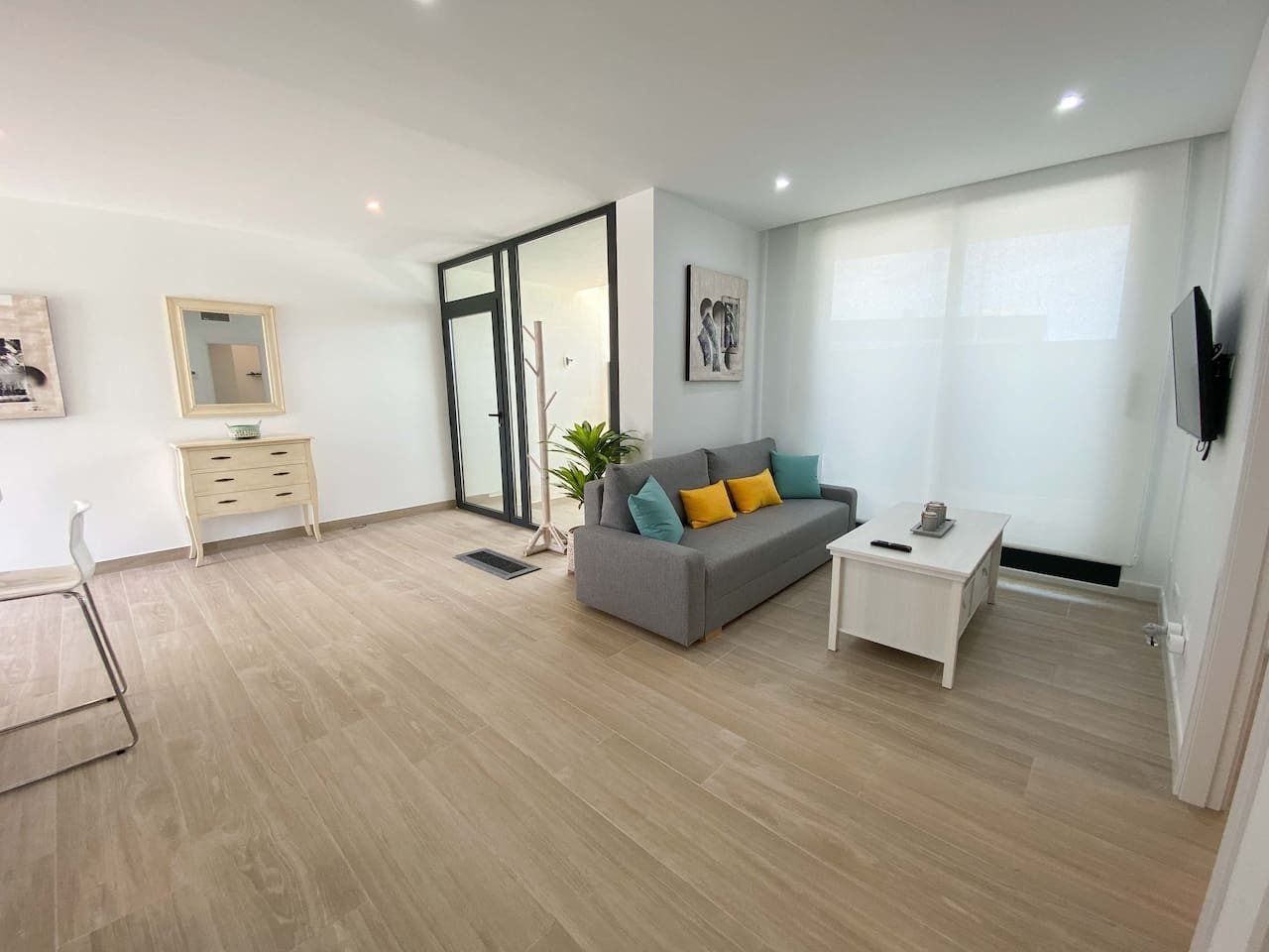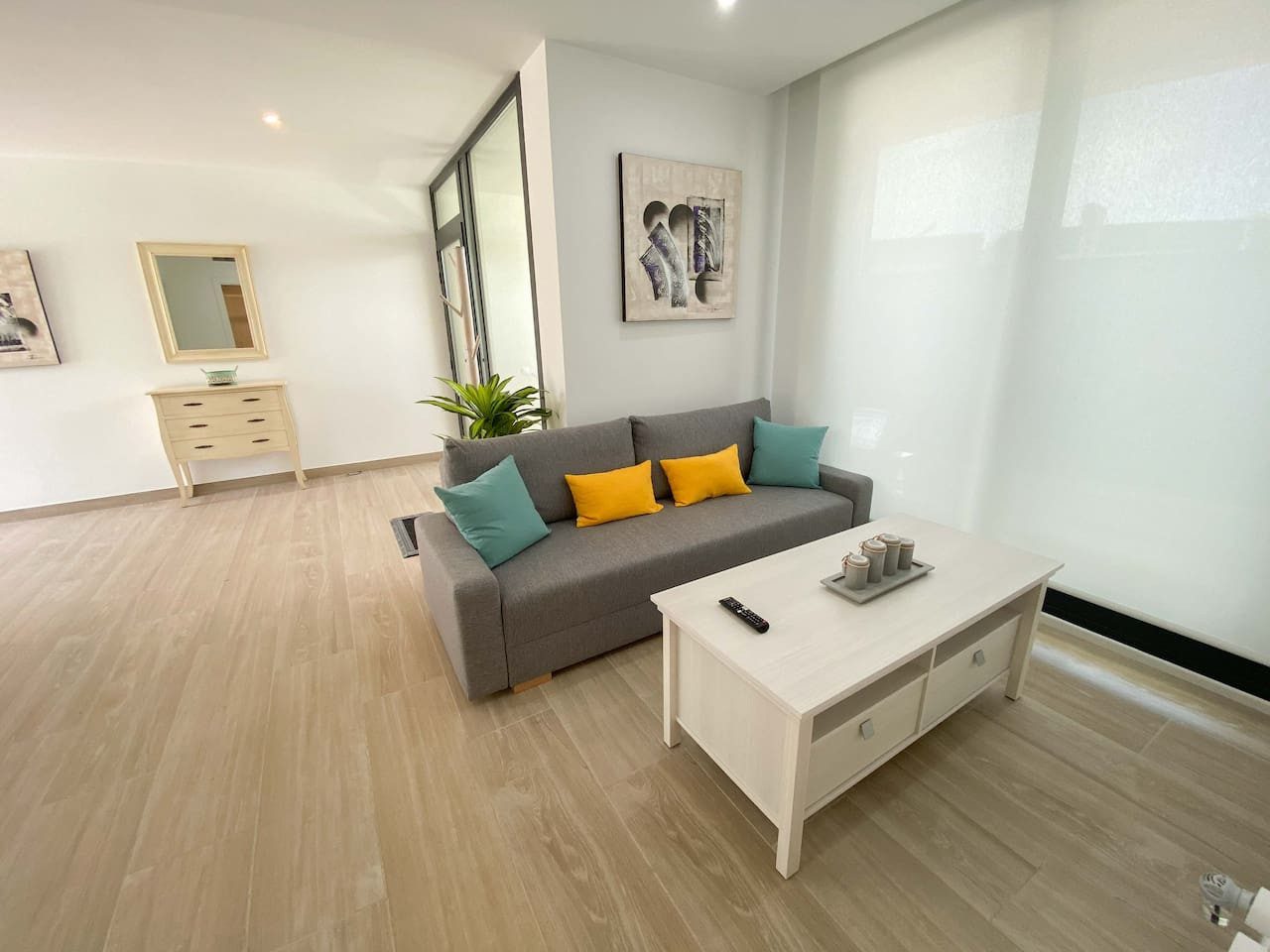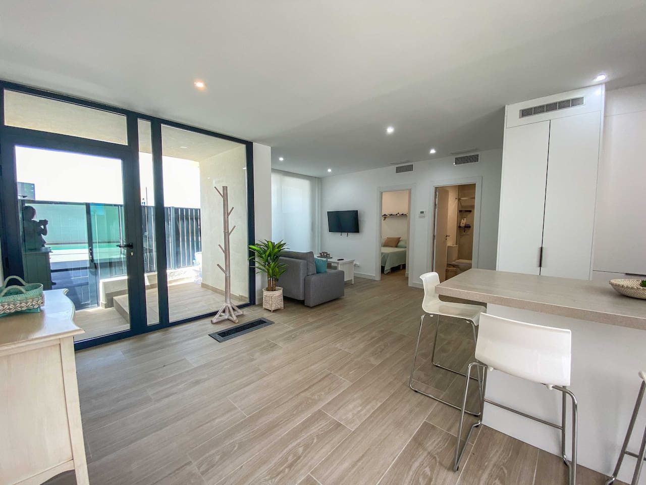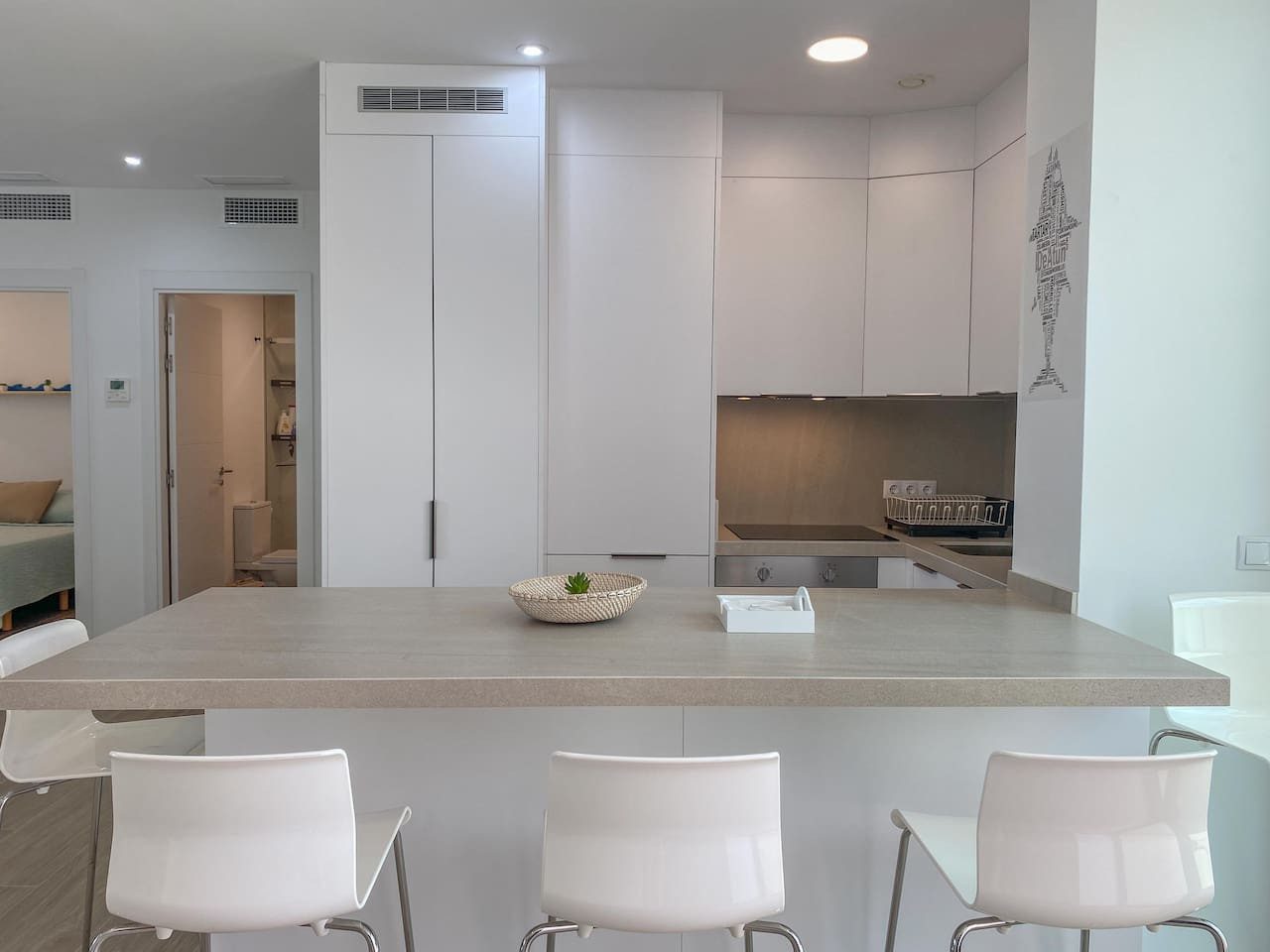 Al entrar, nos recibe un amplio salón-comedor con cocina abierta con isla y cuatro taburetes, un sofá con mesa baja y una Smart TV para disfrutar de tus series favoritas.