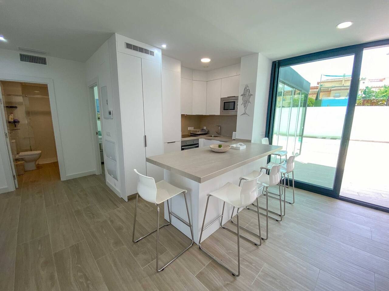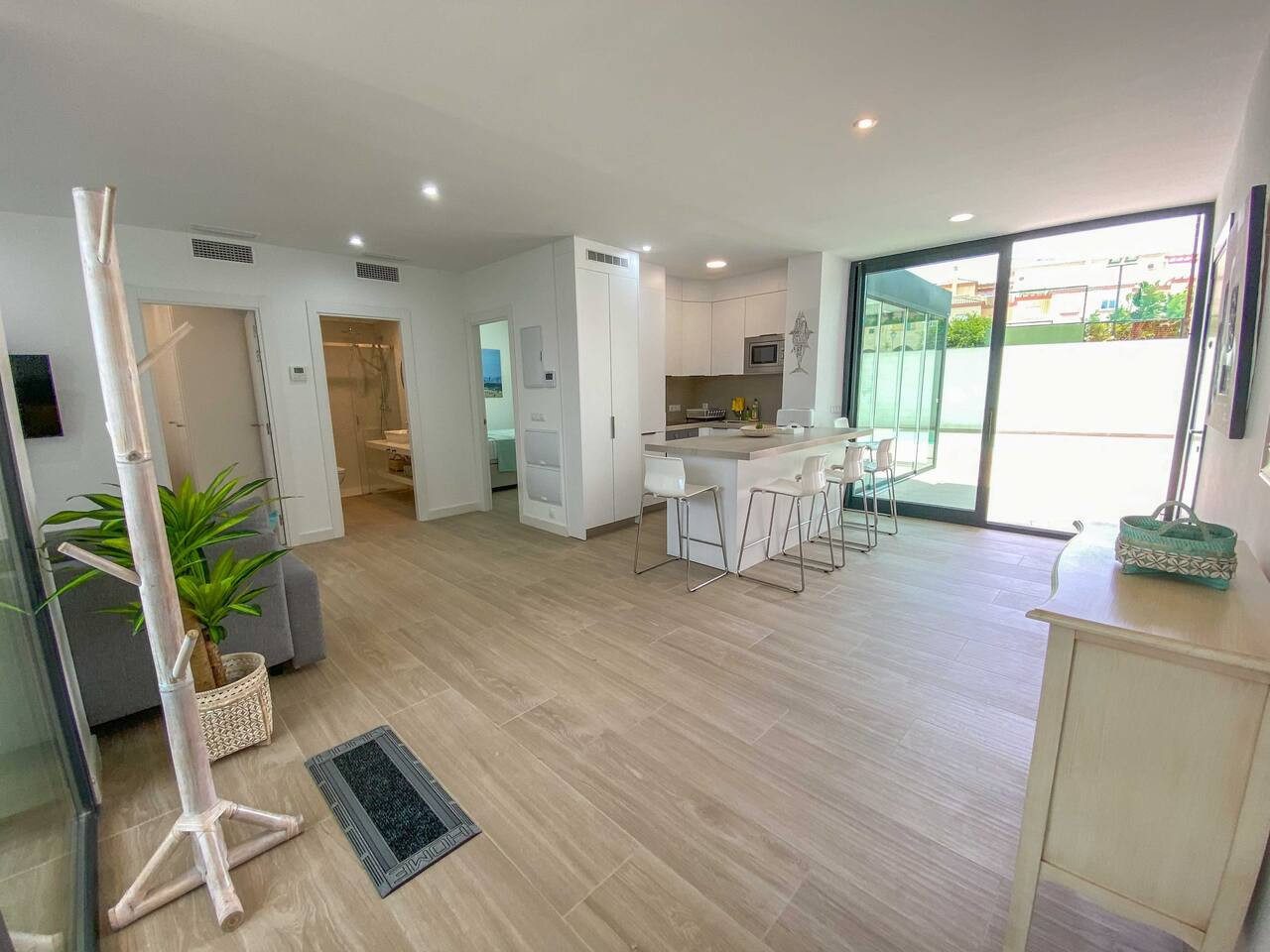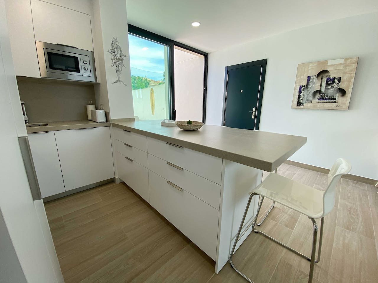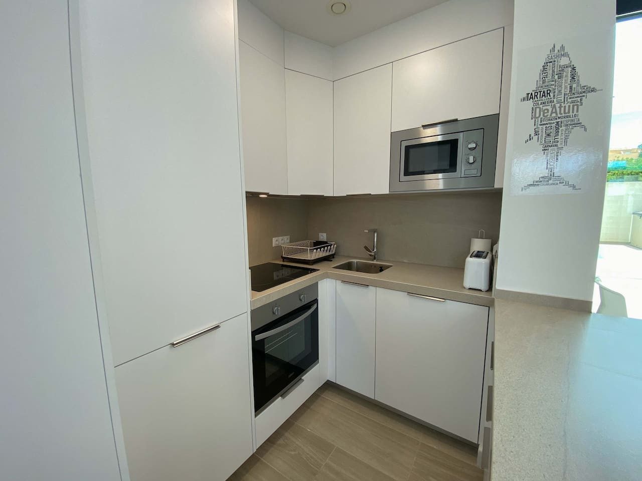 Al entrar, nos recibe un amplio salón-comedor con cocina abierta con isla y cuatro taburetes, un sofá con mesa baja y una Smart TV para disfrutar de tus series favoritas.