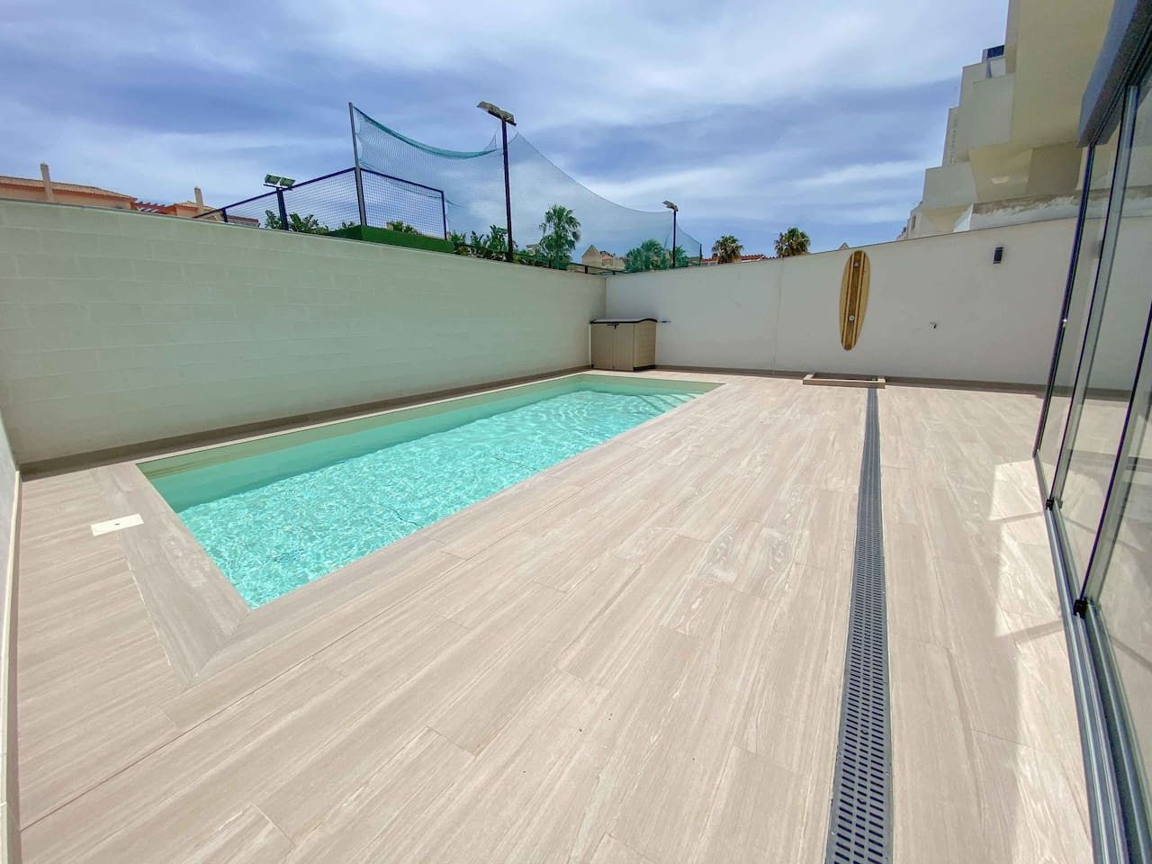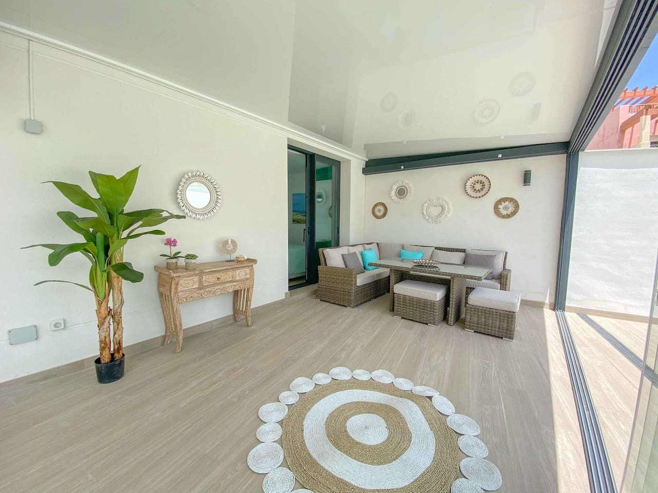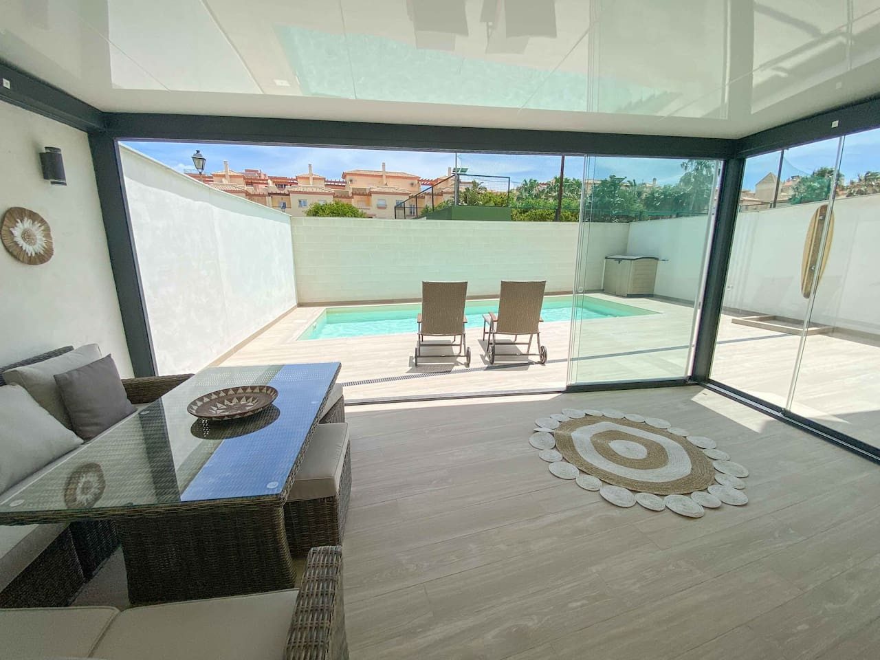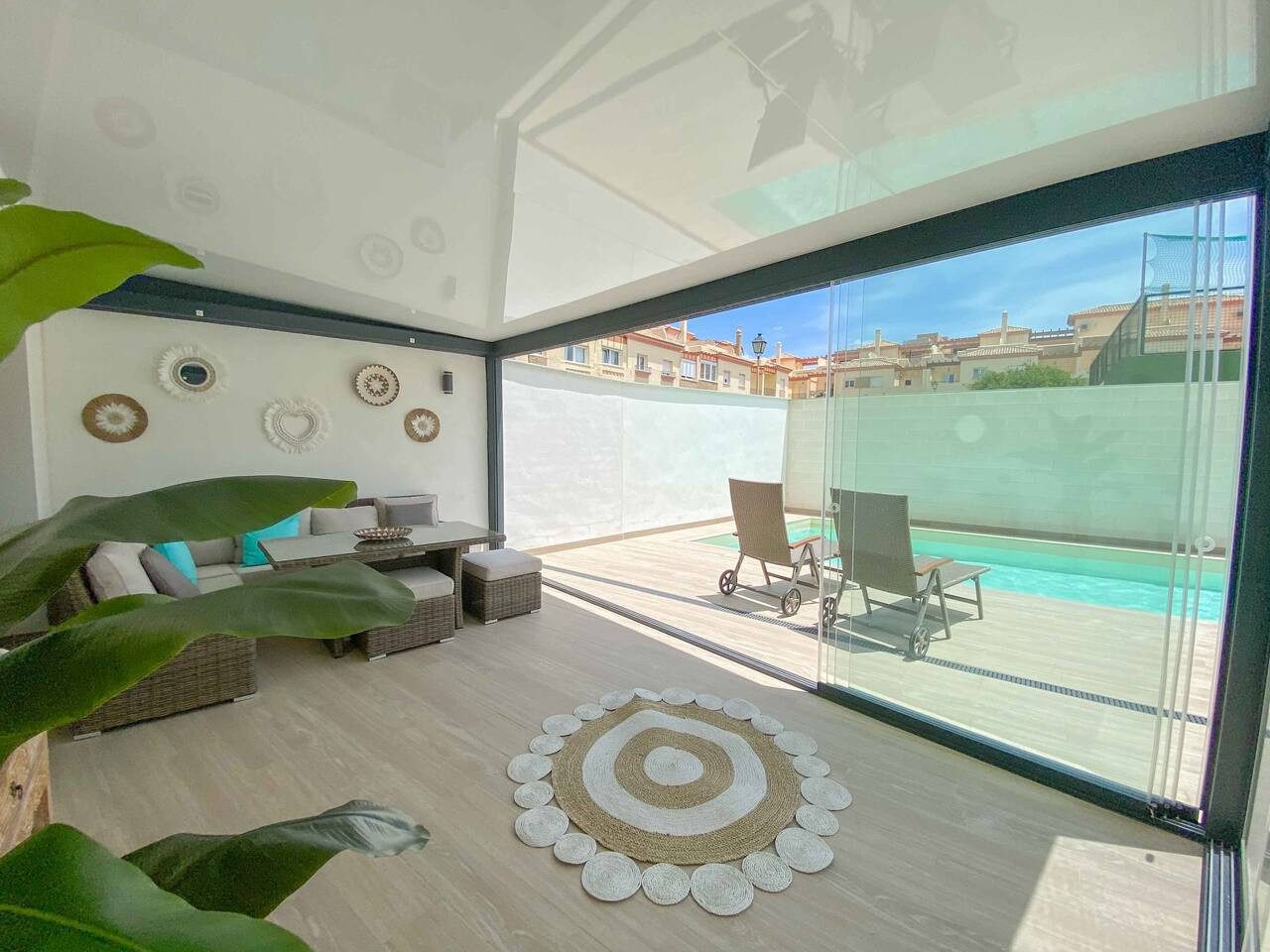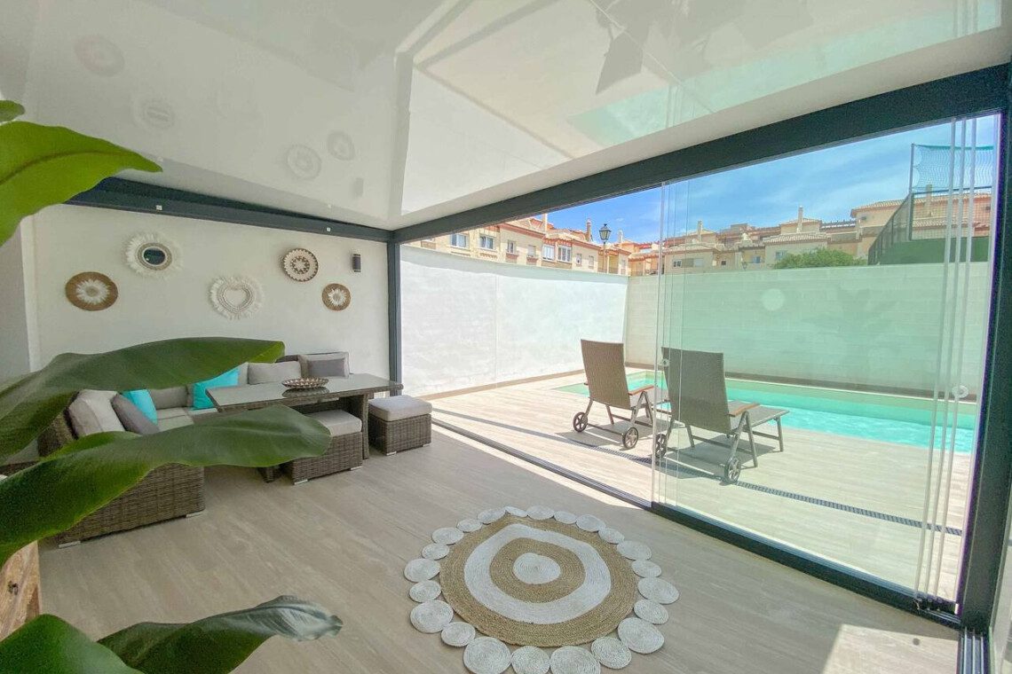 Desde el salón también se accede al solarium a través de un gran ventanal. Esta zona exterior está equipada con un salón chill-out y dos tumbonas, perfecta para relajarse, y la piscina privada permite disfrutar de un baño a cualquier hora del día.