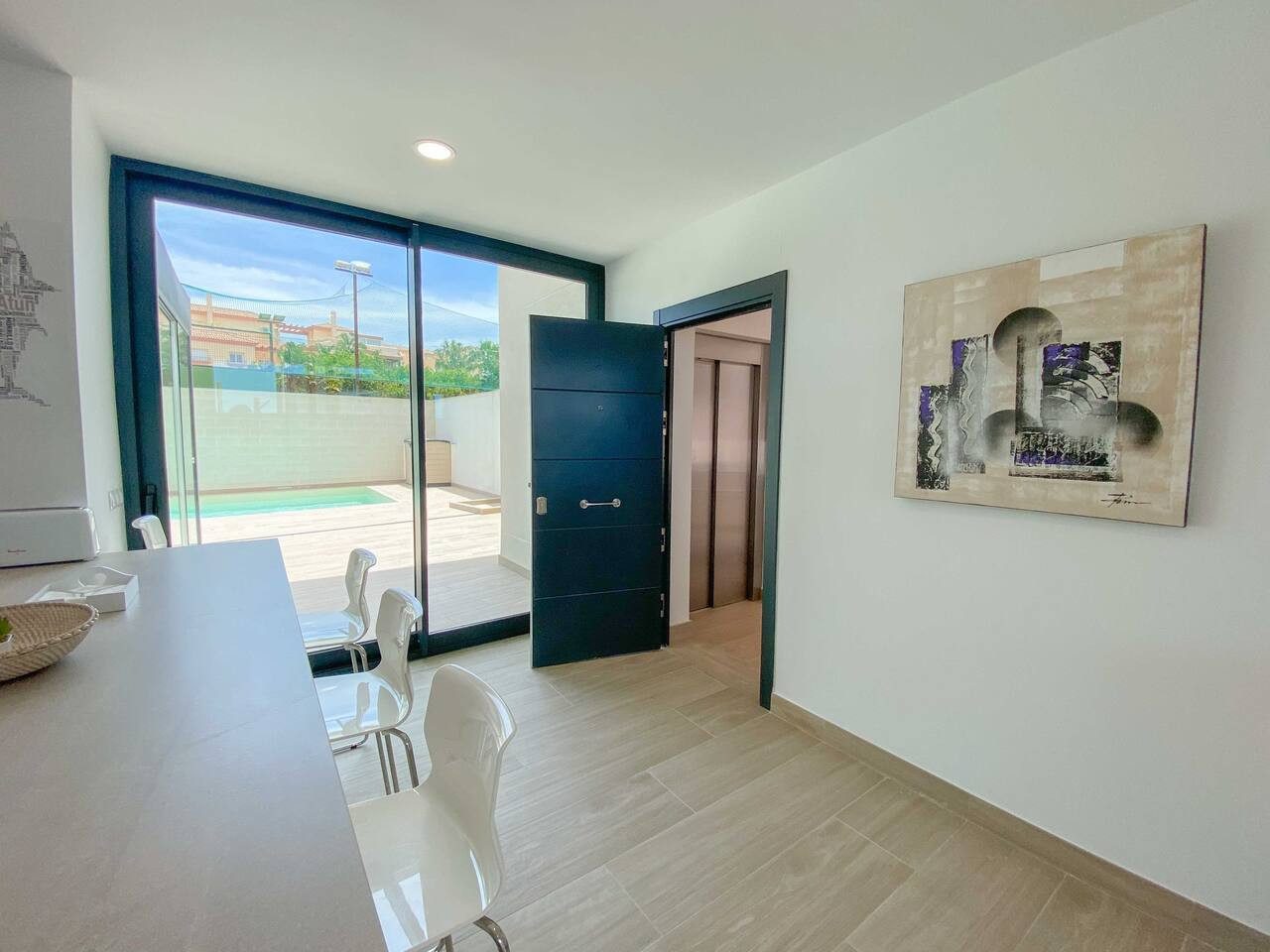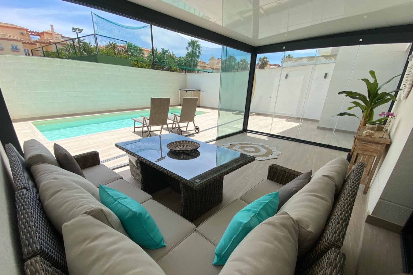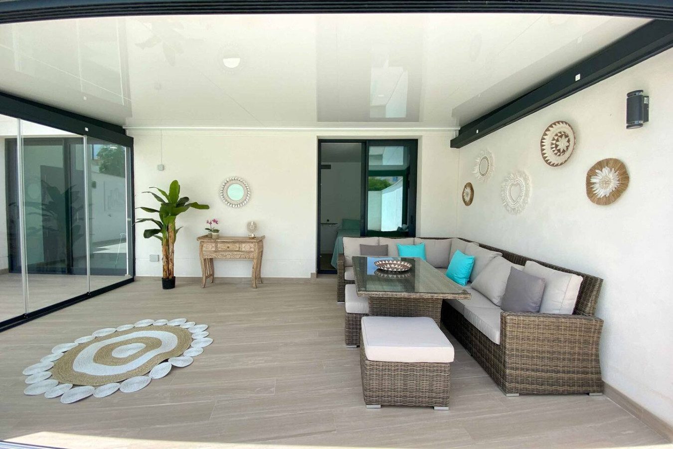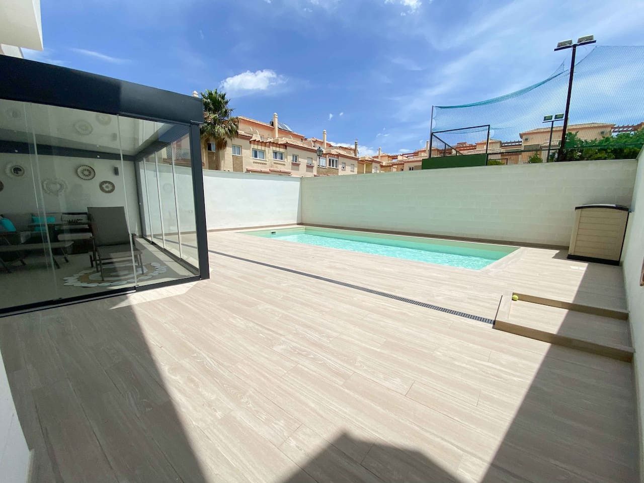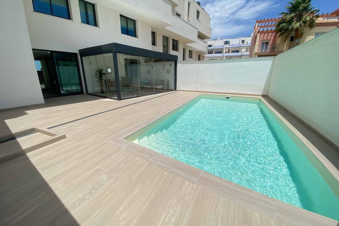 Desde el salón también se accede al solarium a través de un gran ventanal. Esta zona exterior está equipada con un salón chill-out y dos tumbonas, perfecta para relajarse, y la piscina privada permite disfrutar de un baño a cualquier hora del día.
