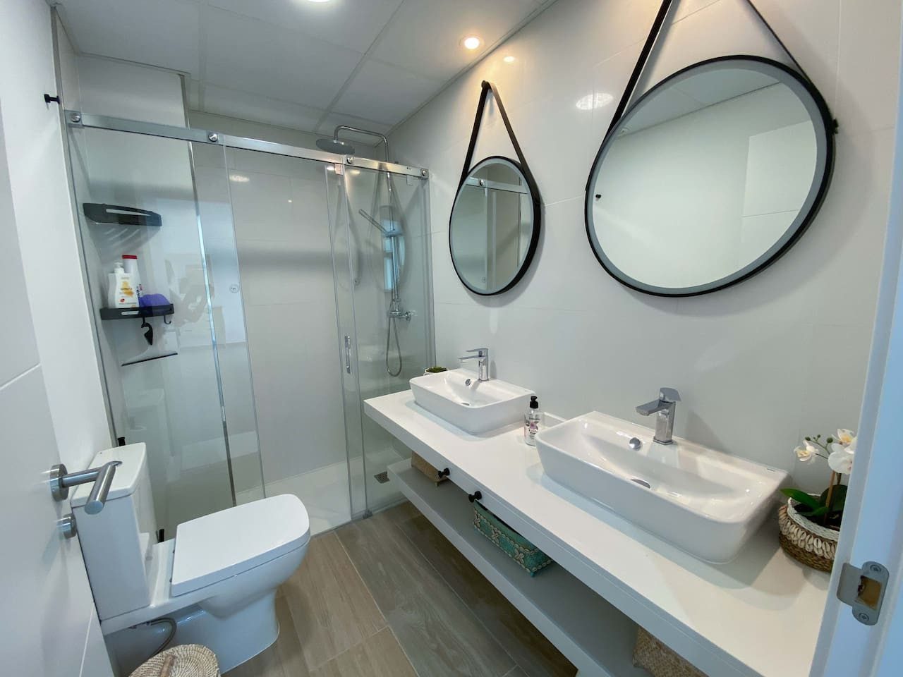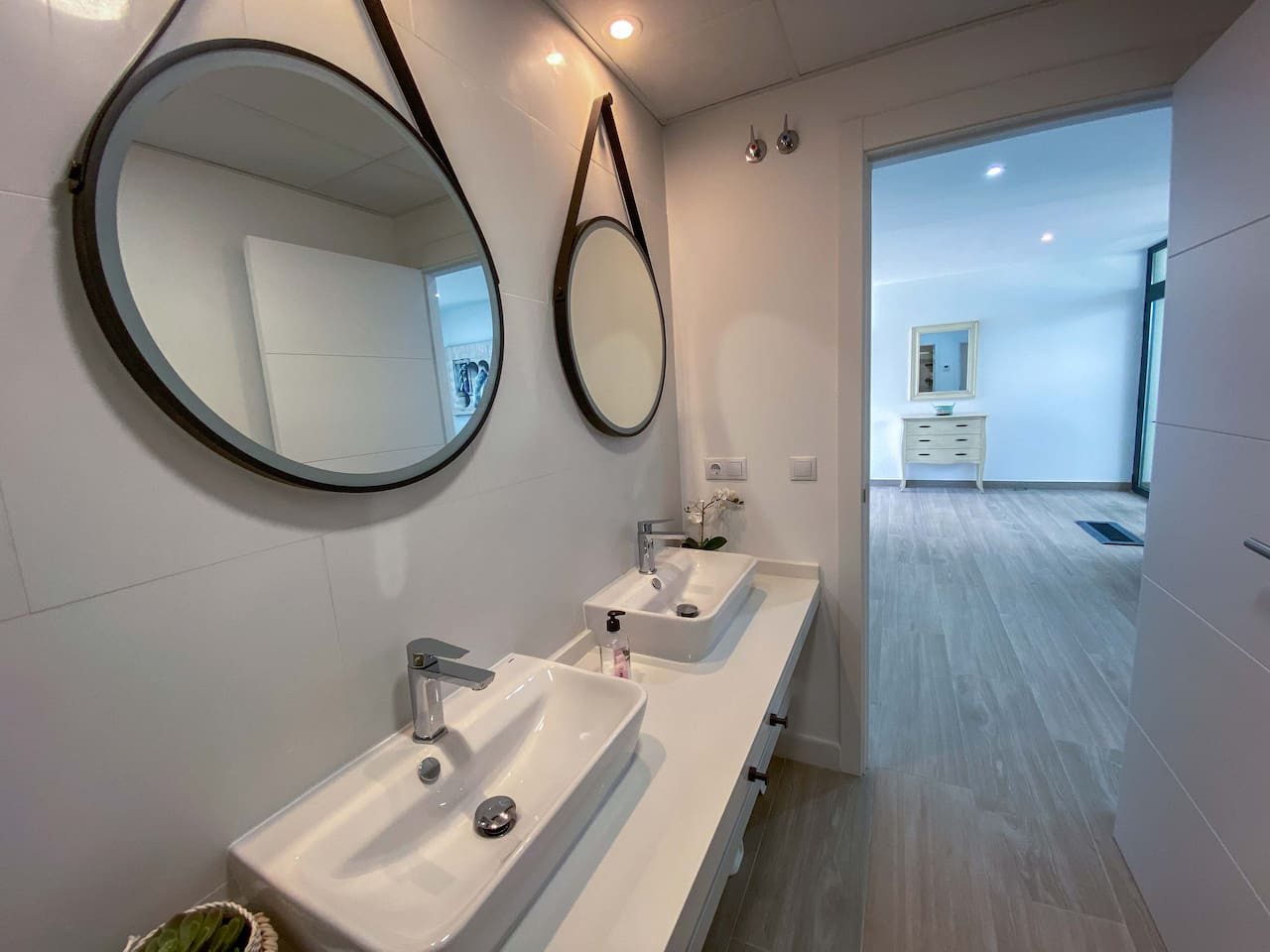 La zona de descanso cuenta con dos dormitorios y un baño completo con plato de ducha y dos lavabos. El primer dormitorio dispone de una cama de 140 cm y armario empotrado, mientras que el segundo ofrece cama de matrimonio de 150 cm, armario empotrado y acceso directo al solárium.
