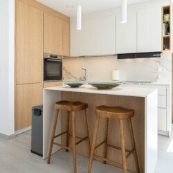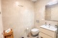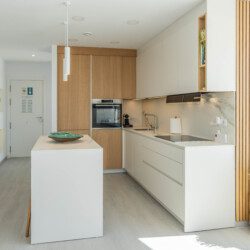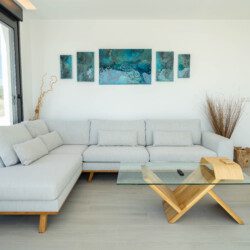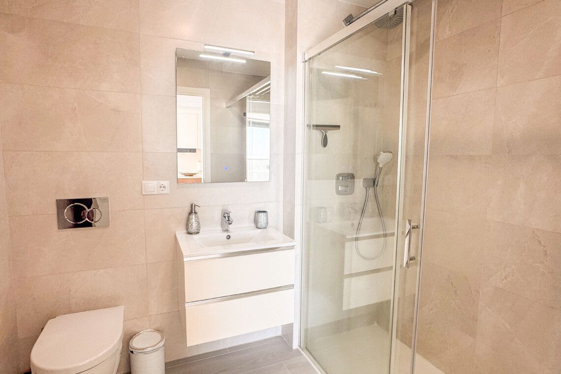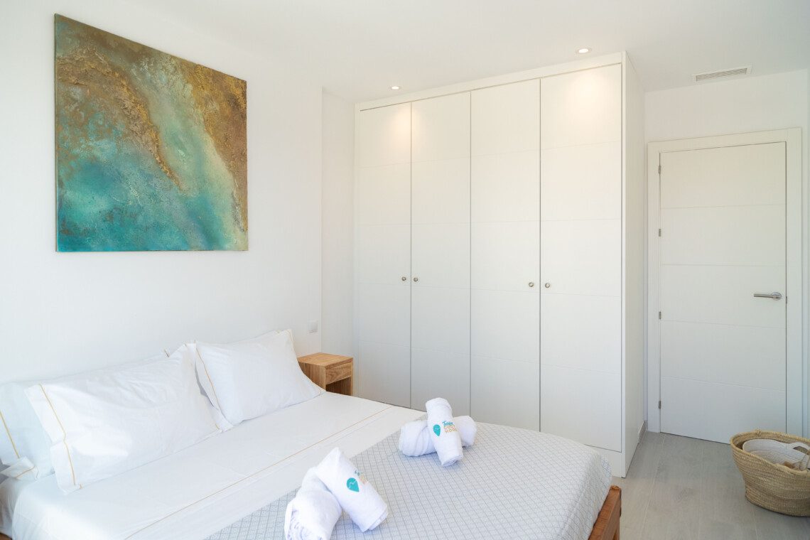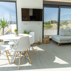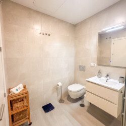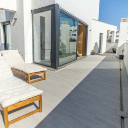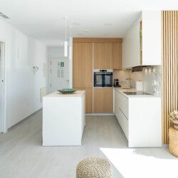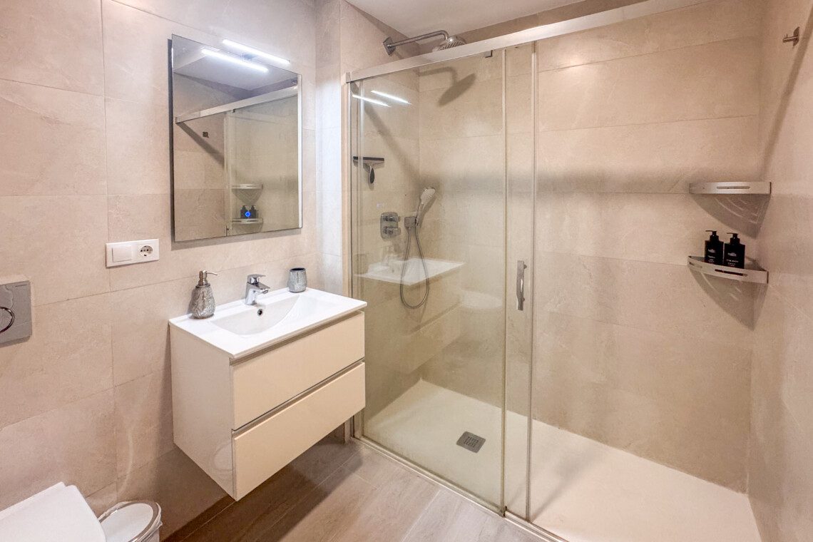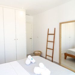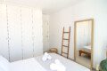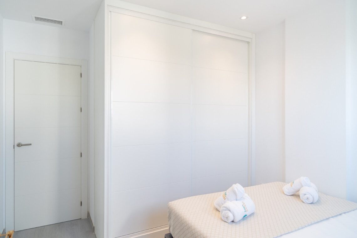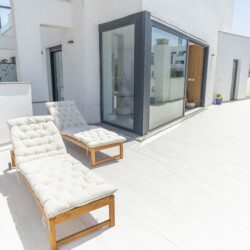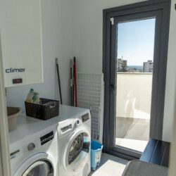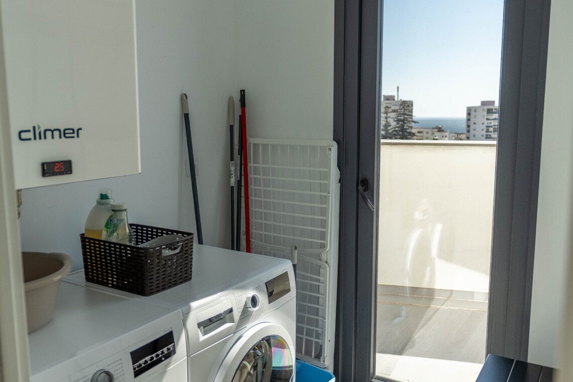 The single-story apartment stands out for its functional design and spacious, bright spaces. Upon entering, you'll find a room with a washer and dryer, followed by a living room-kitchen with an island, a sofa with a chaise longue, a Smart TV, a dining table, and direct access to the large terrace with two sun loungers.