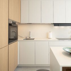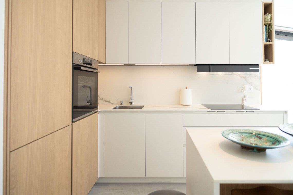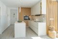 The modern, fully equipped kitchen includes a dishwasher, oven, microwave, coffee maker, toaster, and more. The two bedrooms, separated by a bathroom with a shower, feature 150 cm double beds, built-in wardrobes, and exterior windows.