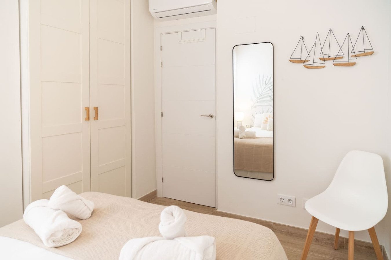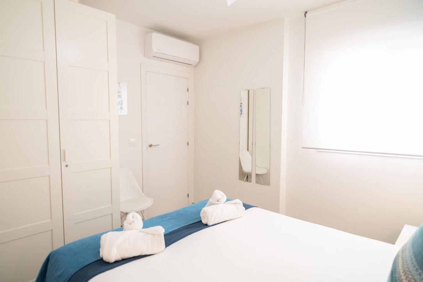 El apartamento se encuentra en una primera planta y ofrece una distribución cómoda y funcional en un único nivel. Al entrar, un pasillo conduce al primer dormitorio, equipado con una cama de 140 cm y armario empotrado. A continuación se encuentra el baño con plato de ducha y, luego, el dormitorio principal, con cama de 160 cm y su propio armario.