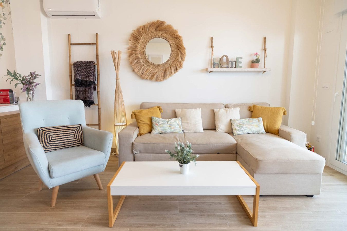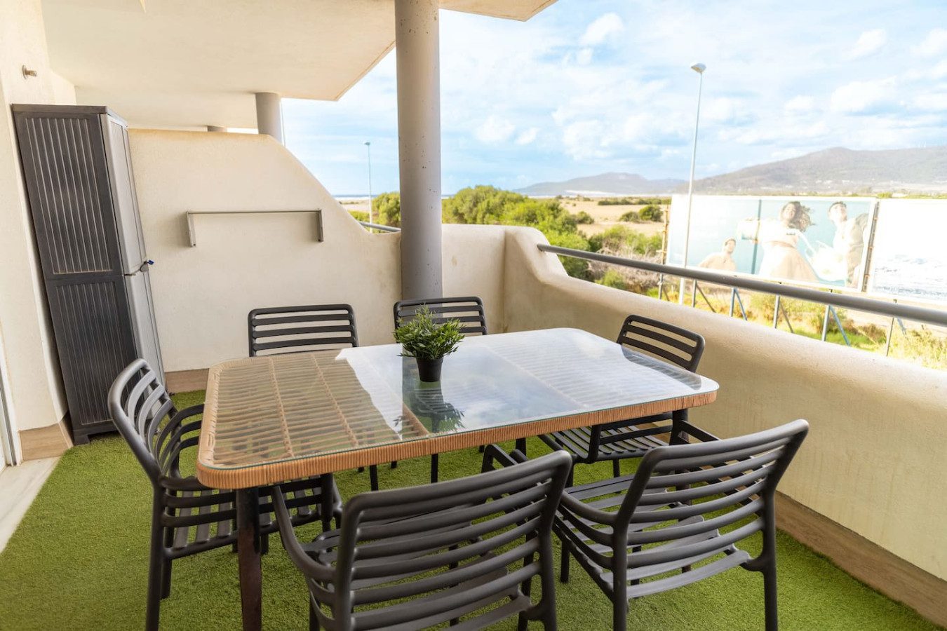 Al final del pasillo se encuentra el salón-comedor con cocina abierta, equipado con mesa para cuatro personas, sofá con chaise longue, sillón y mesa baja, junto a una Smart TV para disfrutar de tus series favoritas. Desde esta zona se accede a la terraza, con césped artificial y mesa exterior con cuatro sillas, perfecta para comer al aire libre.