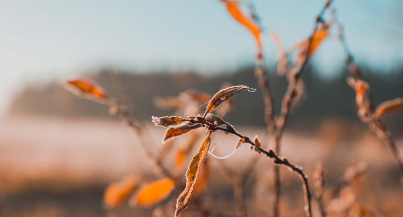 A selective focus shot of dry leaves growing on a twig with blurred background