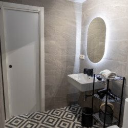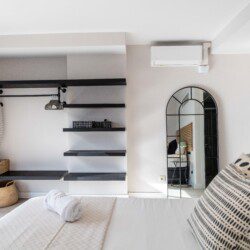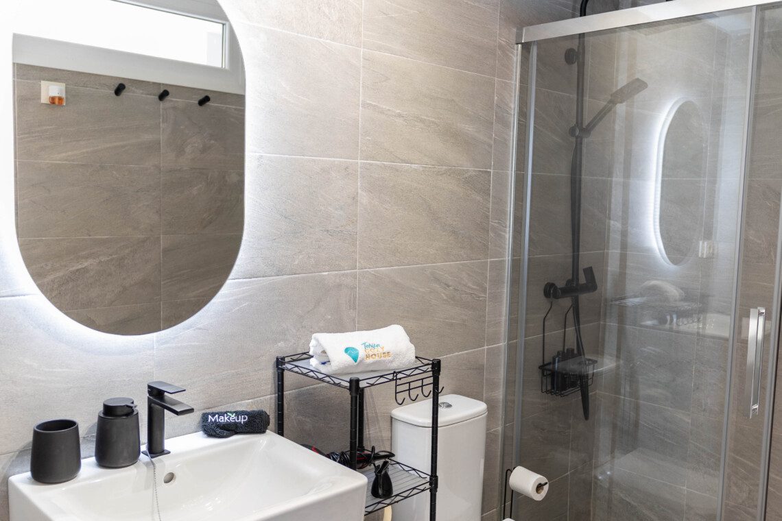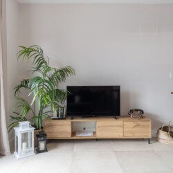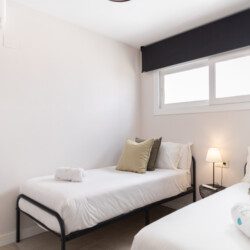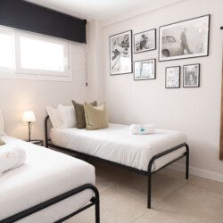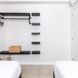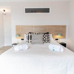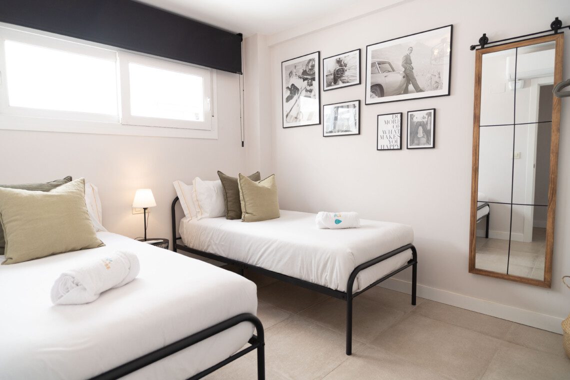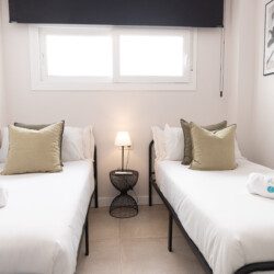 El apartamento se distribuye en dos plantas. En la planta baja se encuentran el primer dormitorio con dos camas individuales y armario abierto, un baño con plato de ducha y el dormitorio principal con cama de 150 cm, baño en suite, armario abierto y vistas a la playa de Los Lances, que podrás contemplar tumbado desde la cama. Todas las estancias cuentan con aire acondicionado frío/calor.