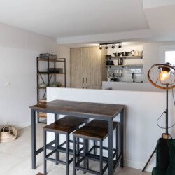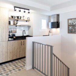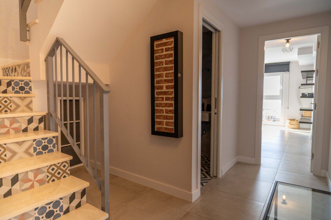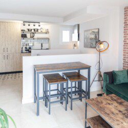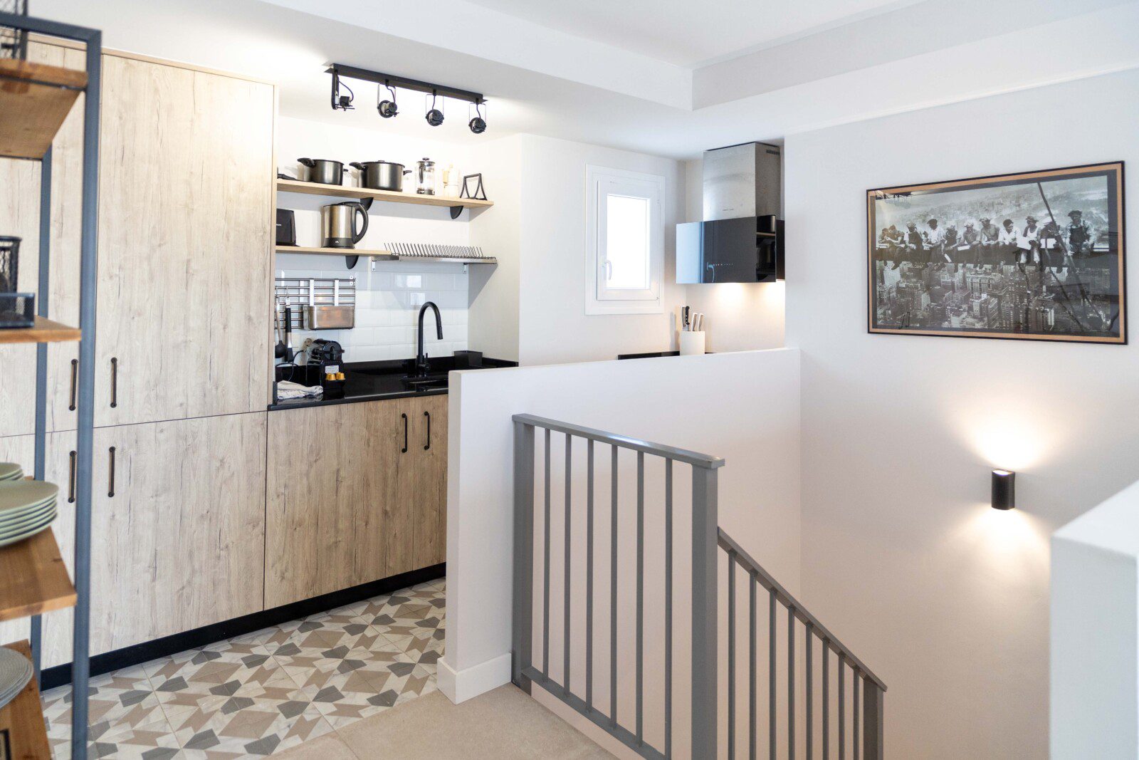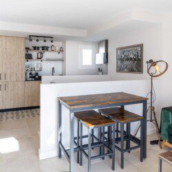 Subiendo por escaleras, la primera planta alberga la cocina totalmente equipada y un pequeño salón con mesa baja y alta con taburetes, además de Smart TV para disfrutar de tus series favoritas. Desde aquí se accede a la terraza, la joya de la casa, con mobiliario exterior y mesa para comer al aire libre.