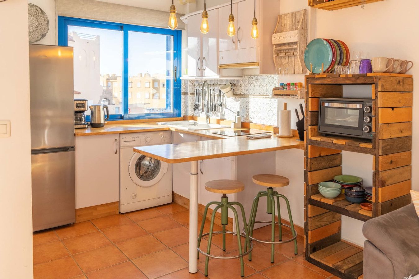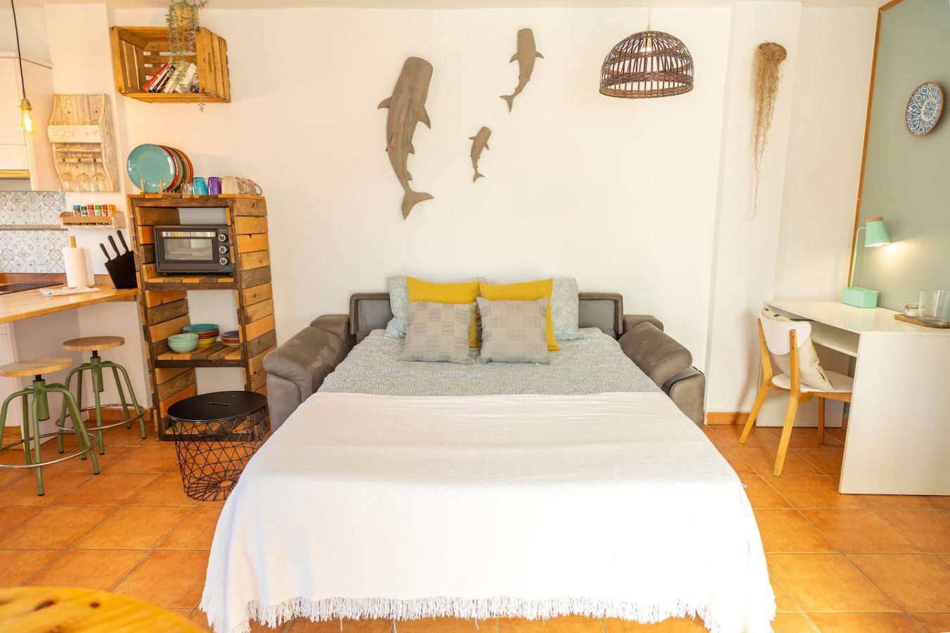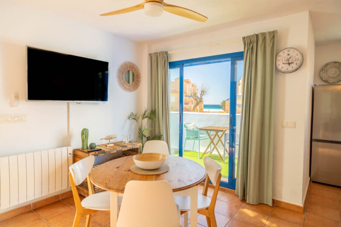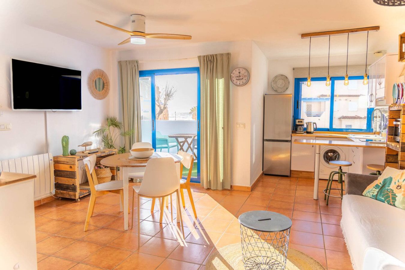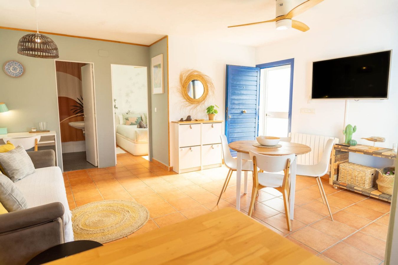 El apartamento se encuentra en una primera planta, accesible mediante un tramo de escaleras, y ofrece una distribución cómoda y funcional en un único nivel. Al entrar, nos recibe un salón-comedor integrado con la cocina abierta, equipada con barra y dos taburetes, una mesa para cuatro personas y un sofá cama con mesa baja. El sofá, de cómoda apertura italiana, cuenta con un colchón de 140 cm. Además, el espacio incluye una Smart TV para disfrutar de tus series favoritas y un escritorio ideal para teletrabajar.