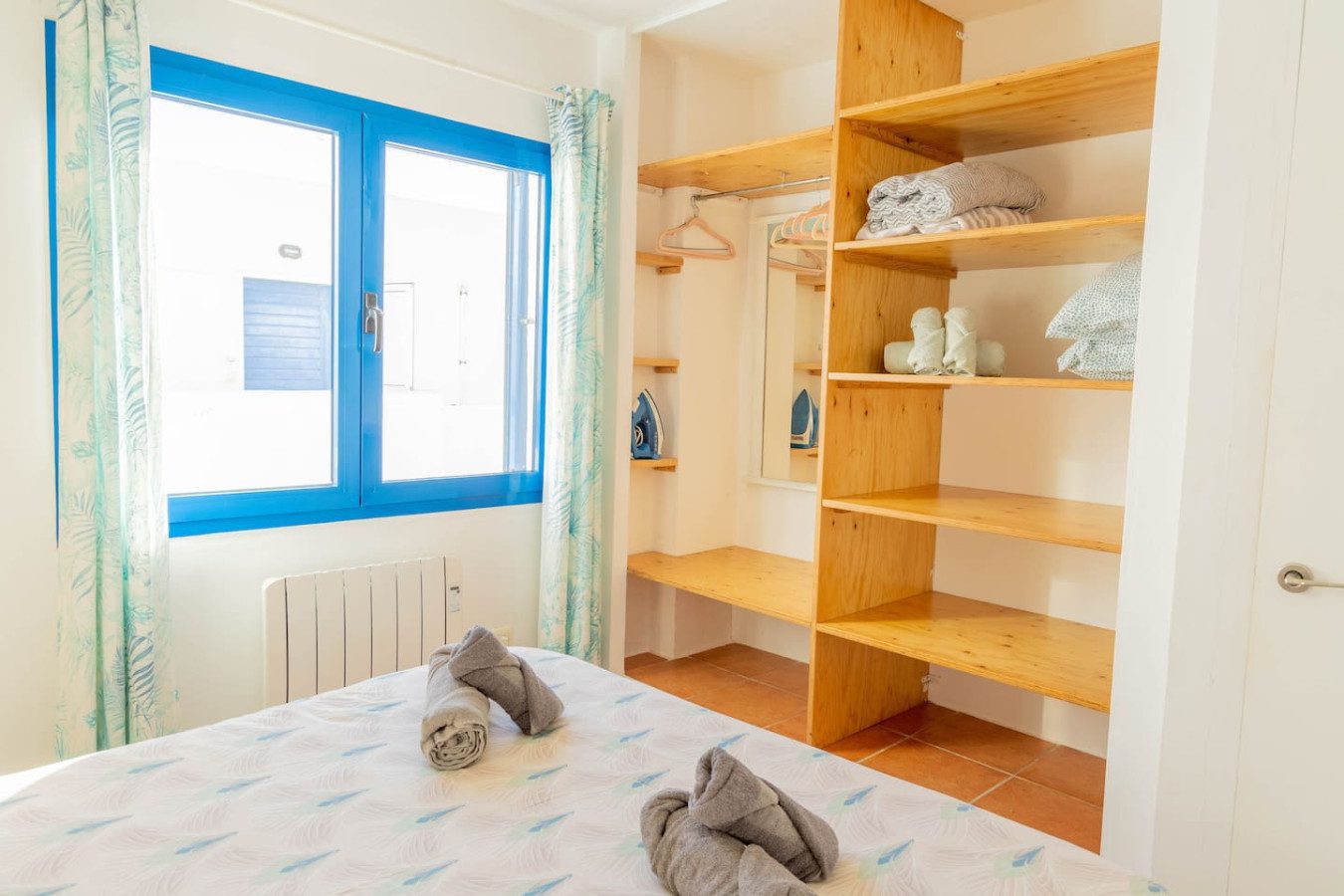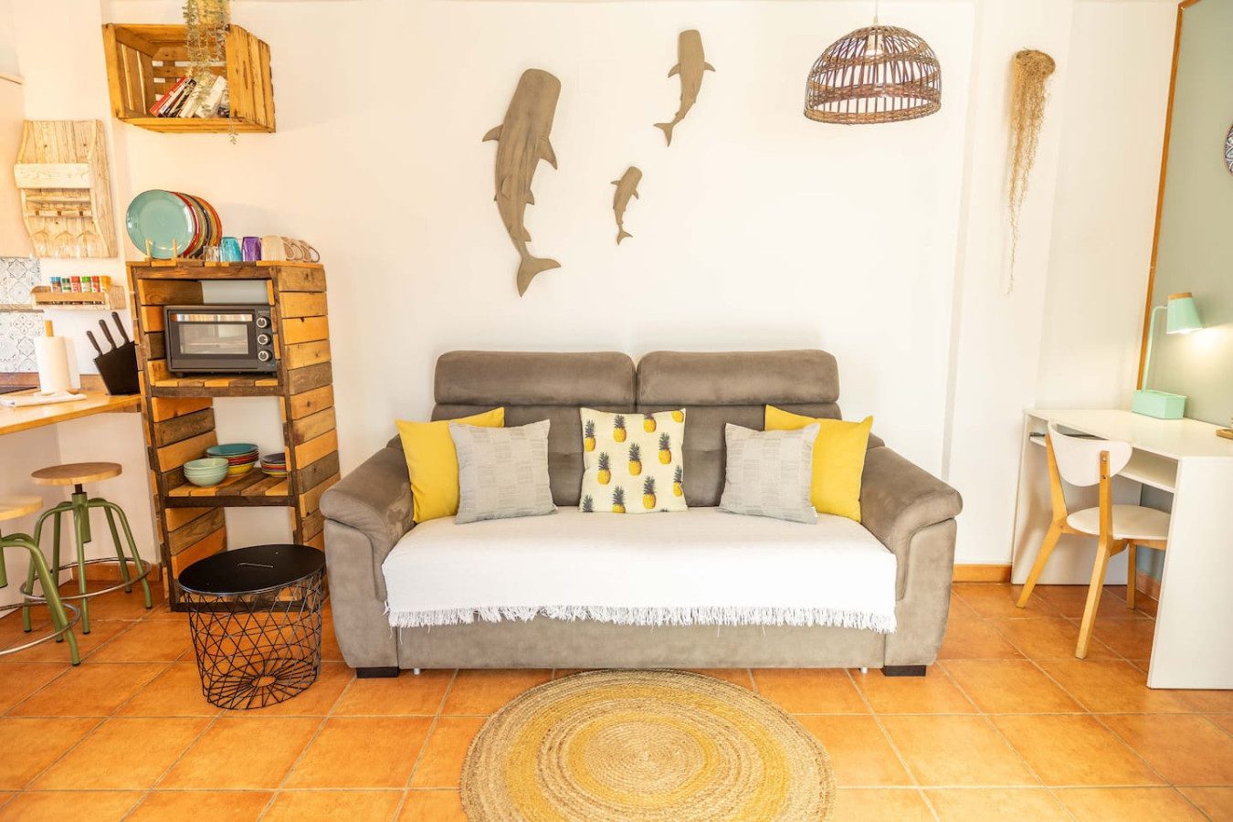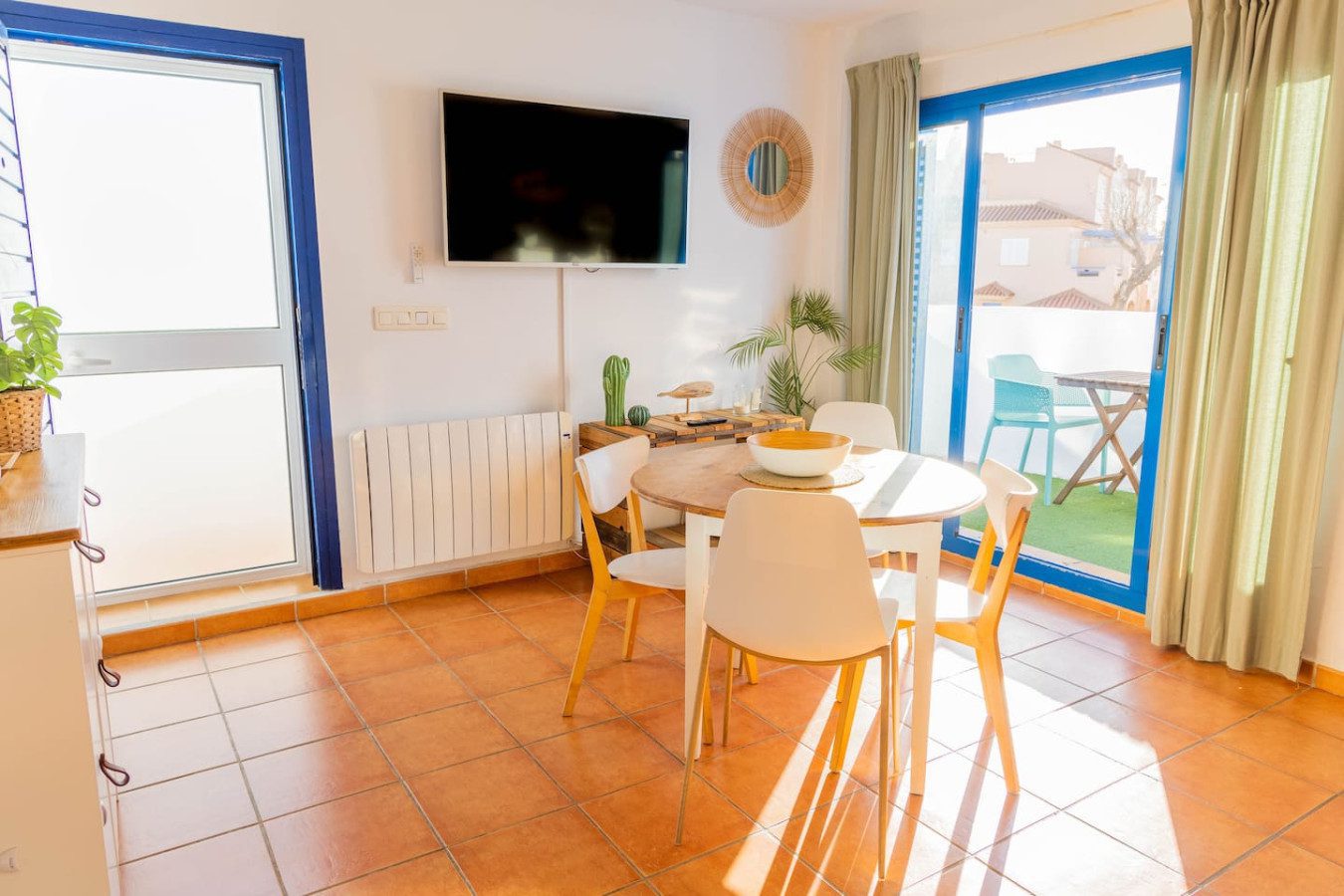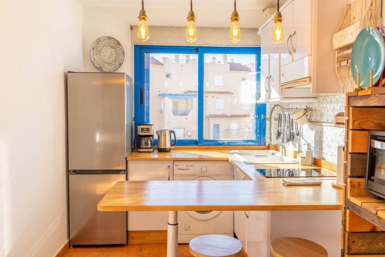 El apartamento se encuentra en una primera planta, accesible mediante un tramo de escaleras, y ofrece una distribución cómoda y funcional en un único nivel. Al entrar, nos recibe un salón-comedor integrado con la cocina abierta, equipada con barra y dos taburetes, una mesa para cuatro personas y un sofá cama con mesa baja. El sofá, de cómoda apertura italiana, cuenta con un colchón de 140 cm. Además, el espacio incluye una Smart TV para disfrutar de tus series favoritas y un escritorio ideal para teletrabajar.