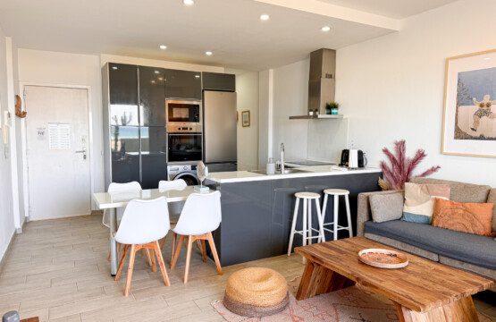 El apartamento está ubicado en la primera planta (se accede subiendo un pequeño tramo de escaleras) y está distribuido en una sola planta, pensada para tu comodidad. El espacio principal integra salón, comedor y cocina, y se abre a una terraza privada con vistas directas al océano Atlántico. Imagina disfrutar de un desayuno con la brisa marina, una cena al atardecer o simplemente una copa de vino con el mar como compañía.