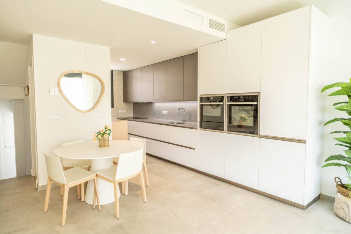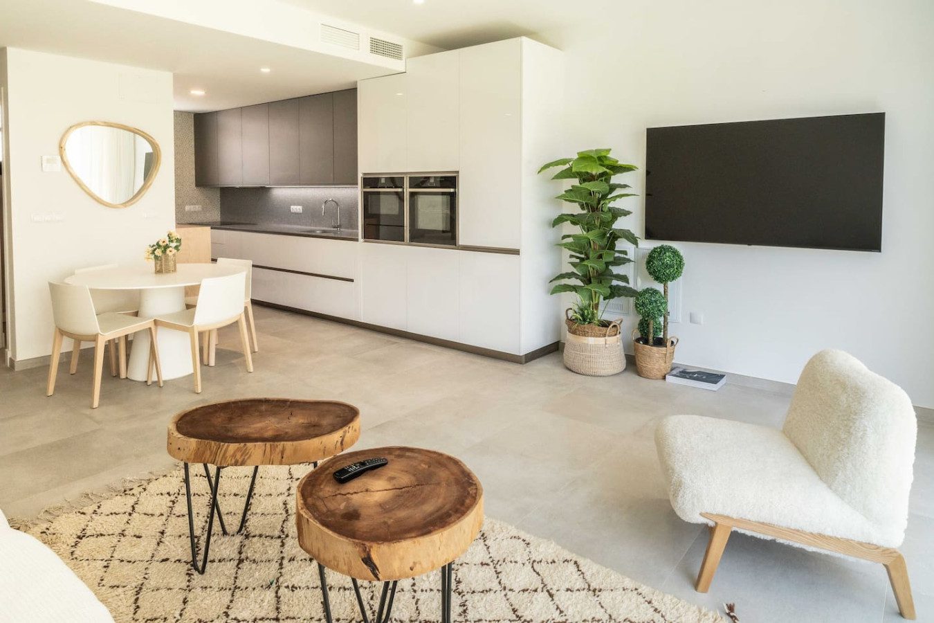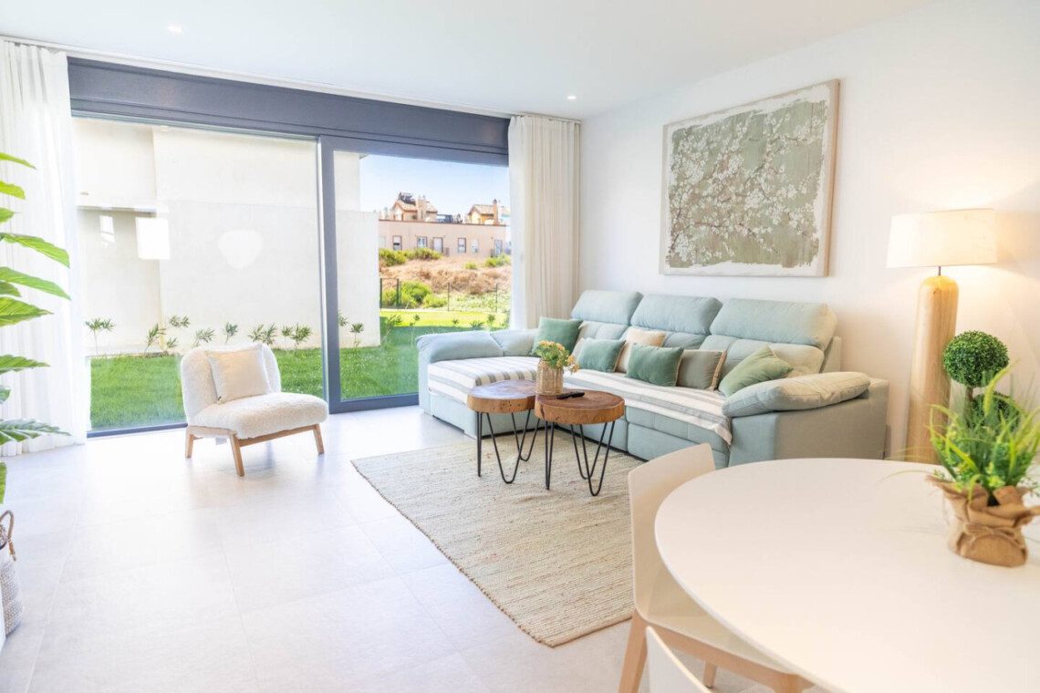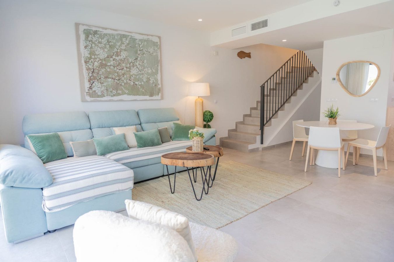 Al entrar, un tramo de escaleras nos conduce al salón-comedor con cocina abierta. El espacio incluye mesa para cinco personas, un sillón y un sofá con mesa baja frente a una gran Smart TV, ideal para relajarte y disfrutar de tus series favoritas. Un ventanal conecta el salón con un jardín público. La lujosa cocina, de la prestigiosa marca Porcelanosa, está equipada con materiales de alta calidad y una barra con dos bancos. También encontrarás un baño completo con ducha en esta planta.