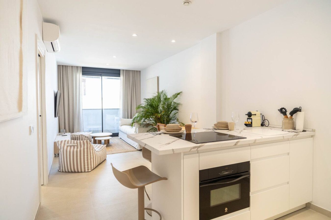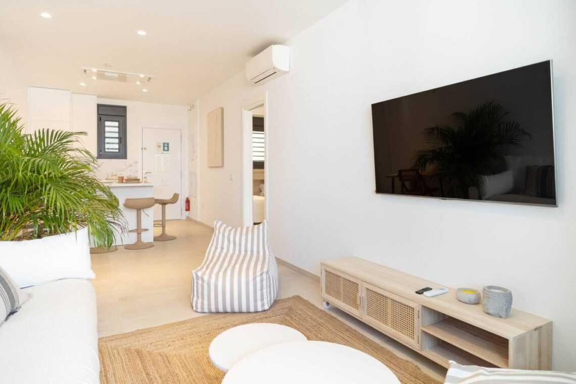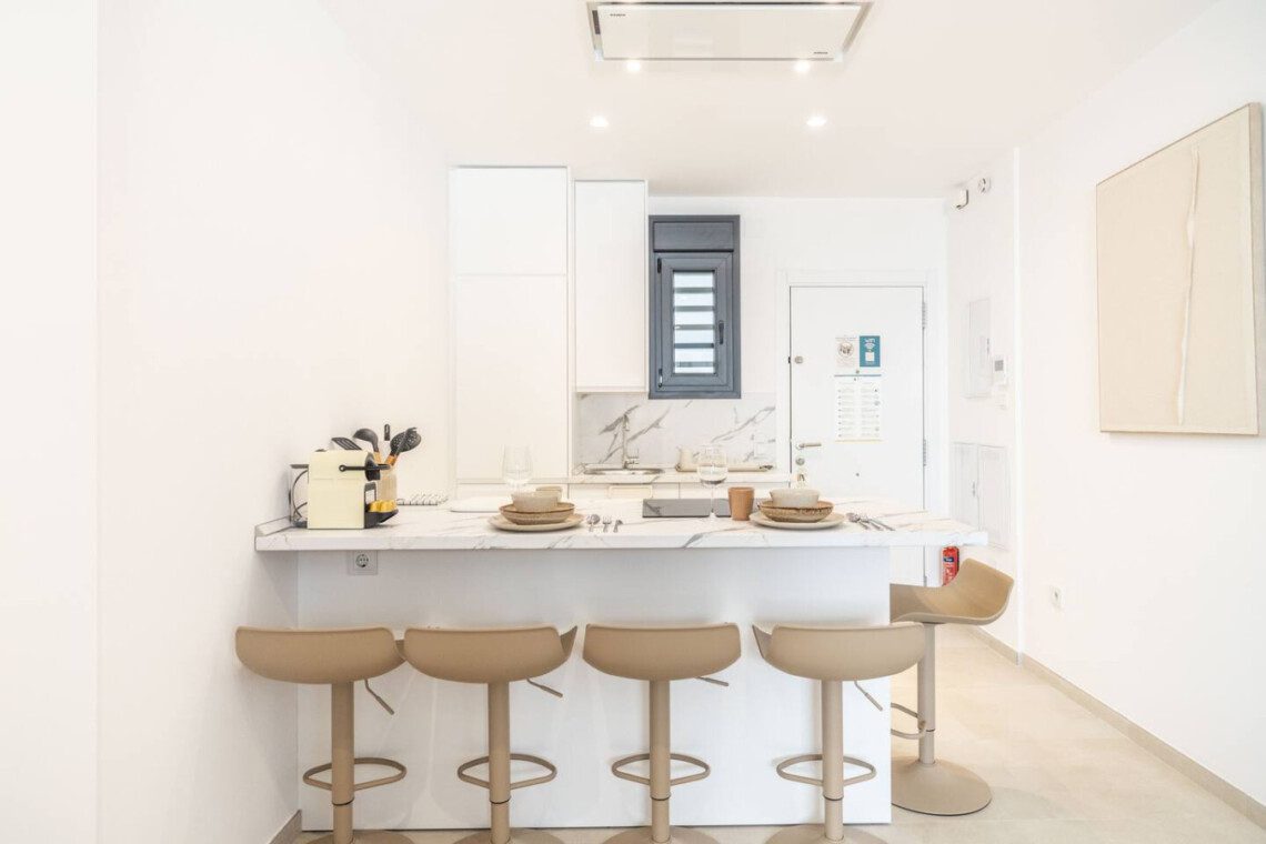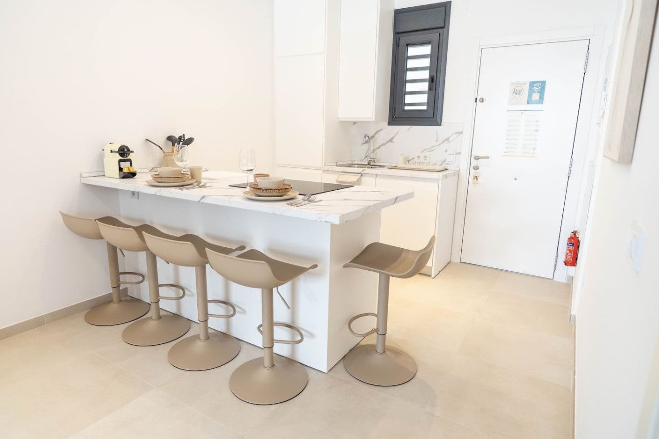 El apartamento se encuentra en una segunda planta y ofrece una distribución cómoda y funcional en un único nivel. Al entrar, nos recibe un salón-comedor con cocina abierta con isla y cuatro taburetes, un escritorio y un cómodo sofá con mesita y Smart TV para disfrutar de tus series favoritas.