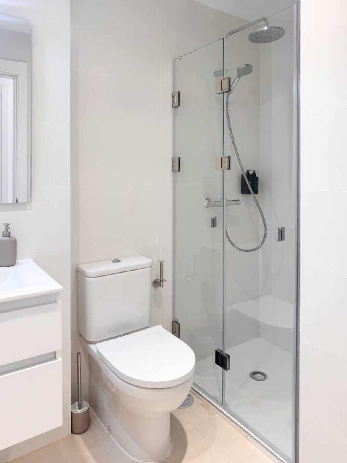 Desde el salón se accede a la zona de descanso, que cuenta con un baño completo con ducha y dos dormitorios: uno con cama de matrimonio king size de 180 cm y armario empotrado, y otro con dos camas individuales de 90 cm, también con armario empotrado.