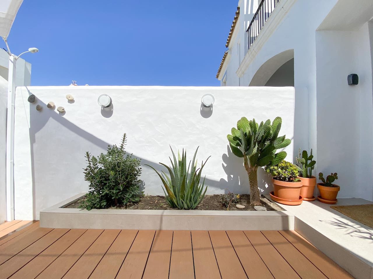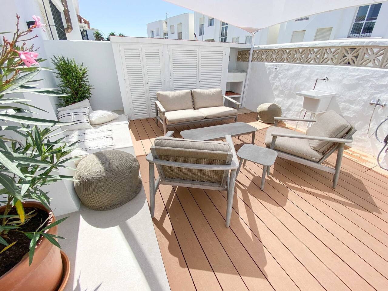 Este adosado, con capacidad para 4 personas, tiene entrada independiente desde la calle y se distribuye en 2 plantas combinando funcionalidad y estilo en cada rincón. Al llegar, un encantador patio con plantas te da la bienvenida, equipado con un salón exterior y mesa baja para disfrutar de comidas al aire libre. También encontrarás muebles para almacenar tu equipo de kitesurf.
