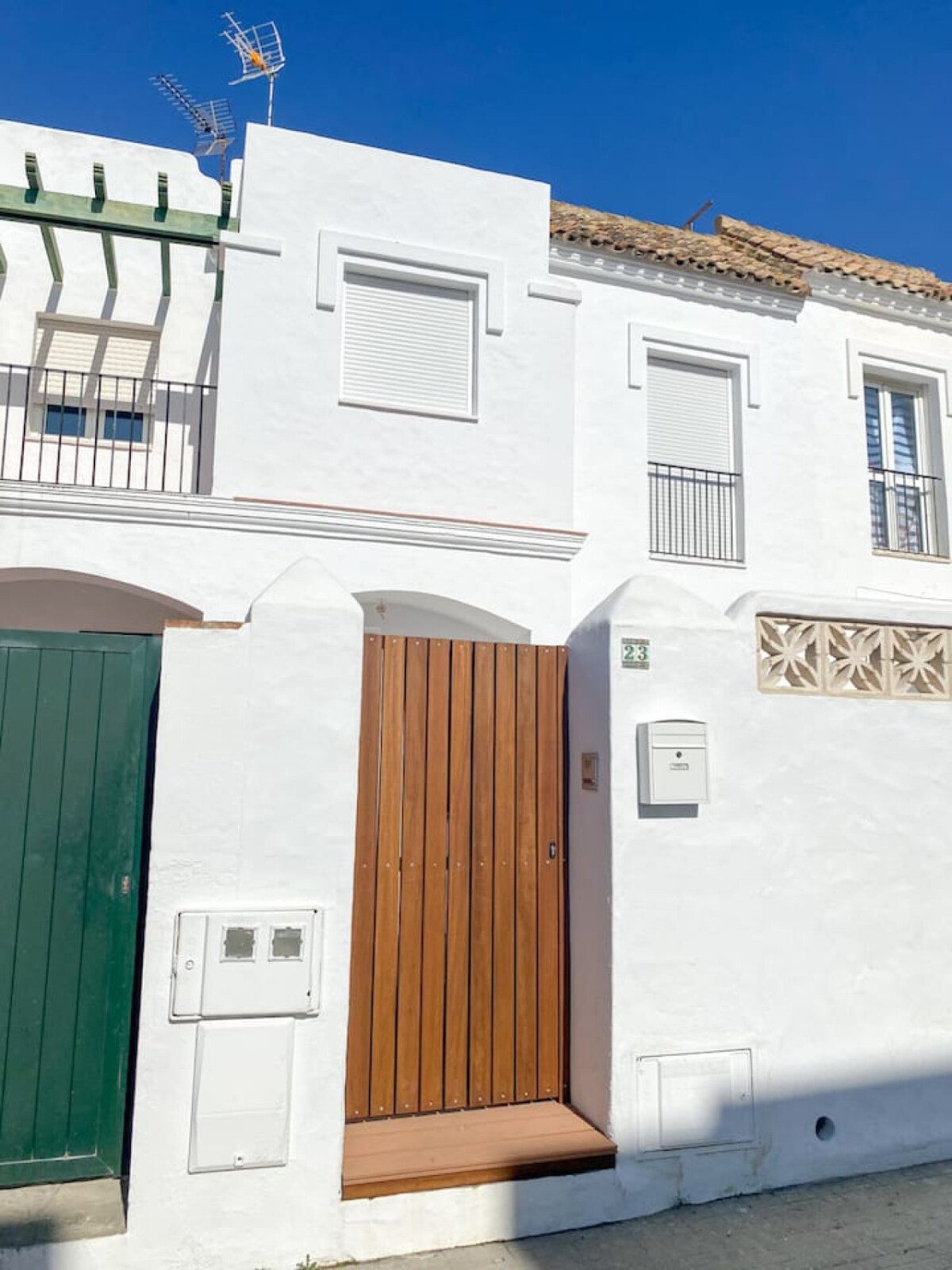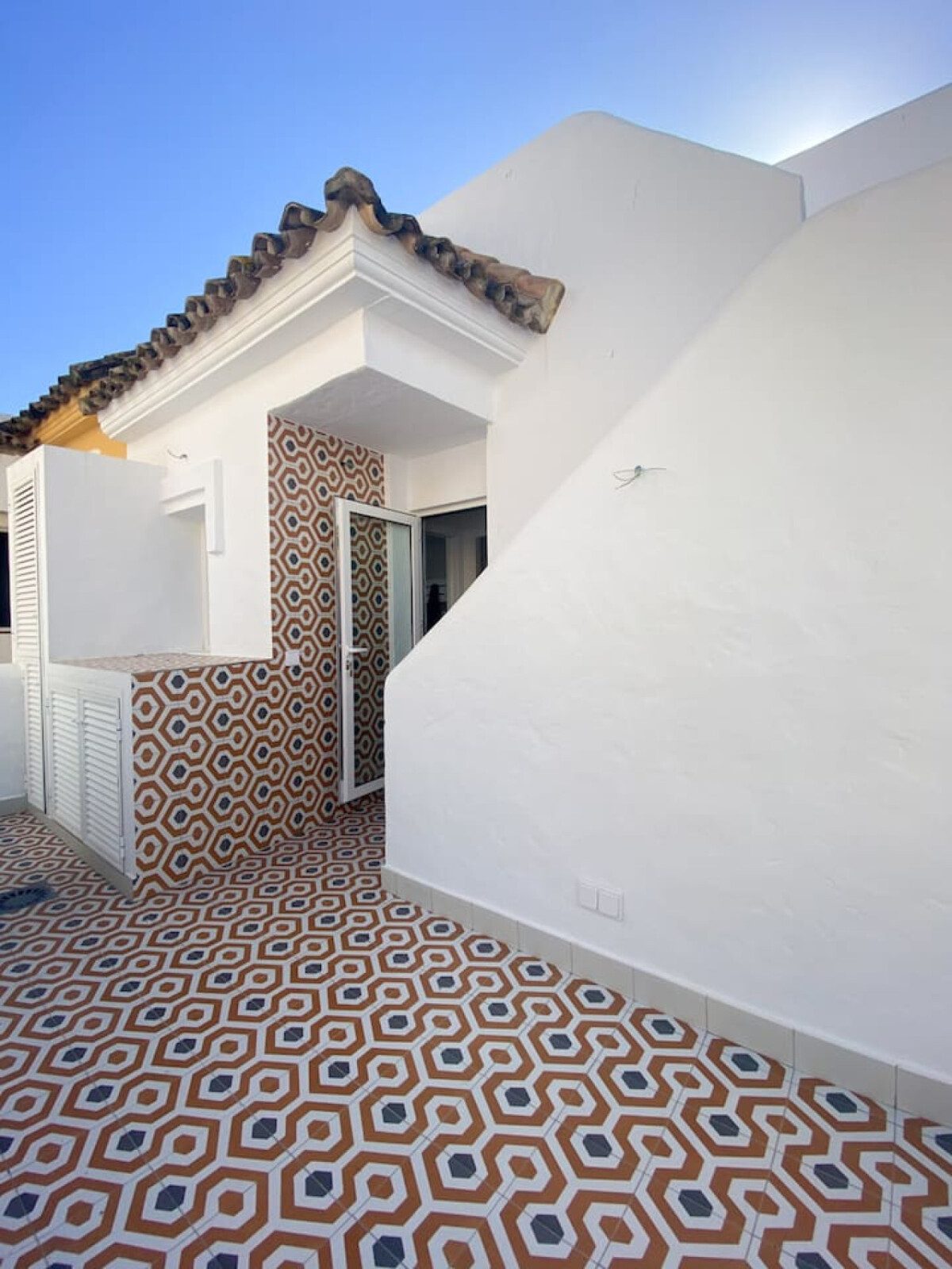 Subiendo por la escalera de caracol se accede a la zona de descanso: el primer dormitorio ofrece cama de 140 cm, armario abierto y un sofá, mientras que el segundo dormitorio tiene cama de 160 cm y armario empotrado. También hay un baño completo con ducha italiana. Desde aquí se accede a un segundo patio con lavadora/secadora y, mediante unas escaleras exteriores, a la terraza en la azotea con mesa y sillas, perfecta para disfrutar de vistas parciales al mar y a Marruecos.