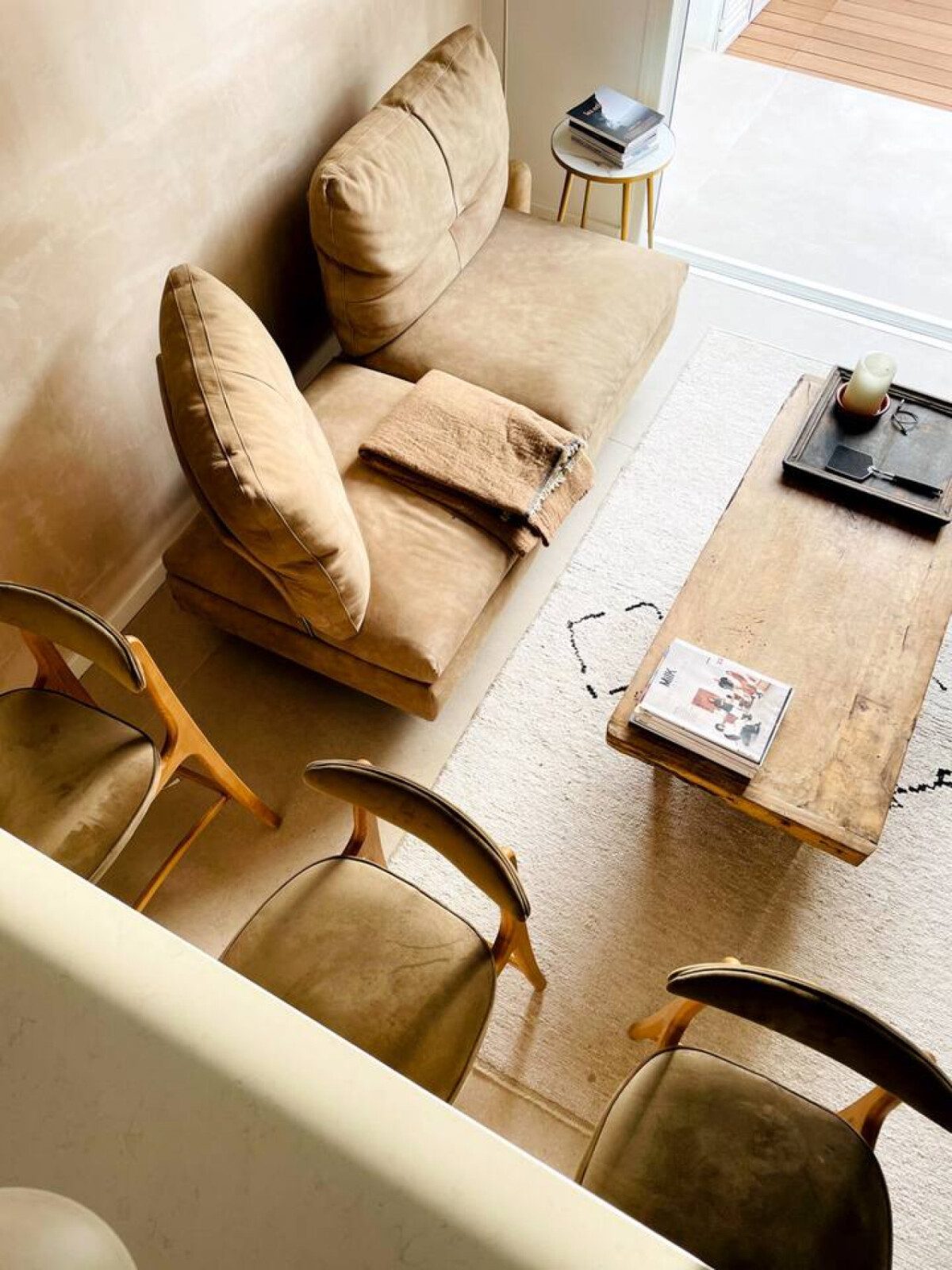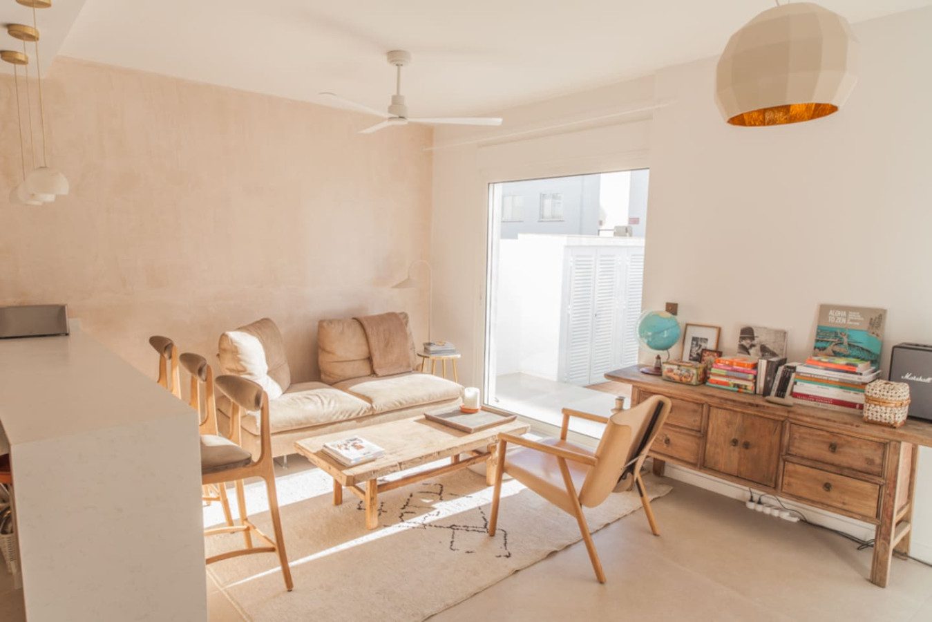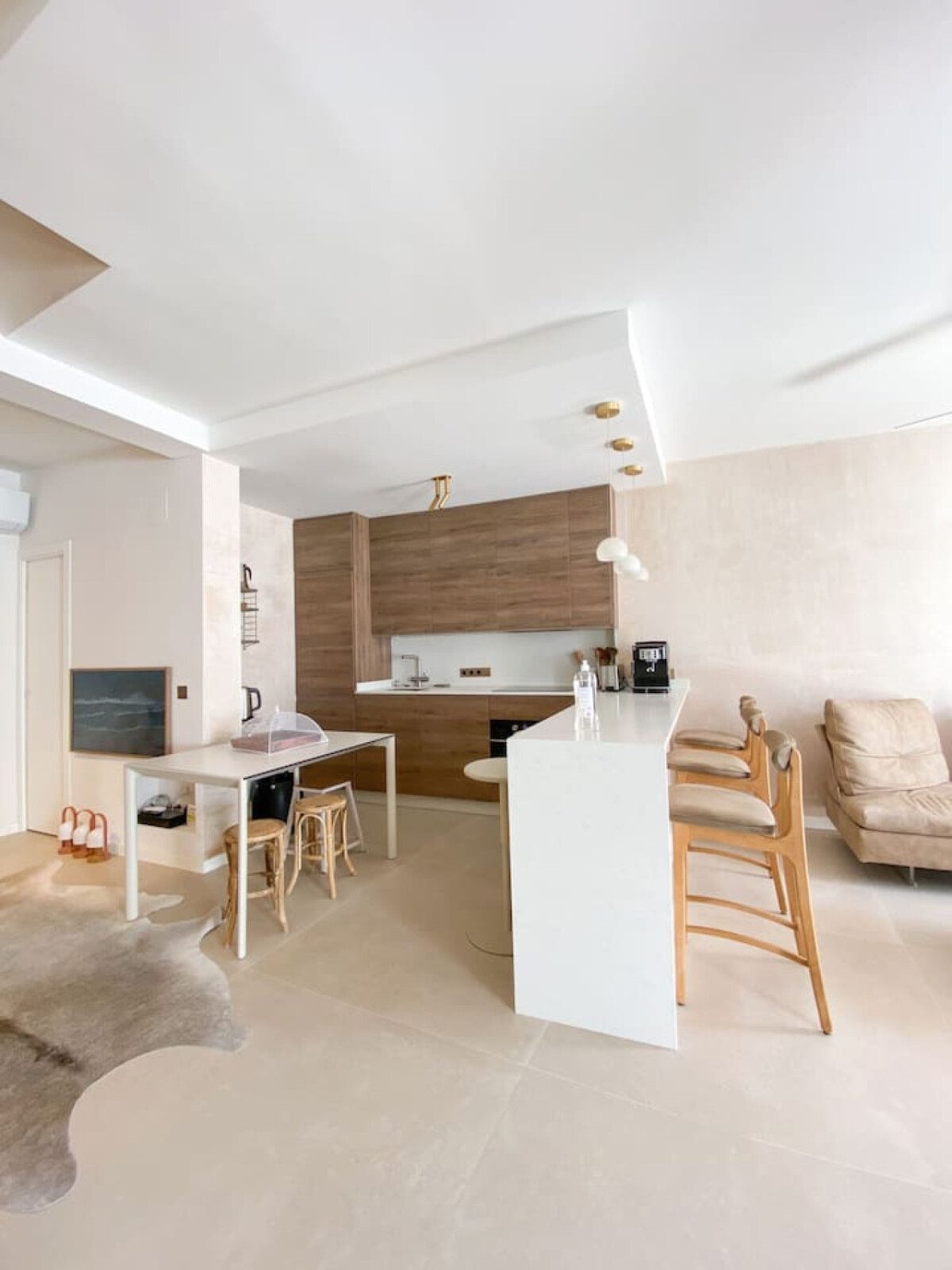 Al entrar, un luminoso salón-comedor con cocina abierta te recibe: la barra con cinco taburetes altos y la mesa de comedor con taburetes bajos crean un espacio ideal para comer o trabajar, mientras que un cómodo sofá con mesa baja y sillón invita a relajarte. El salón conecta con el exterior a través de un gran ventanal, convirtiéndose en el corazón de la casa: perfecto para leer, compartir una copa o simplemente descansar.