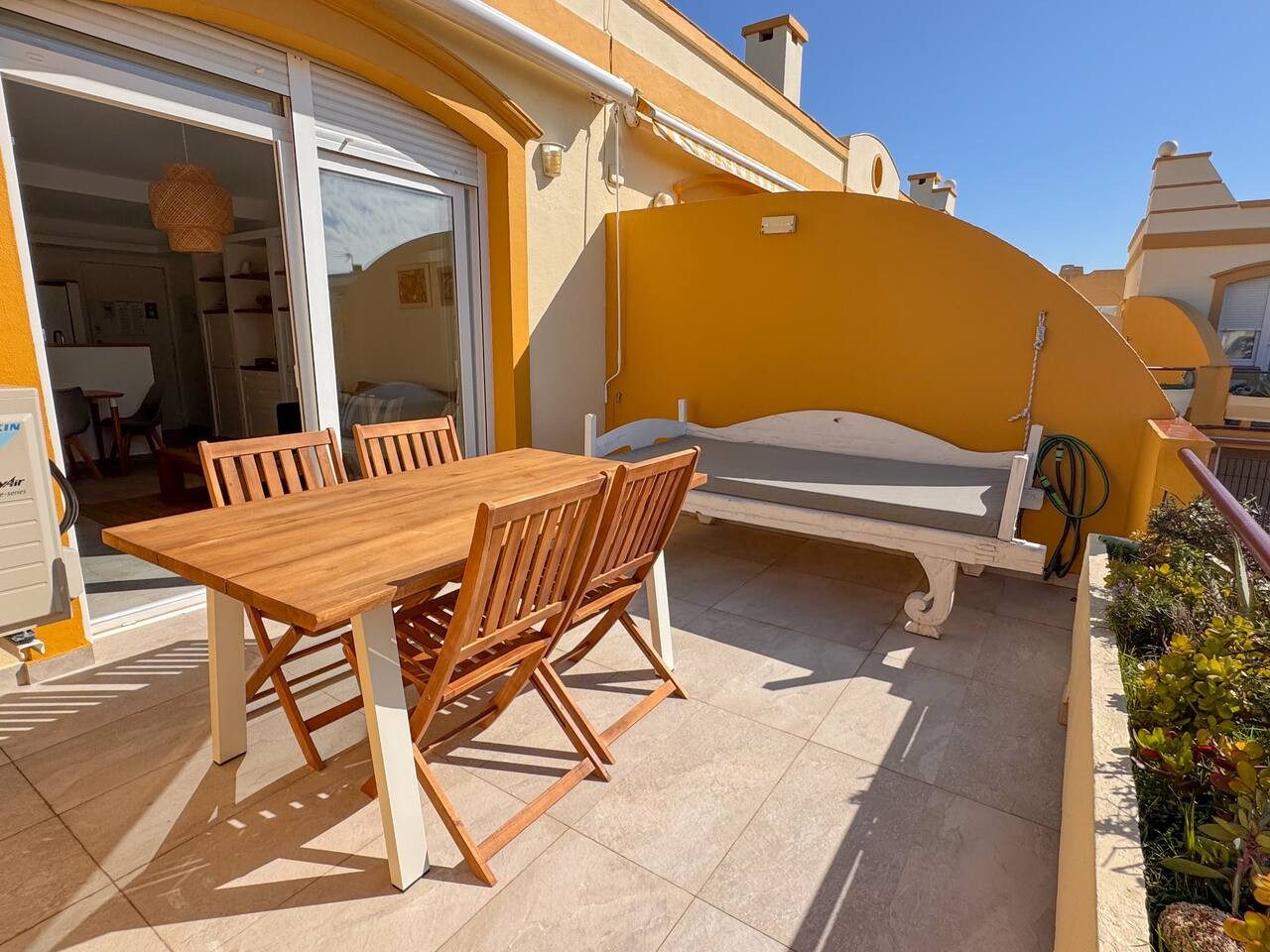 Desde el salón se accede a la terraza, la auténtica joya de la casa. Equipada con mobiliario exterior y mesa al aire libre, es el lugar perfecto para disfrutar de una comida con vistas impresionantes o, para los amantes del kitesurf, para observar en todo momento las condiciones. Sin importar la hora del día, estas vistas son mágicas.