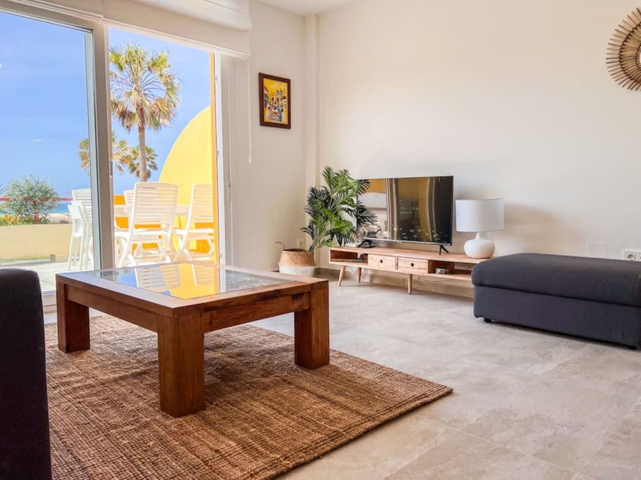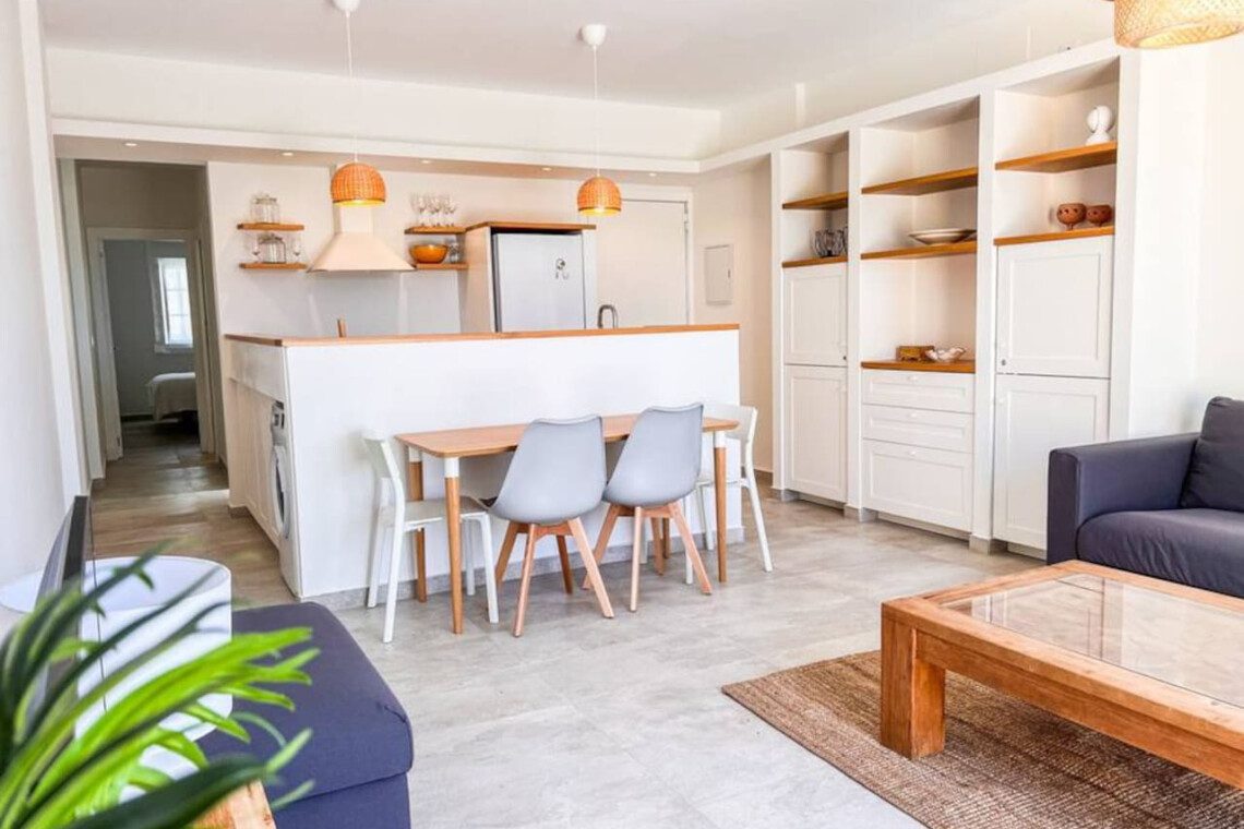 El apartamento se encuentra en una primera planta y ofrece una distribución cómoda y funcional en un único nivel. Tiene su entrada independiente y se accede a él a través de un tramo de escaleras desde la calle. Al entrar, nos recibe un salón-comedor integrado con la cocina abierta, una mesa para cuatro personas y un sofá con mesa baja, junto a una Smart TV para disfrutar de tus series favoritas.