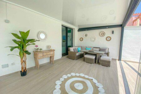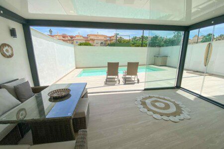 El porche de la terraza es un lugar súper acogedor, tranquilo y con acceso a una piscina totalmente privada de la que disfrutar en los calurosos días de verano. Está totalmente amueblado para exprimir bien las vacaciones.
