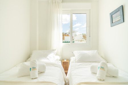 Este apartamento de una sola planta ha sido diseñado con esmero para brindar comodidad y amplitud. Cuenta con dos dormitorios equipados con camas de 180 cm y dos camas de 90 cm, y armarios empotrados para tu conveniencia. El baño moderno dispone de una amplia ducha. La luminosa sala de estar integra una cocina totalmente equipada con electrodomésticos modernos, una mesa de comedor para cuatro personas y un cómodo sofá de 3 plazas. Además, podrás disfrutar de una Smart TV y conexión de fibra óptica de alta velocidad para tu entretenimiento. La joya del apartamento es su terraza, orientada al suroeste, que ofrece vistas espectaculares de toda la playa y la duna de Punta Paloma, convirtiéndola en el lugar ideal para disfrutar de un café matutino o una copa al famoso atardecer de Tarifa.