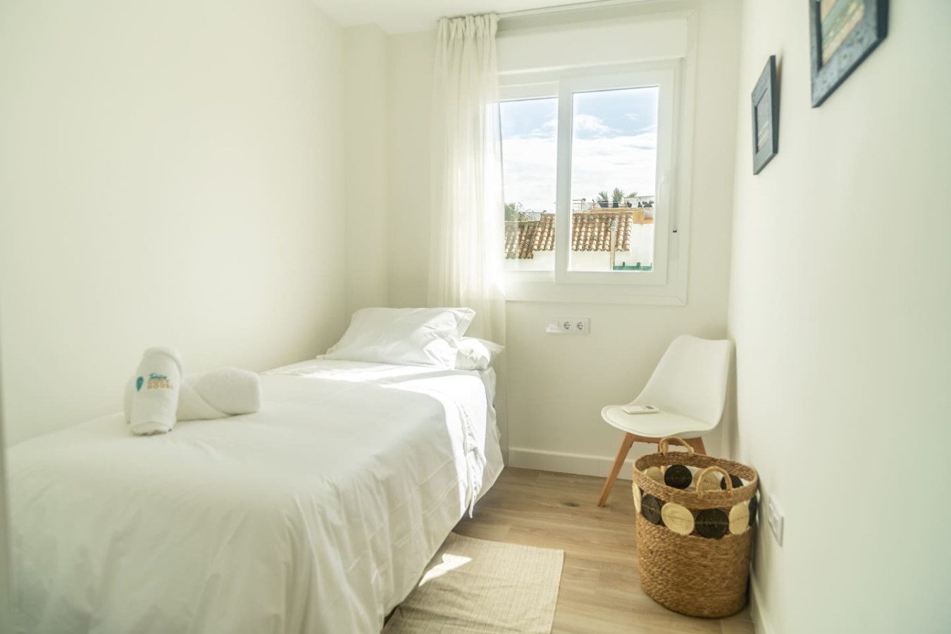 El apartamento se encuentra en una segunda planta y se accede mediante un tramo de escaleras. Se distribuye en una sola planta y ha sido diseñado con esmero para ofrecer una estancia cómoda, funcional y acogedora. Dispone de dos dormitorios: uno con cama de matrimonio de 180 cm y otro con dos camas individuales de 90 cm, ambos con armarios empotrados, además de un baño completo con plato de ducha.
