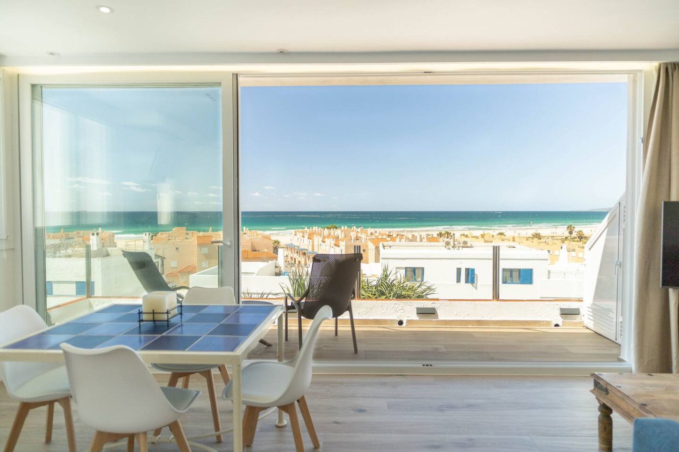 La terraza, orientada al suroeste y a espaldas del levante, está equipada con dos sillones y es el lugar perfecto para tomar un café por la mañana o una cerveza mientras disfrutas de las increíbles puestas de sol sobre el océano Atlántico y la playa de Los Lances. A cualquier hora del día, las vistas son simplemente mágicas.