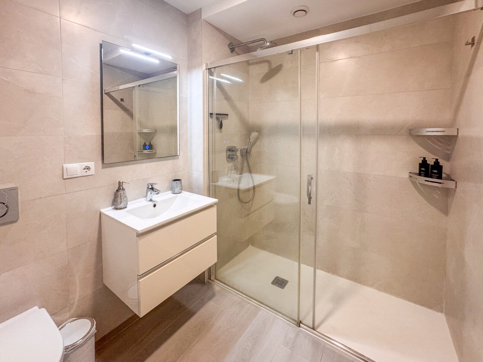 El apartamento, en una sola planta, destaca por su diseño funcional y espacios amplios y luminosos. Al entrar, encontrarás un cuarto con lavadora y secadora y, a continuación, un salón-cocina con isla, sofá con chaise longue, smart TV, mesa de comedor y acceso directo a la gran terraza con 2 tumbonas.