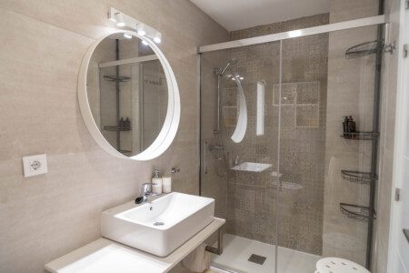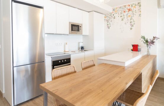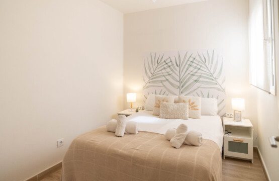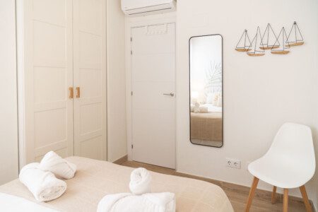 El apartamento se distribuye en una única planta. Al entrar, un pasillo conduce al primer dormitorio, equipado con una cama de 140 cm y armario empotrado. A continuación se encuentra el baño con plato de ducha y, luego, el dormitorio principal, con cama de 160 cm y su propio armario. Todas las estancias cuentan con aire acondicionado de frío y calor.