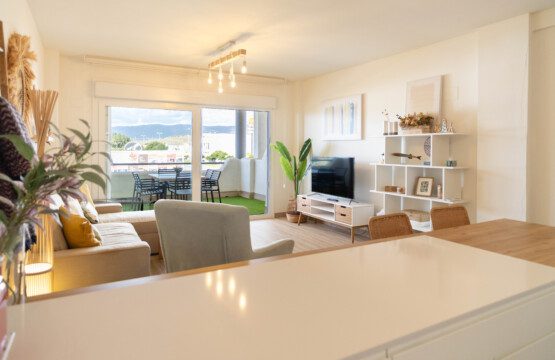 Al final del pasillo se abre el salón-comedor, con mesa para los días de invierno y Smart TV para disfrutar de tus series favoritas. La cocina, integrada y totalmente equipada, ofrece todo lo necesario para cocinar cómodamente en casa. Desde esta zona se accede a la terraza, con césped artificial, mobiliario exterior y una mesa ideal para comer al aire libre.
