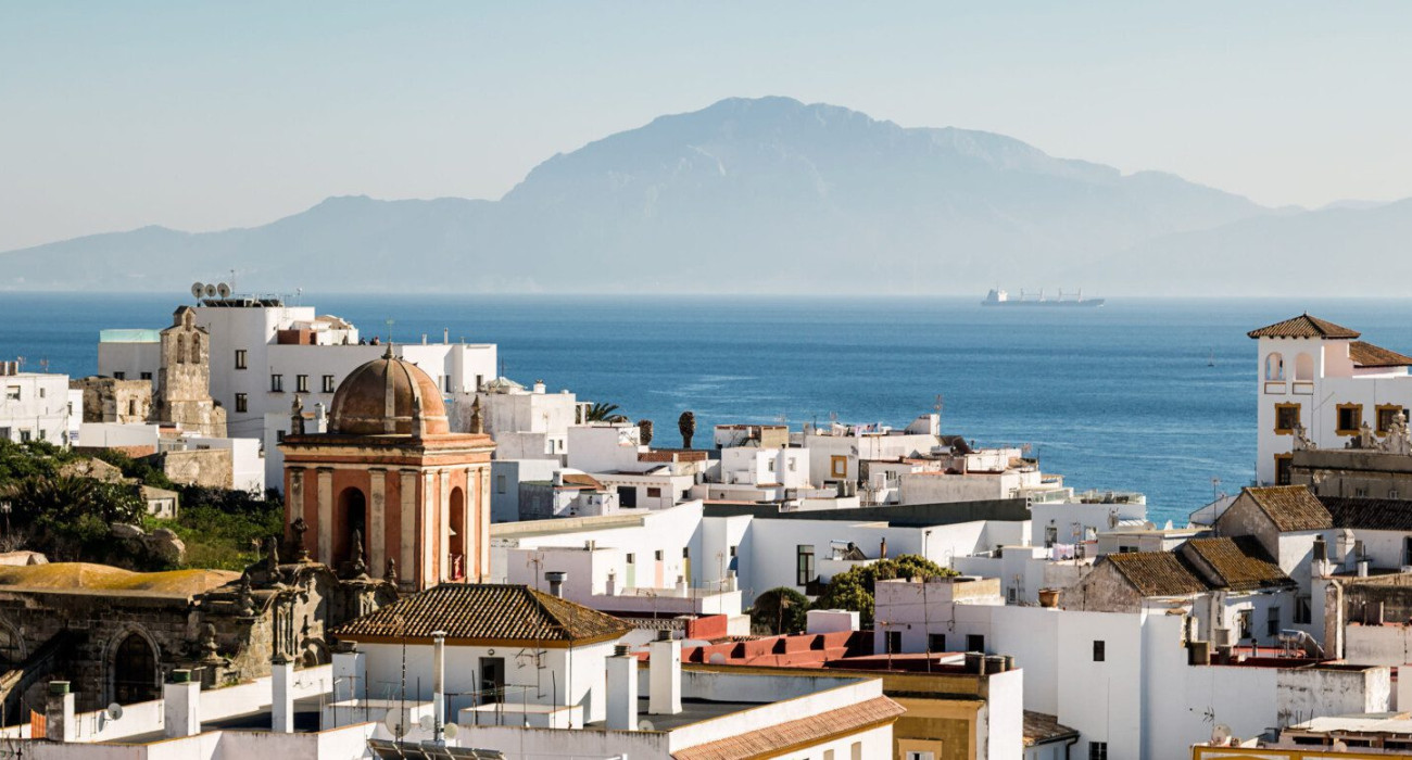 El casco antiguo de Tarifa con sus calles blancas y vistas impresionantes del Monte Musa en Marruecos.